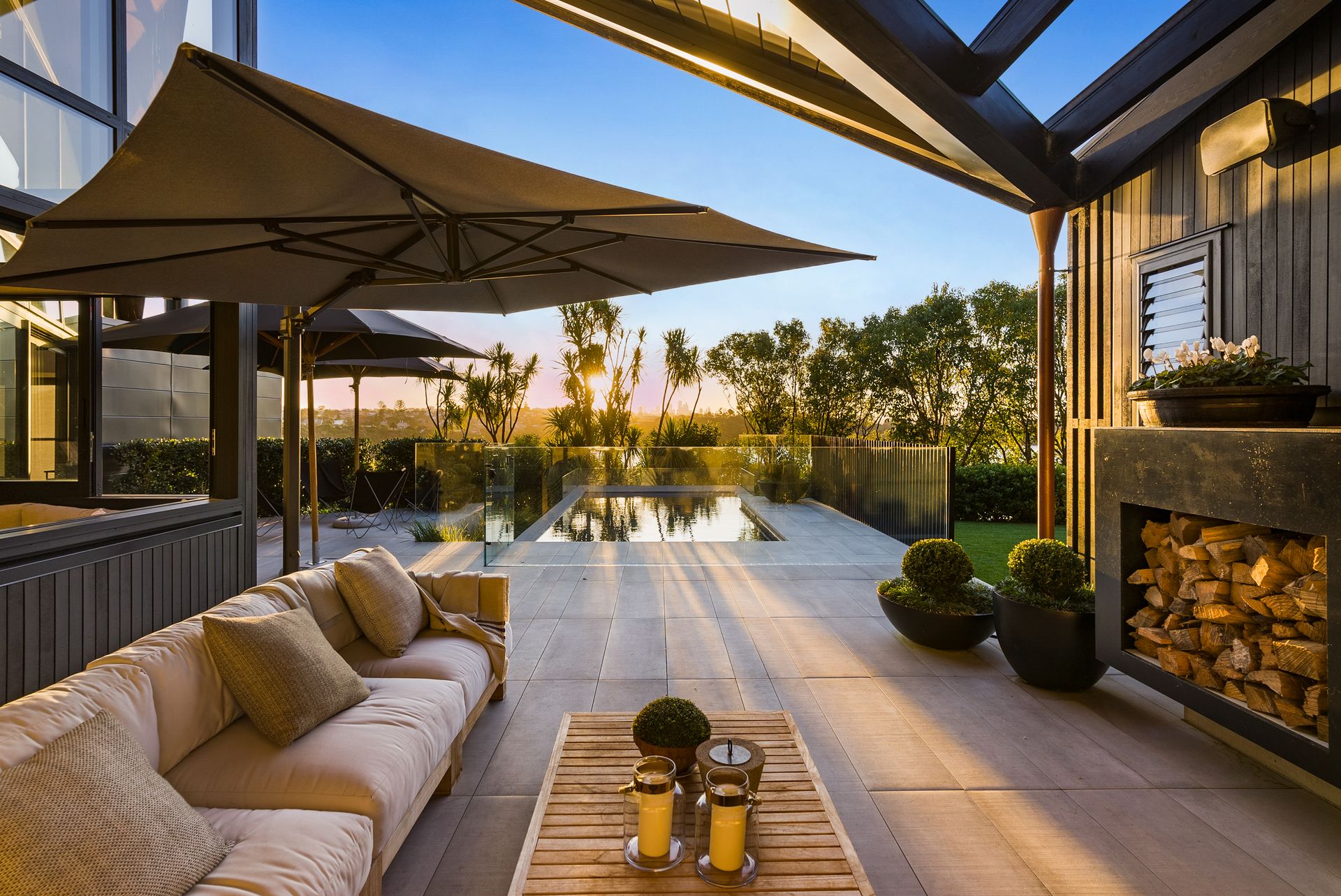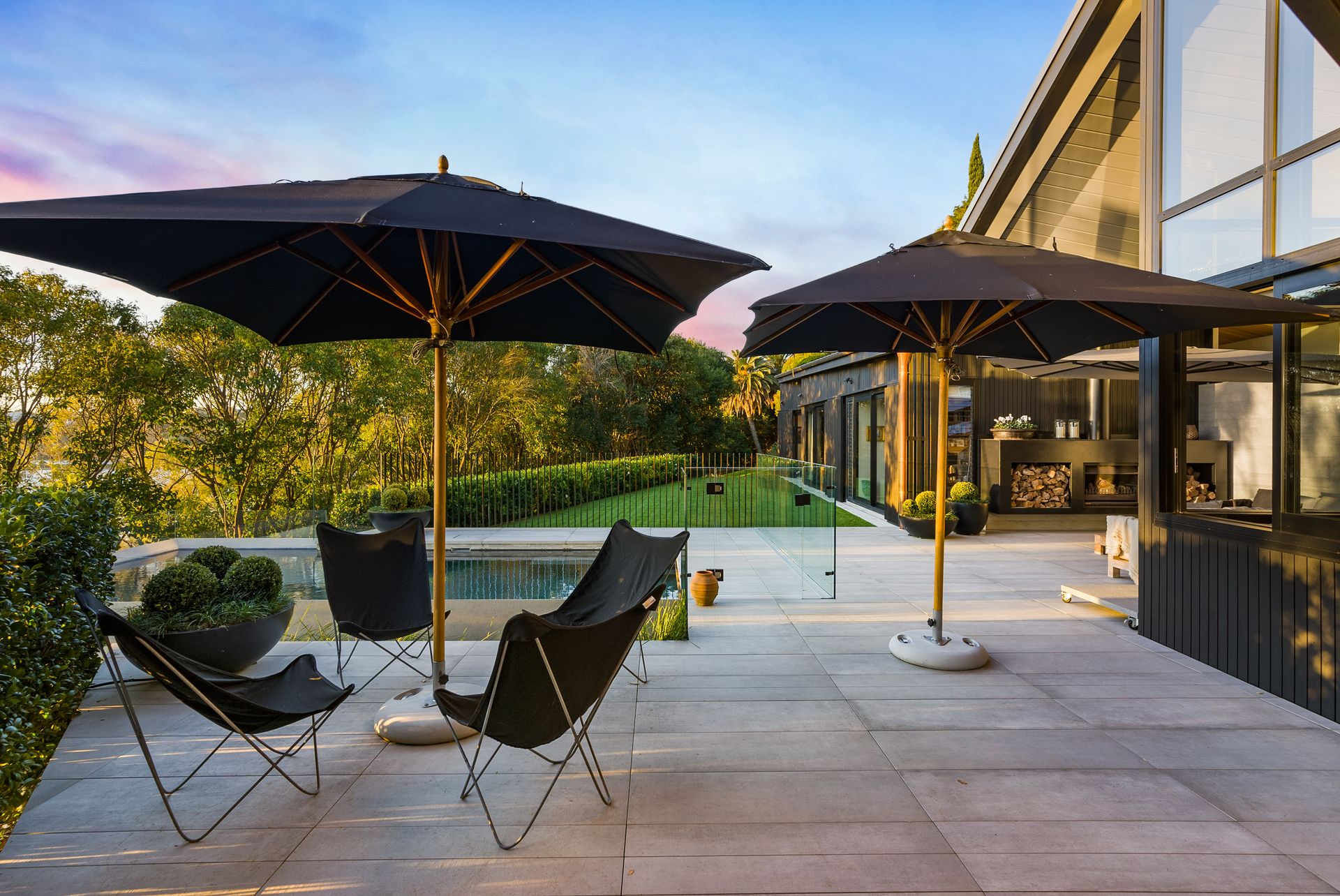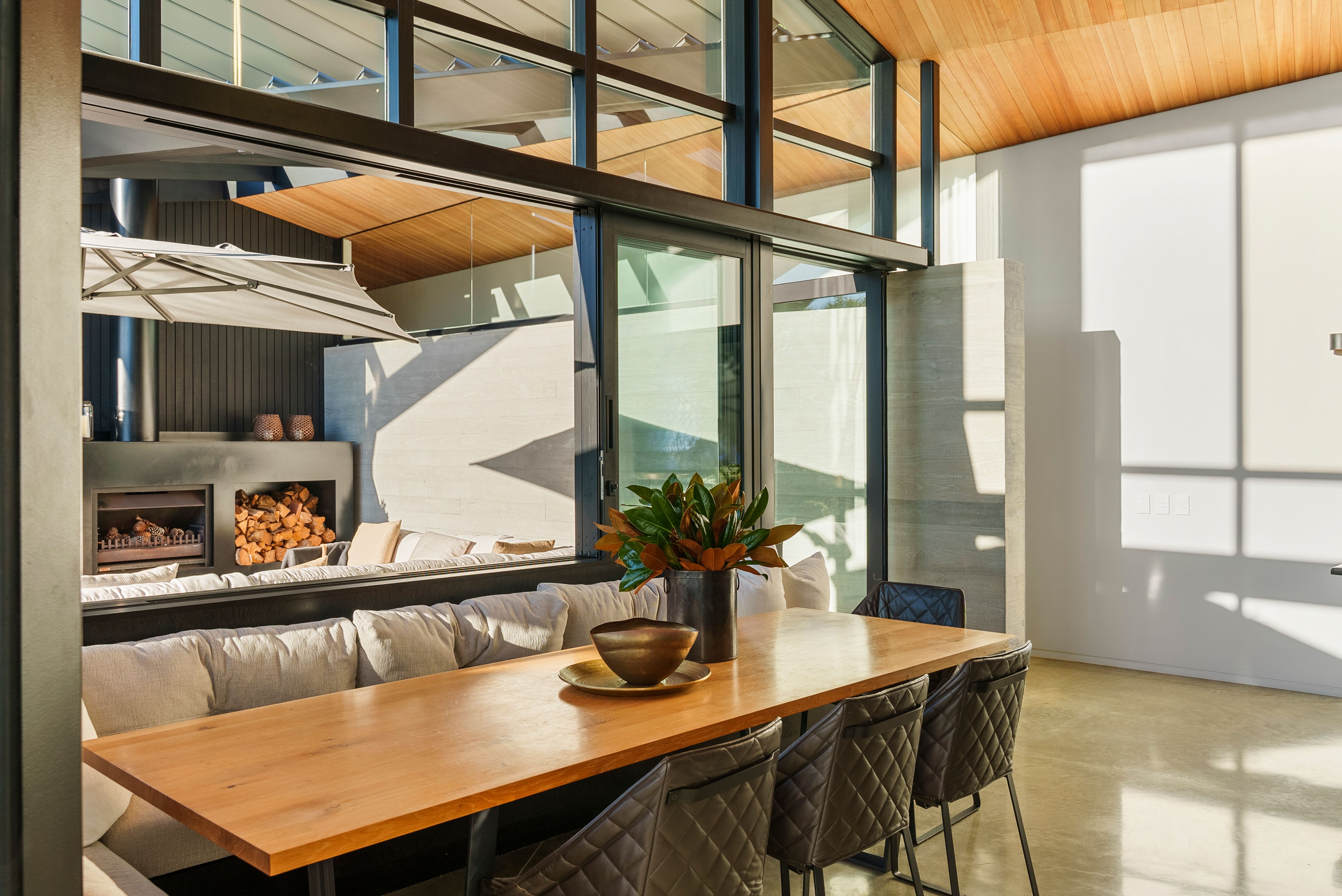 The 401sqm home's masterpiece design, a winner of the NZIA Award, celebrates form, geometry & quality of materials. It delivers them with warmth & ease against nature's backdrop, capturing light & sun. Entertain effervescently, with a bespoke kitchen-scullery with Gaggenau appliances, plus three living areas, flowing out to a swathe of private and level outdoor living areas. Choose from the loggia with Louvretech roof - perfect for long, relaxed summer evenings or delicious winter warmth beside its crackling fireplace, or the heated pool admiring the basin & substantial lawn. Rather than slicing into the view with a deck, architect Wendy Shacklock enabled the lounge adjoining the kitchen to feel open-air via a bank of automated sash windows. High, raked ceilings lined with a blanket of golden ash and gorgeous polished concrete floors warmed by underfloor heating continue in the living-dining room.