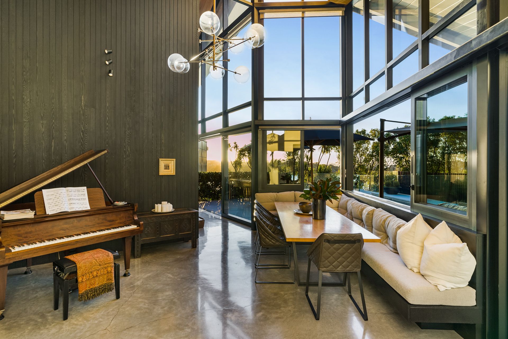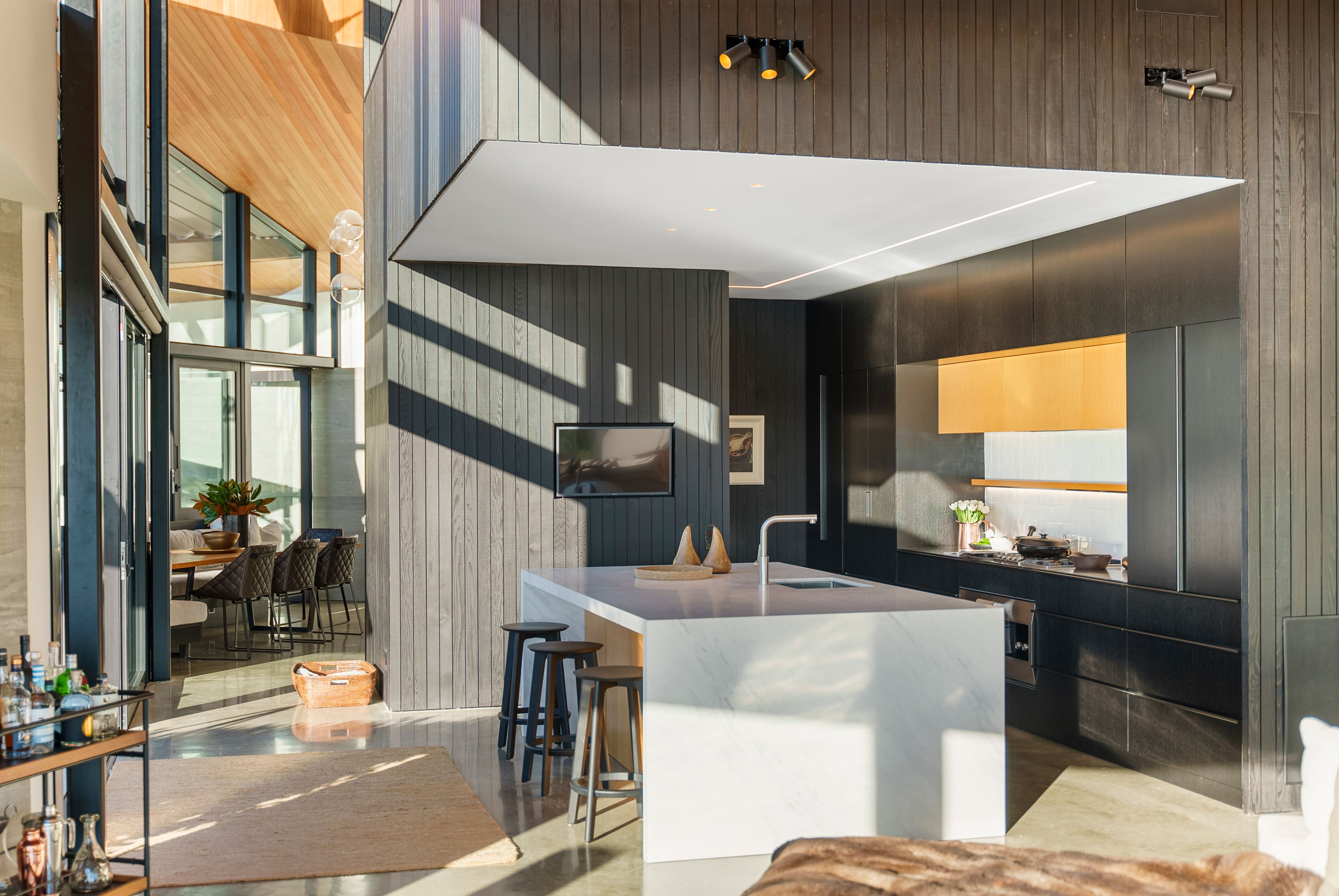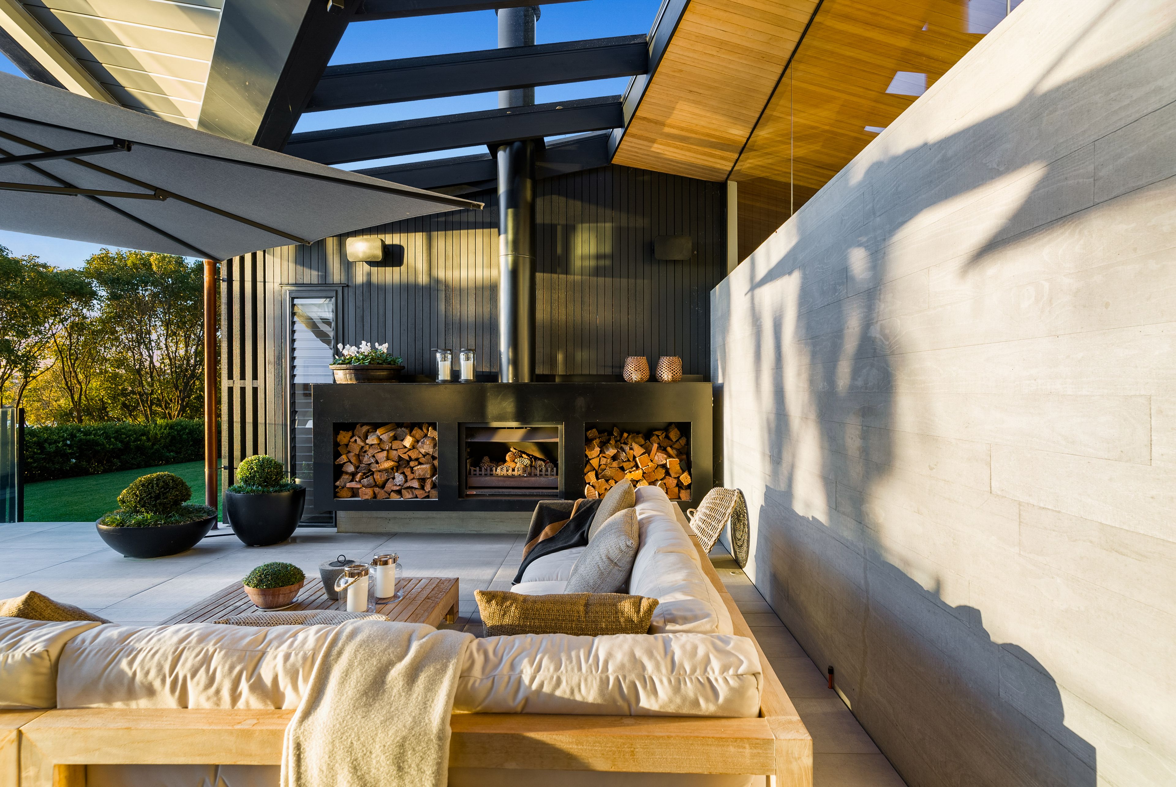 The 401sqm home's masterpiece design, a winner of the NZIA Award, celebrates form, geometry & quality of materials. It delivers them with warmth & ease against nature's backdrop, capturing light & sun. Entertain effervescently, with a bespoke kitchen-scullery with Gaggenau appliances, plus three living areas, flowing out to a swathe of private and level outdoor living areas. Choose from the loggia with Louvretech roof - perfect for long, relaxed summer evenings or delicious winter warmth beside its crackling fireplace, or the heated pool admiring the basin & substantial lawn. Rather than slicing into the view with a deck, architect Wendy Shacklock enabled the lounge adjoining the kitchen to feel open-air via a bank of automated sash windows. High, raked ceilings lined with a blanket of golden ash and gorgeous polished concrete floors warmed by underfloor heating continue in the living-dining room.