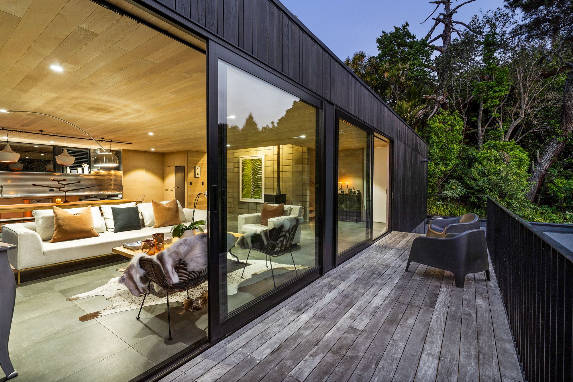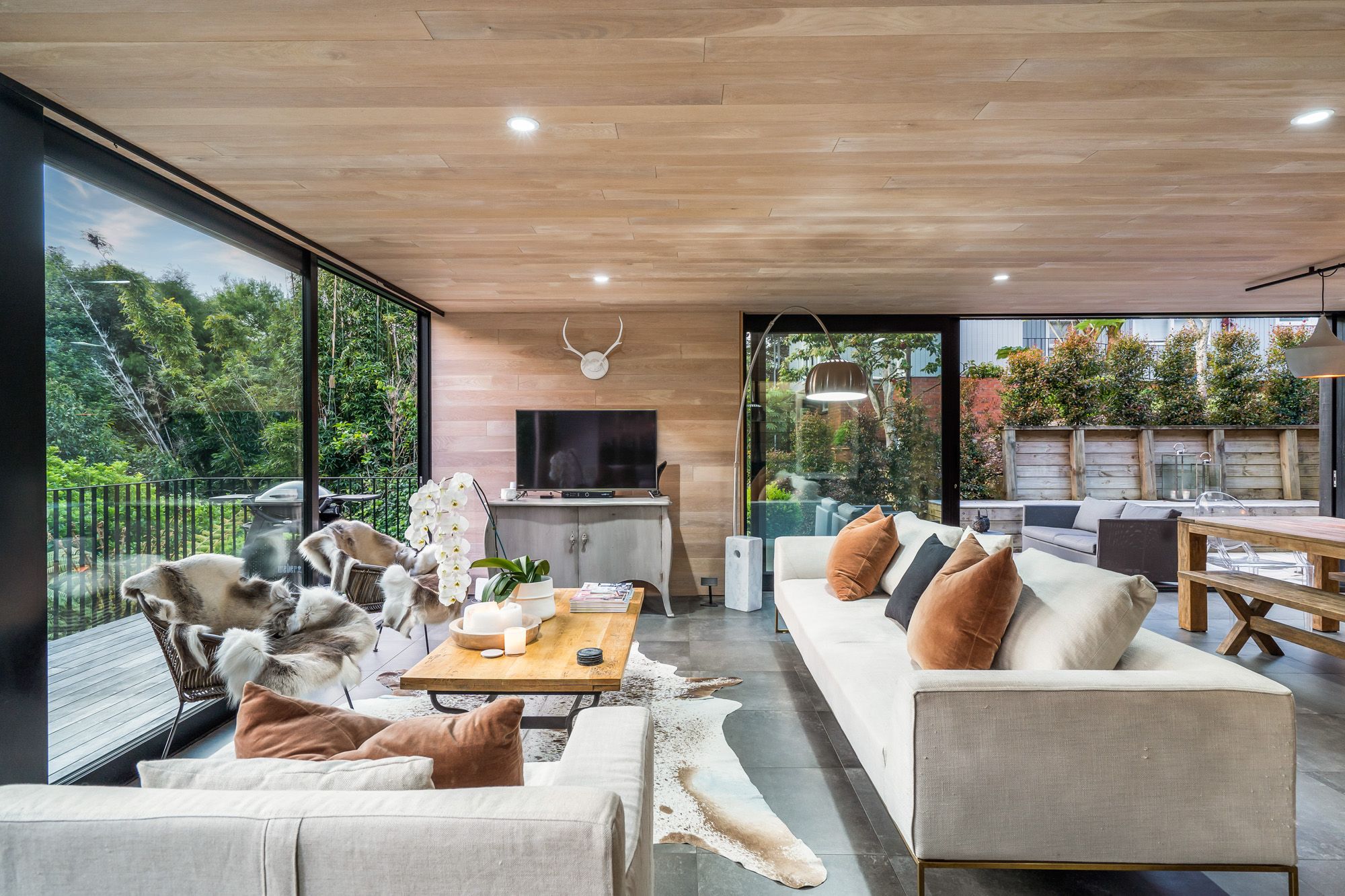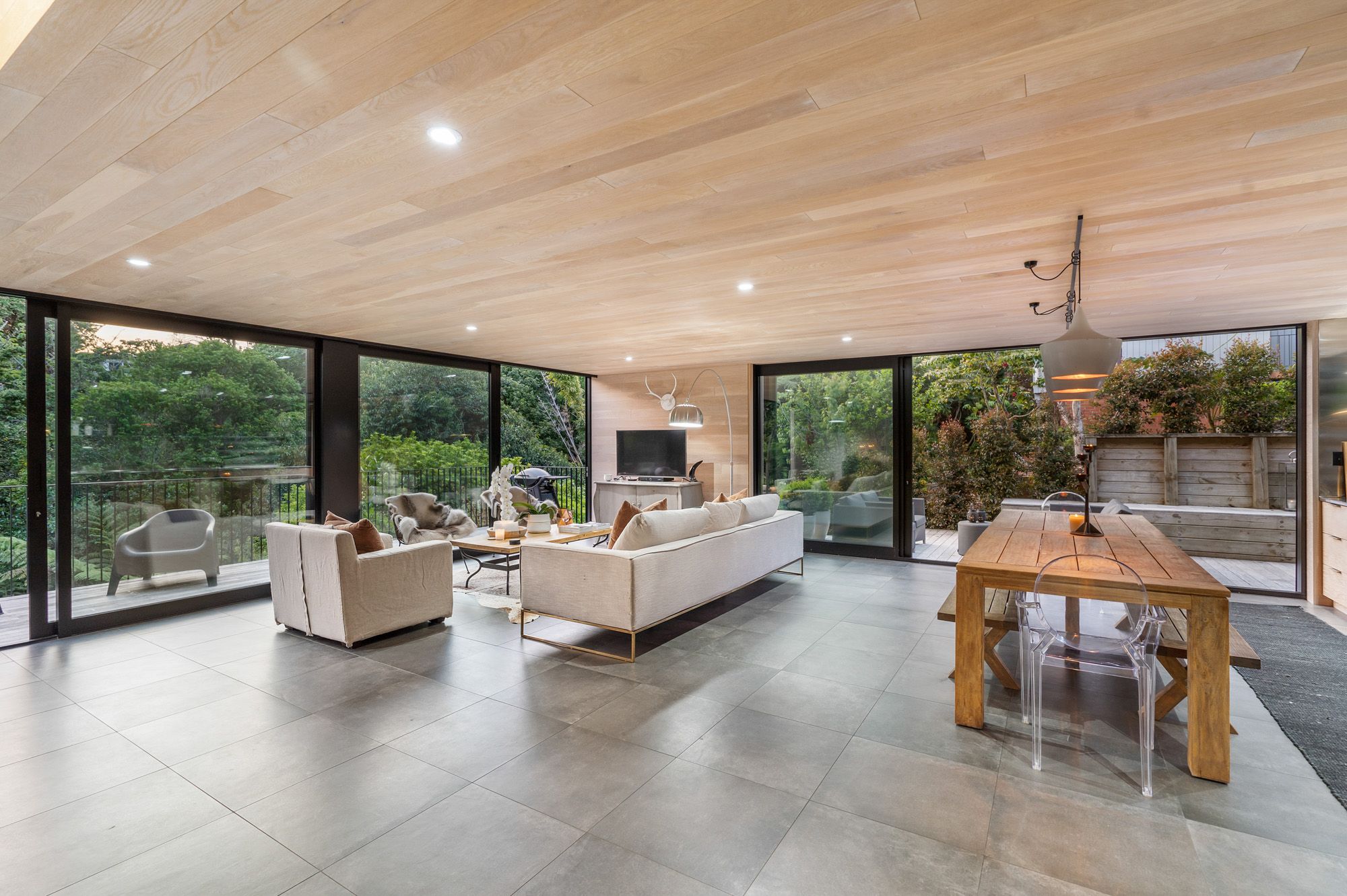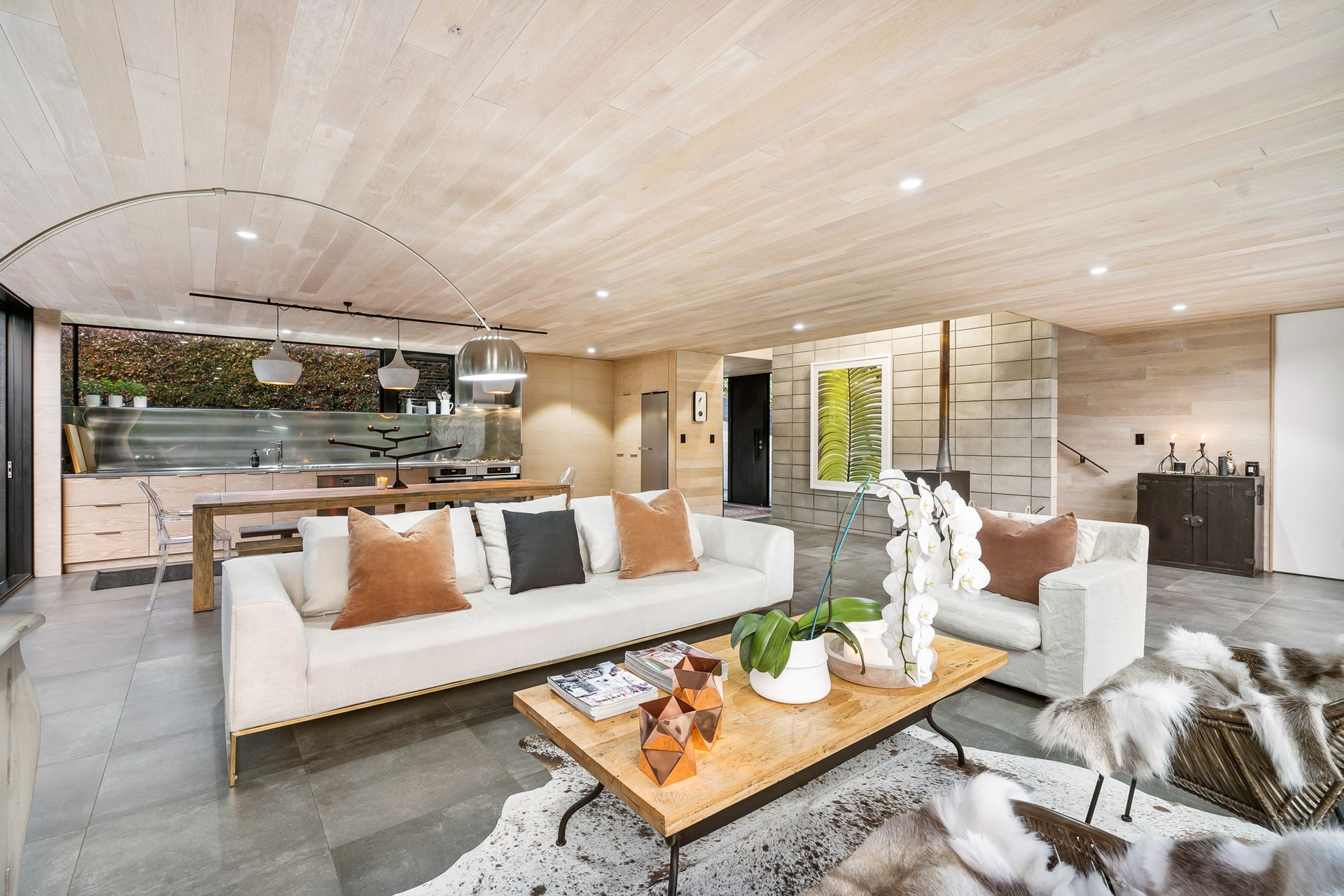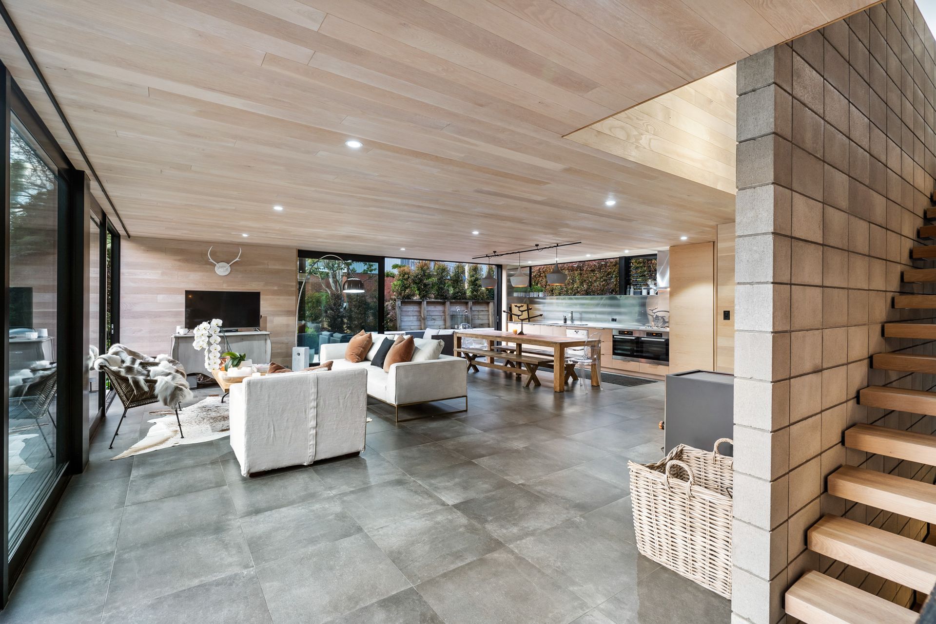 Sculpturally composed spaces with details at every turn are unified by harmonising authentic modern and organic elements with polished concrete floor, American oak influence, and floor to ceiling picturesque windows and doors.