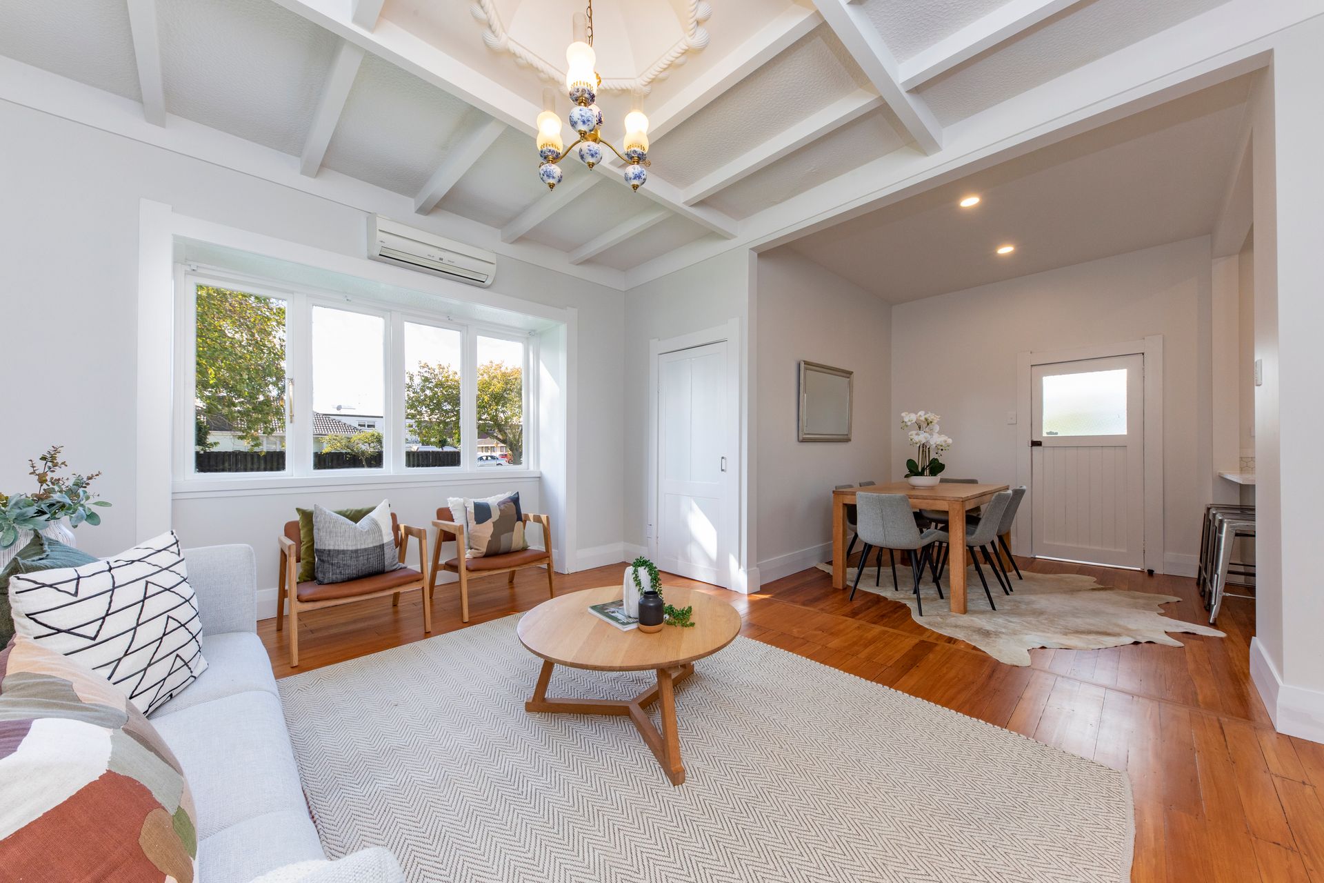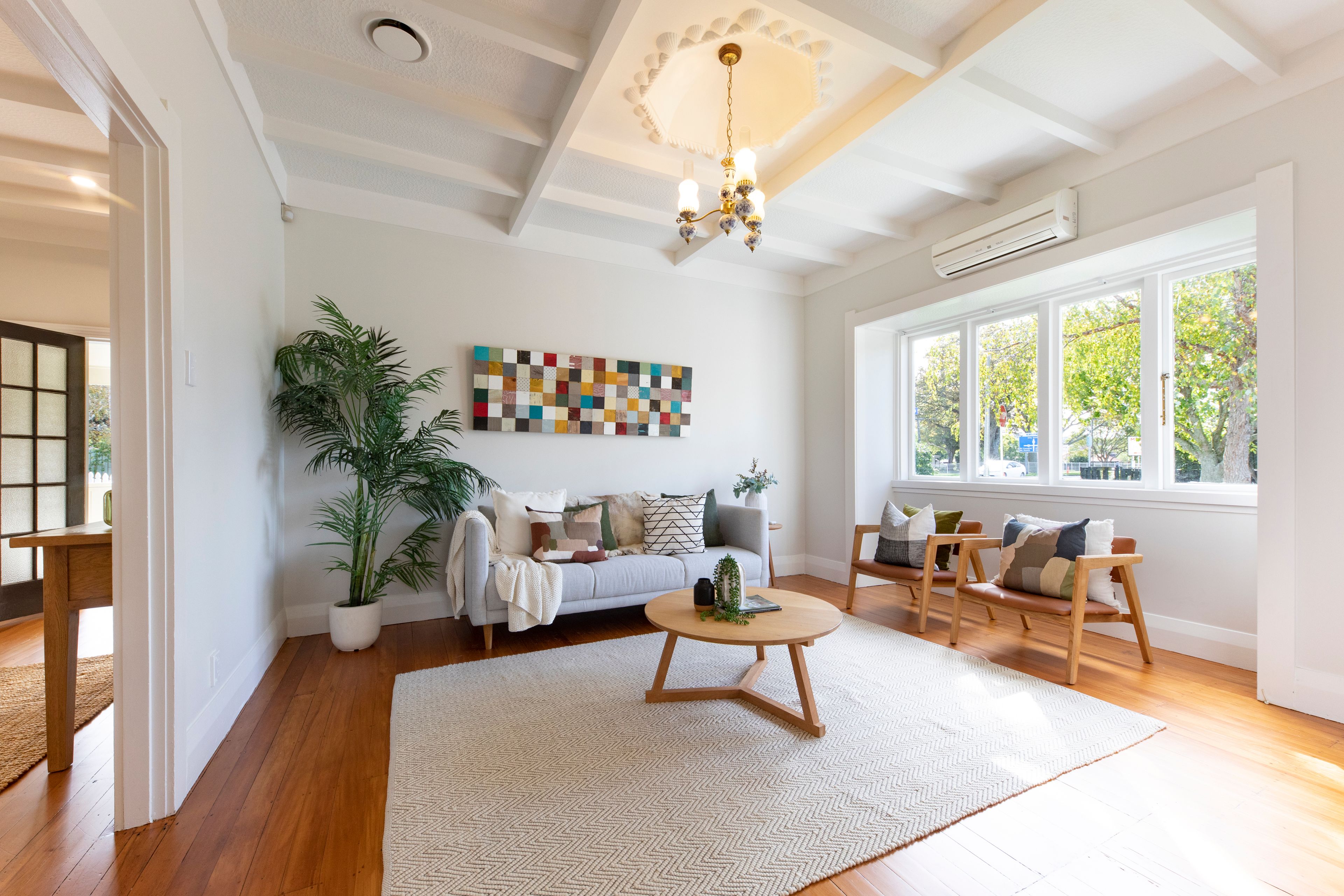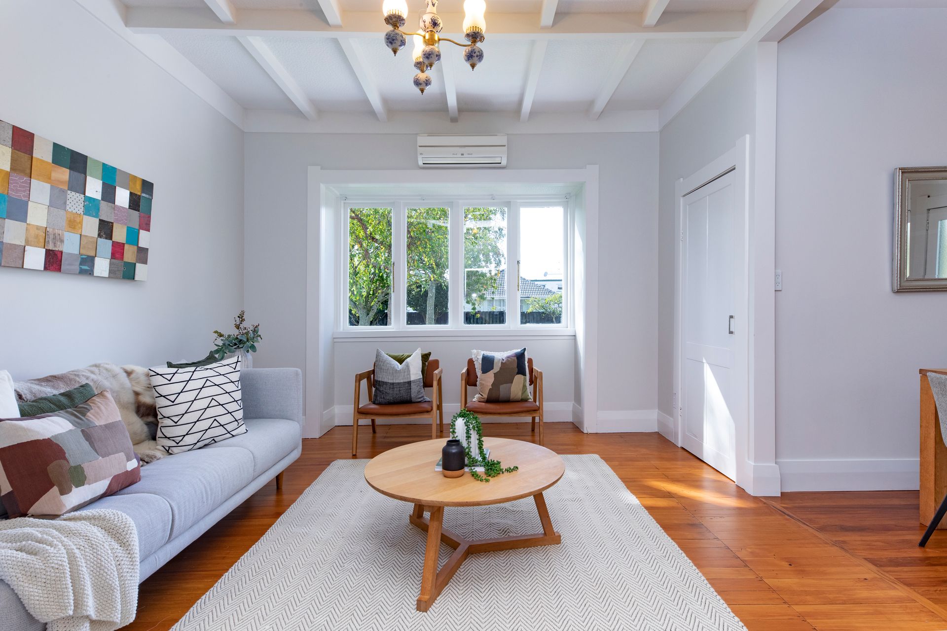 • North-facing living room with heat pump and bay window