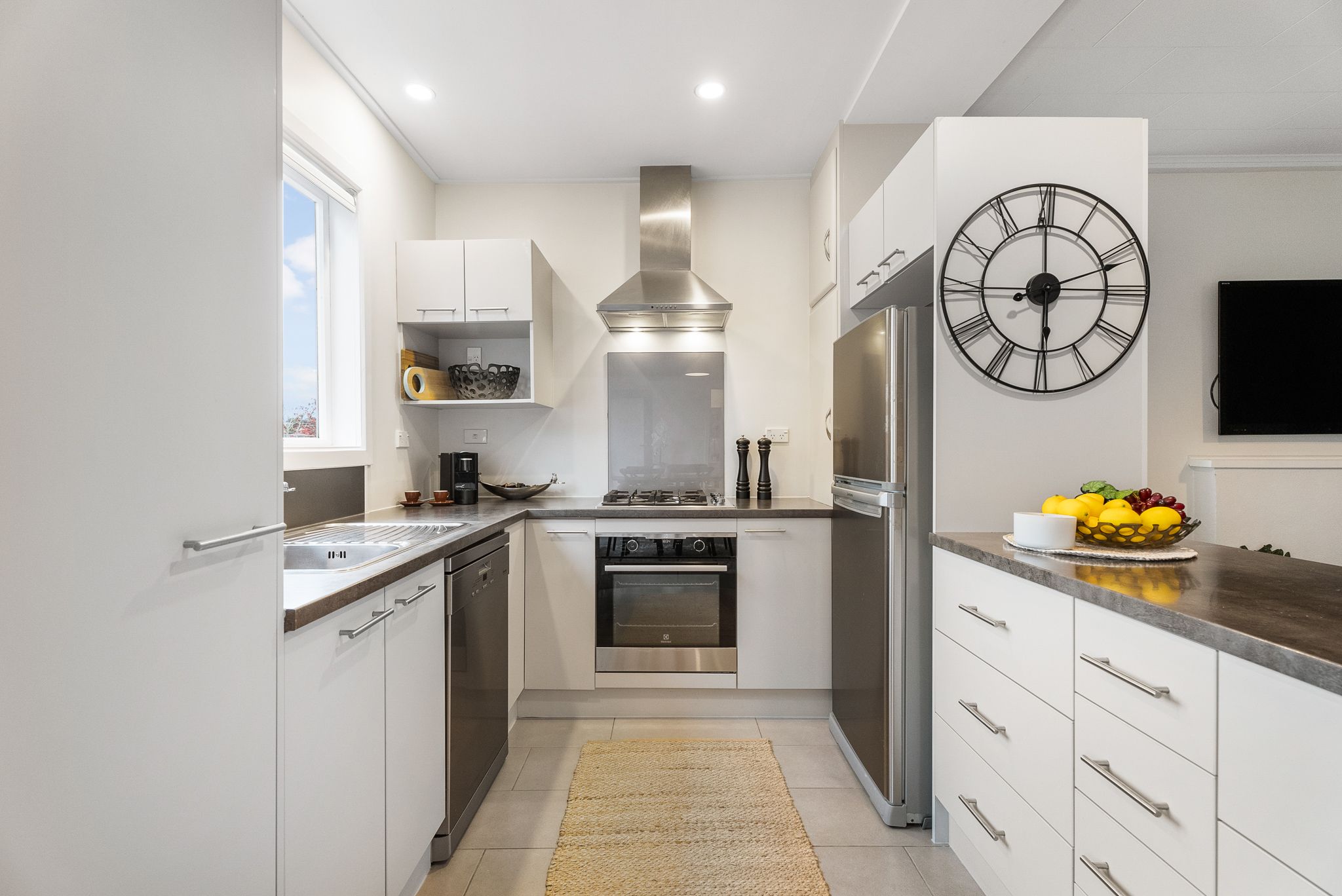 At its core is an open-plan kitchen, lounge and dining zone featuring classic cottage windows, which connect to the outdoors for a fluid living experience.