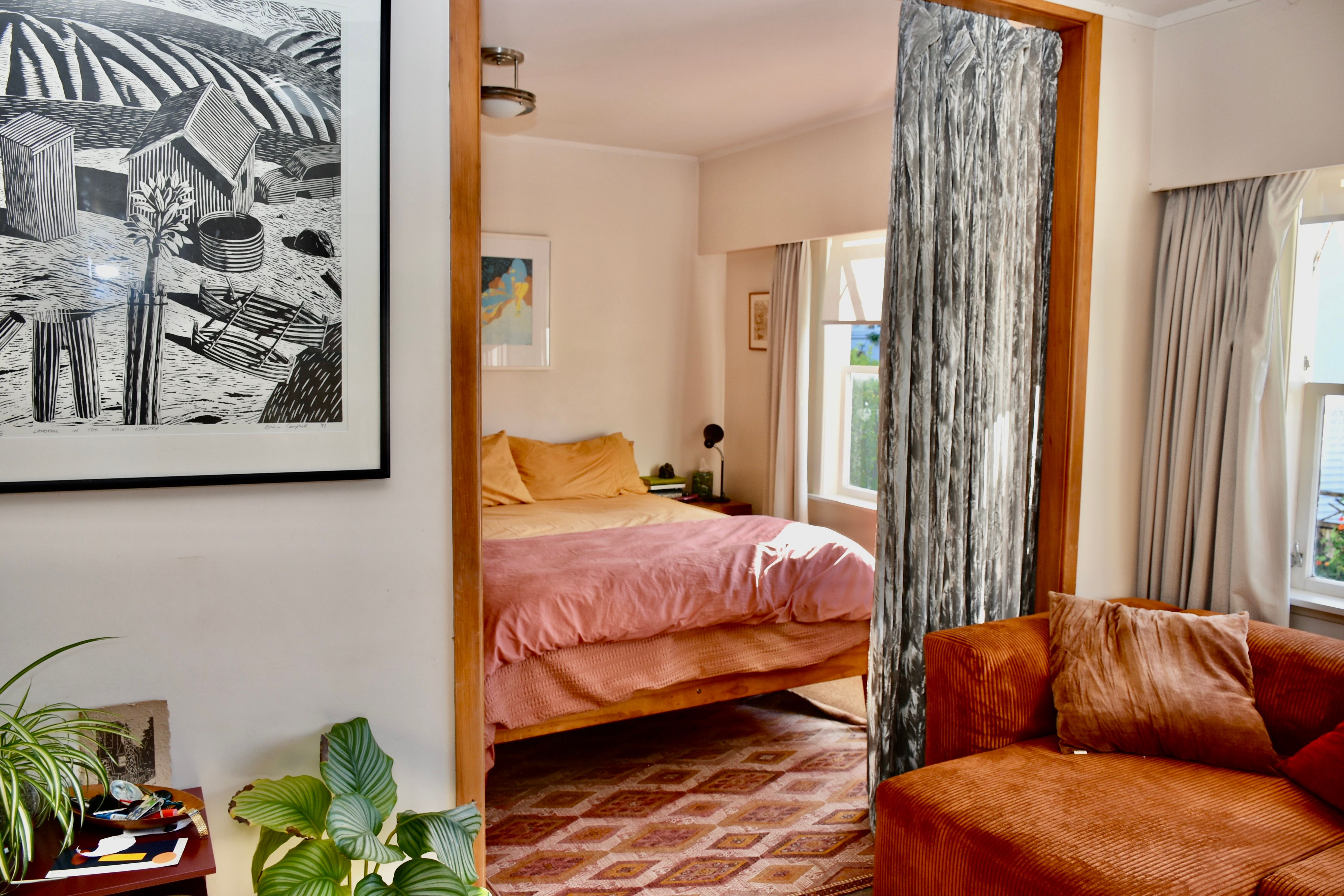 Curtained room can be used as a second bedroom as pictured or seperate dining/lounge, with ample storage.