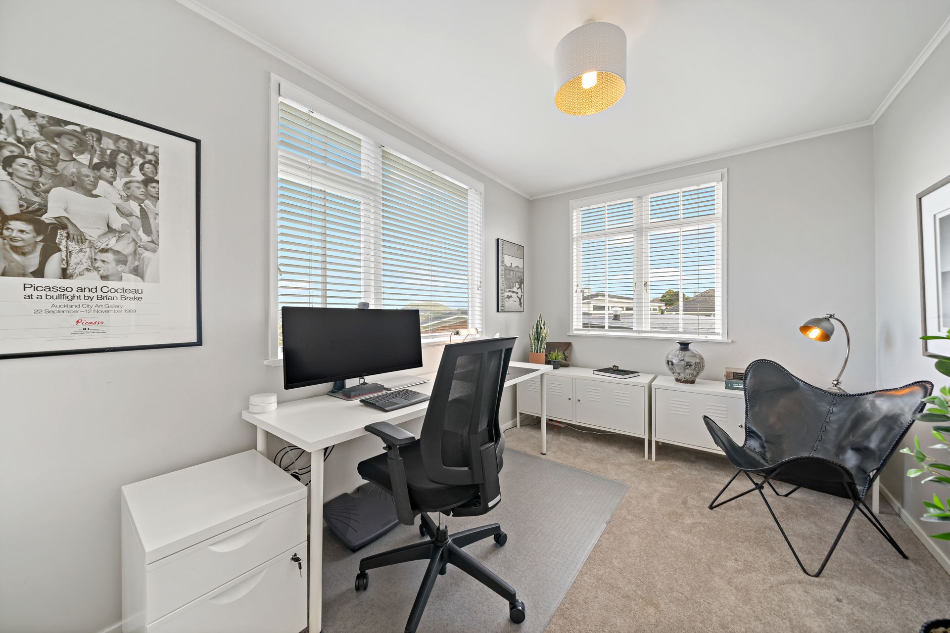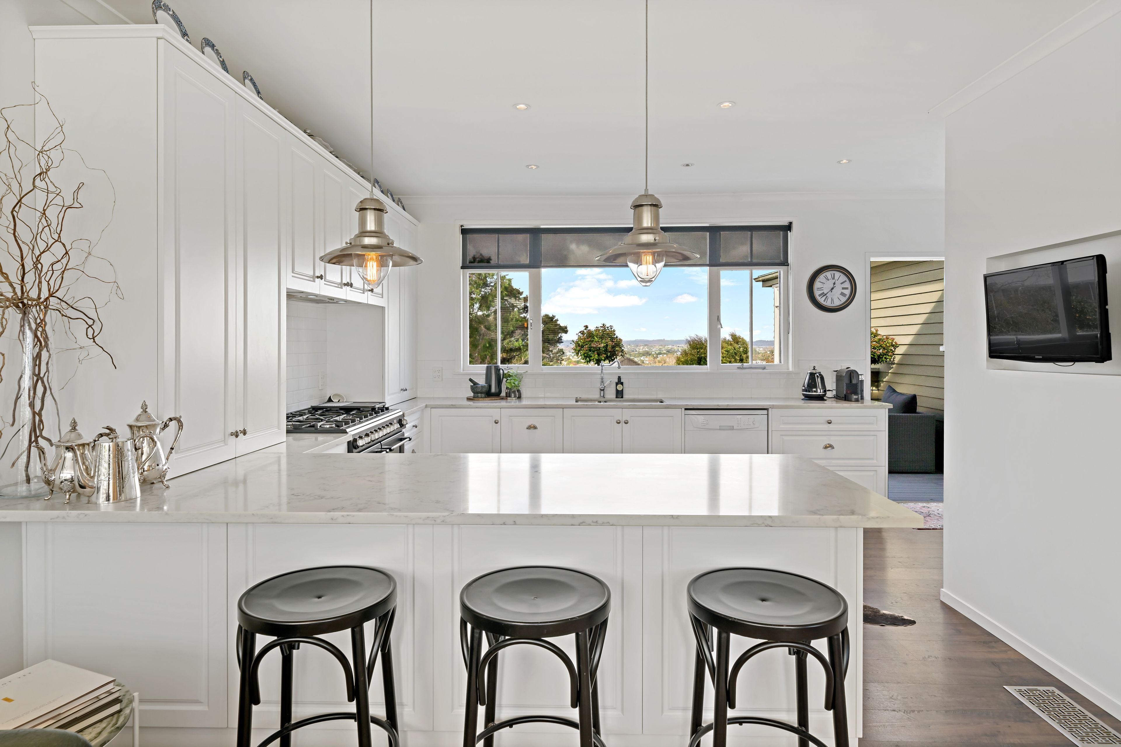 Light-filled monochrome interiors welcome you into the main level with views to Tamaki Estuary and beyond. Expansive and anchored by a fabulous designer kitchen with custom stone bench-tops it flows seamlessly through to the open plan dining area perfect for the entertainer. The choice of dedicated living areas also includes a formal lounge area complete with a wood fire to enjoy during the colder months. Three generous bedrooms, including the master with wardrobe, and a stylish family bathroom with a freestanding bath all sit on the top level of the home complemented by the Ducted Central Heating.