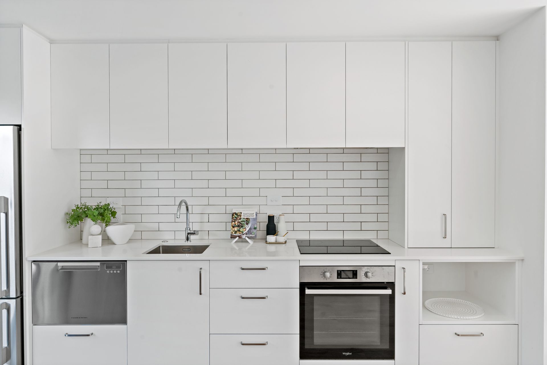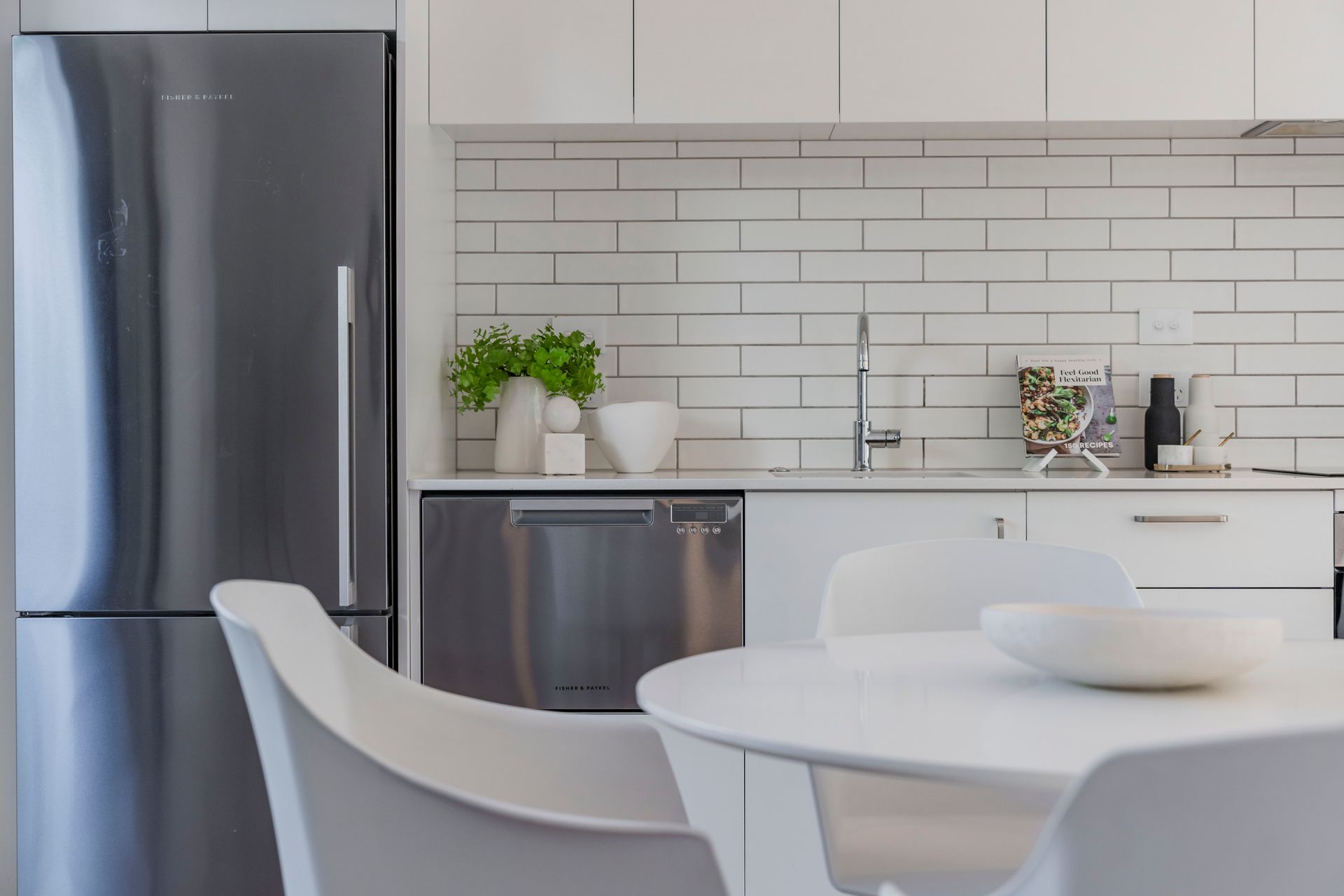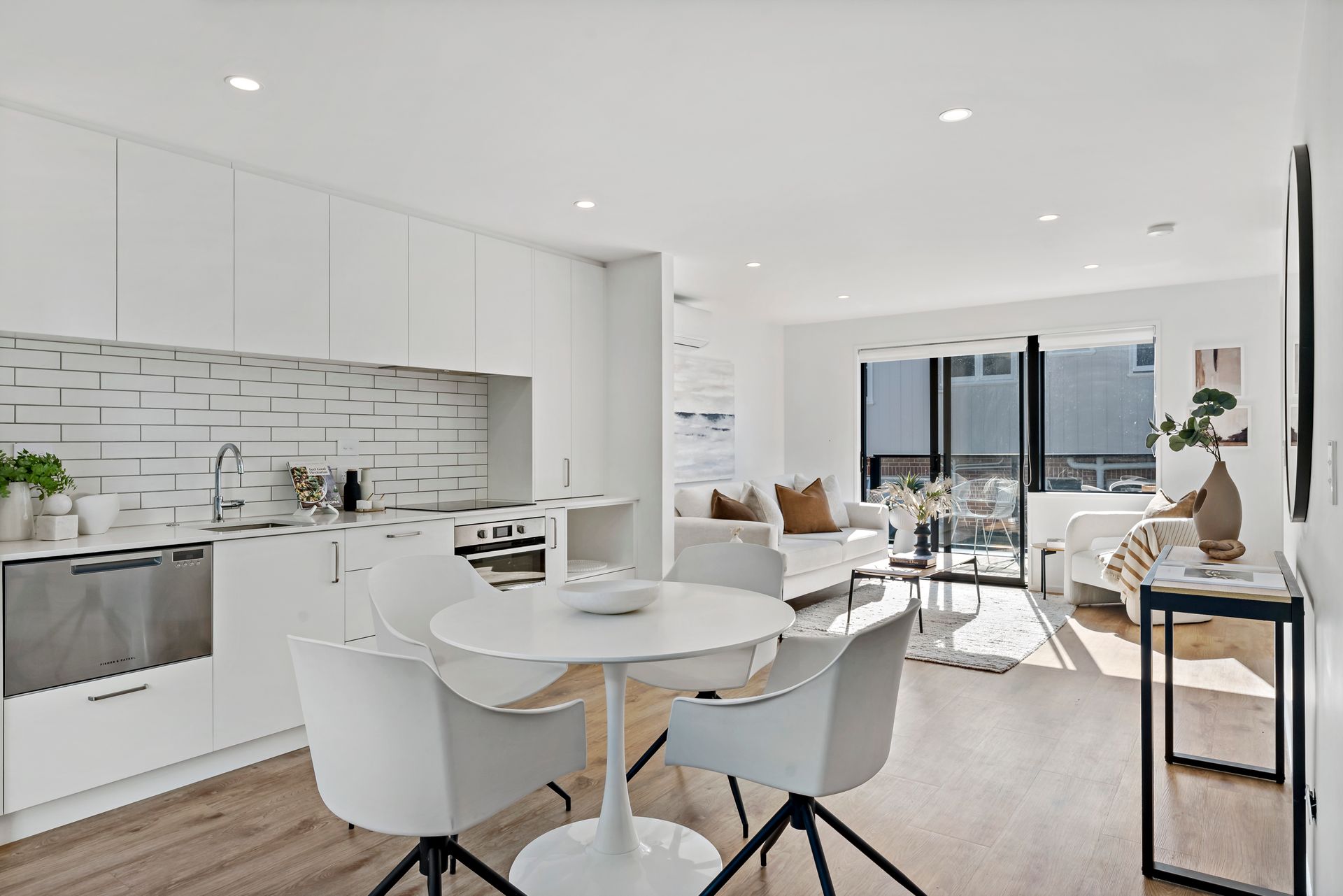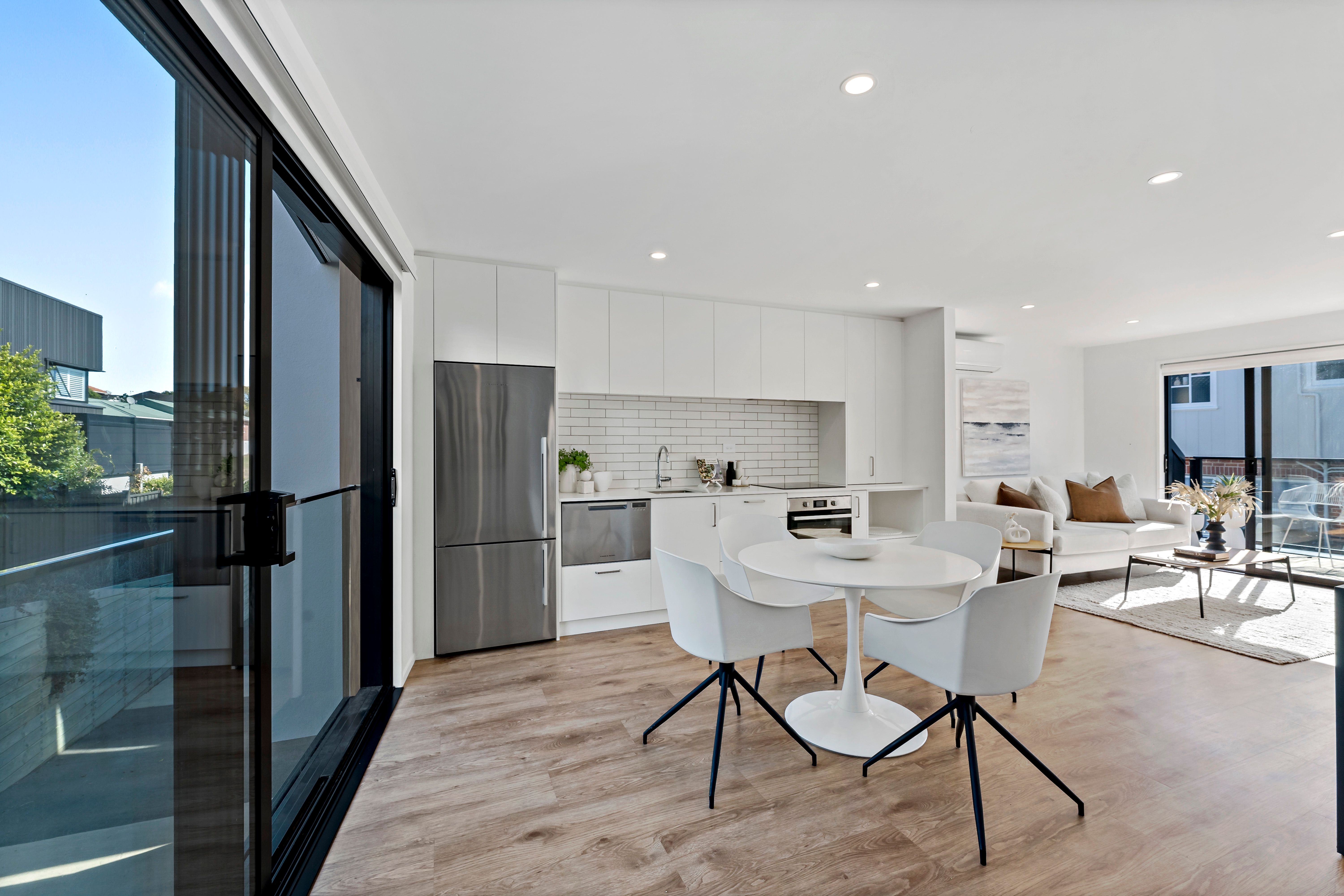 The first floor is dedicated to open-plan living, where timber flooring and crisp white walls create a relaxed, coastal ambiance. A spacious dining area flows seamlessly to a glass-balustraded deck, inviting fresh breezes and natural light, while a heat pump ensures year-round comfort. The sleek galley-style kitchen, fitted with premium Fisher & Paykel stainless steel appliances and ample storage, is perfect for both everyday meals and entertaining.