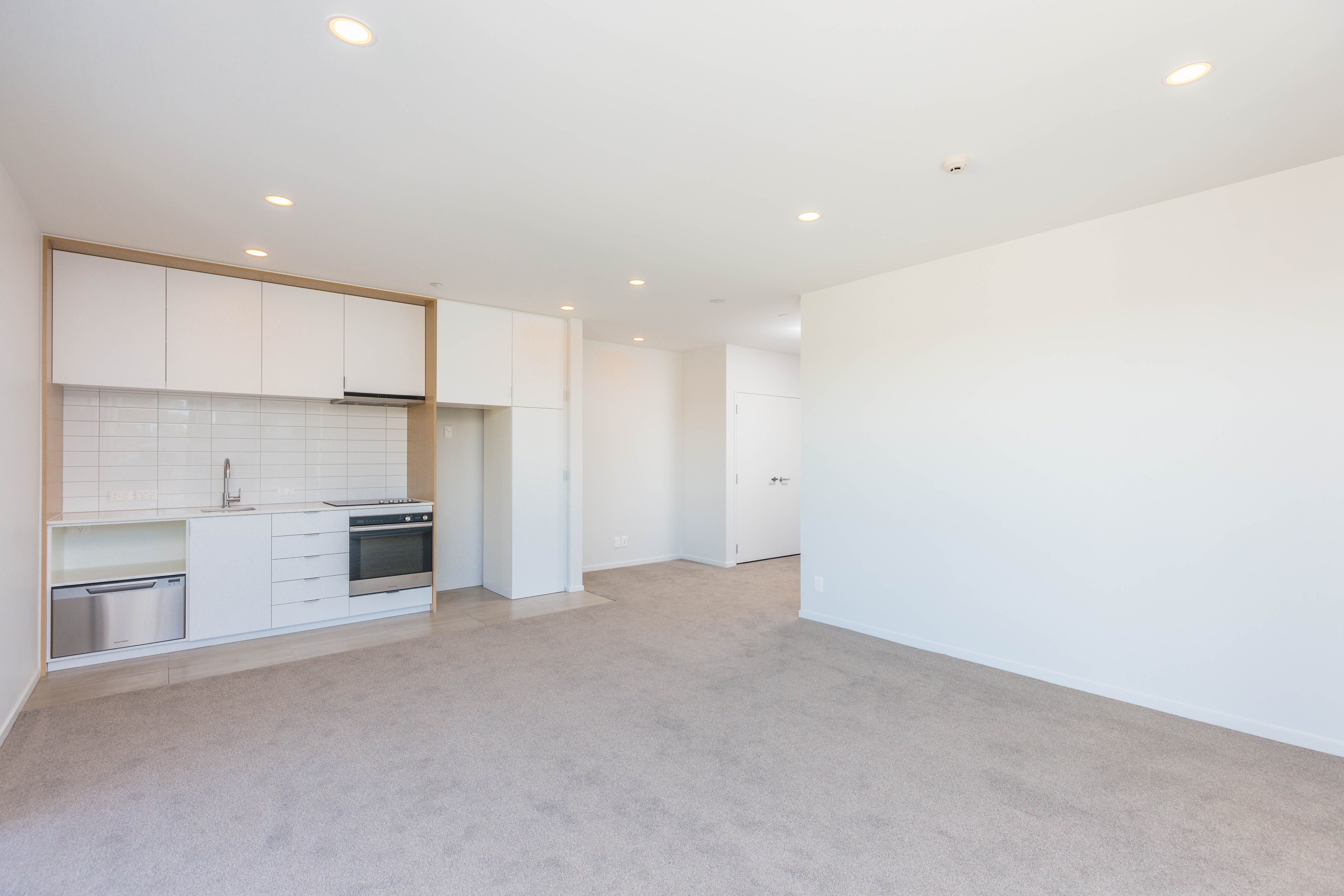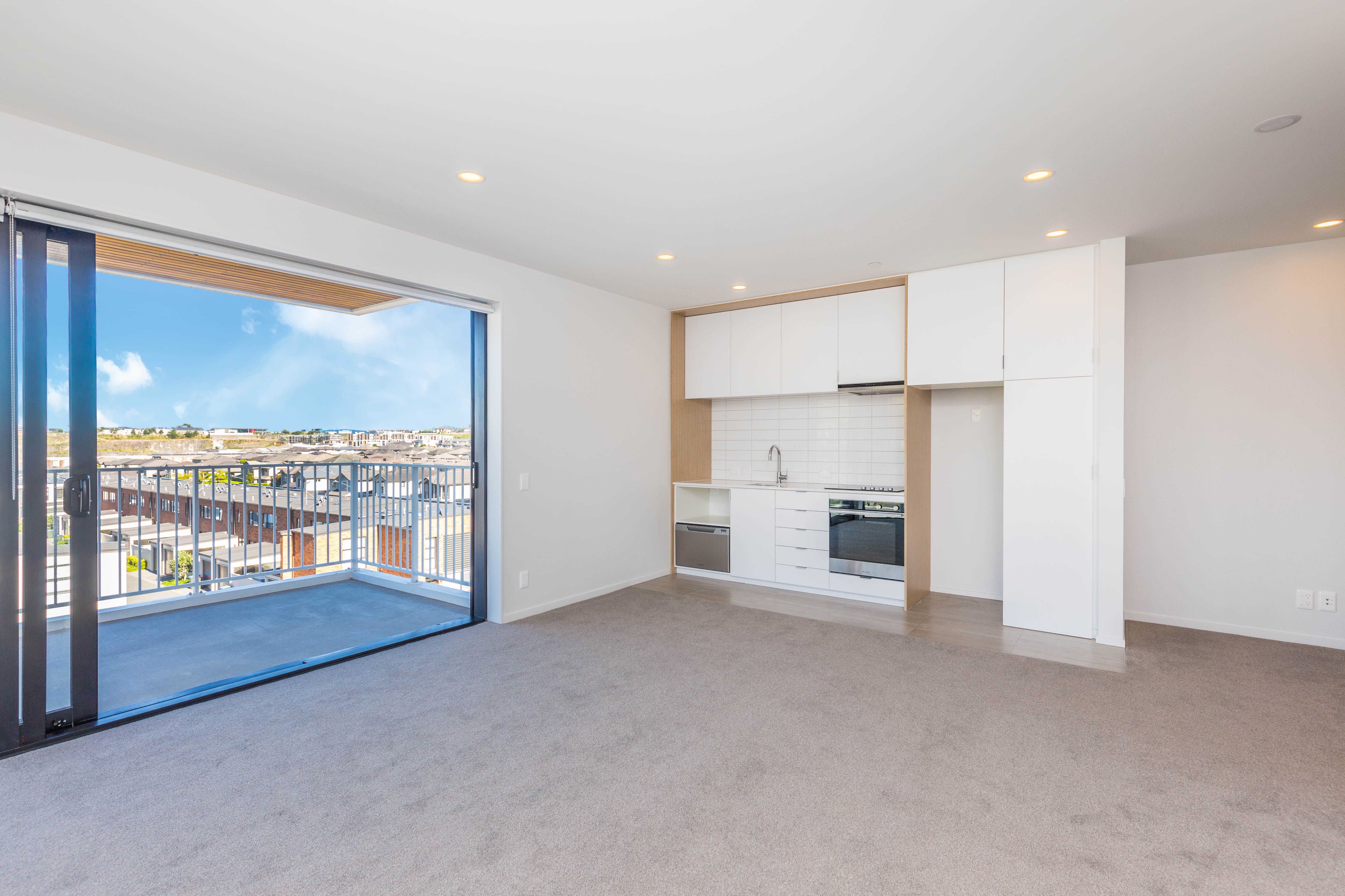 A simple and effective layout is flooded with sun through the floor to ceiling windows. Scandinavian in aesthetic the galley style kitchen is practical and doesn't intrude on the openness of the living area. Large sliders fold back to reveal easy flow to a covered balcony that enjoys wide views across the nearby parks and community features.