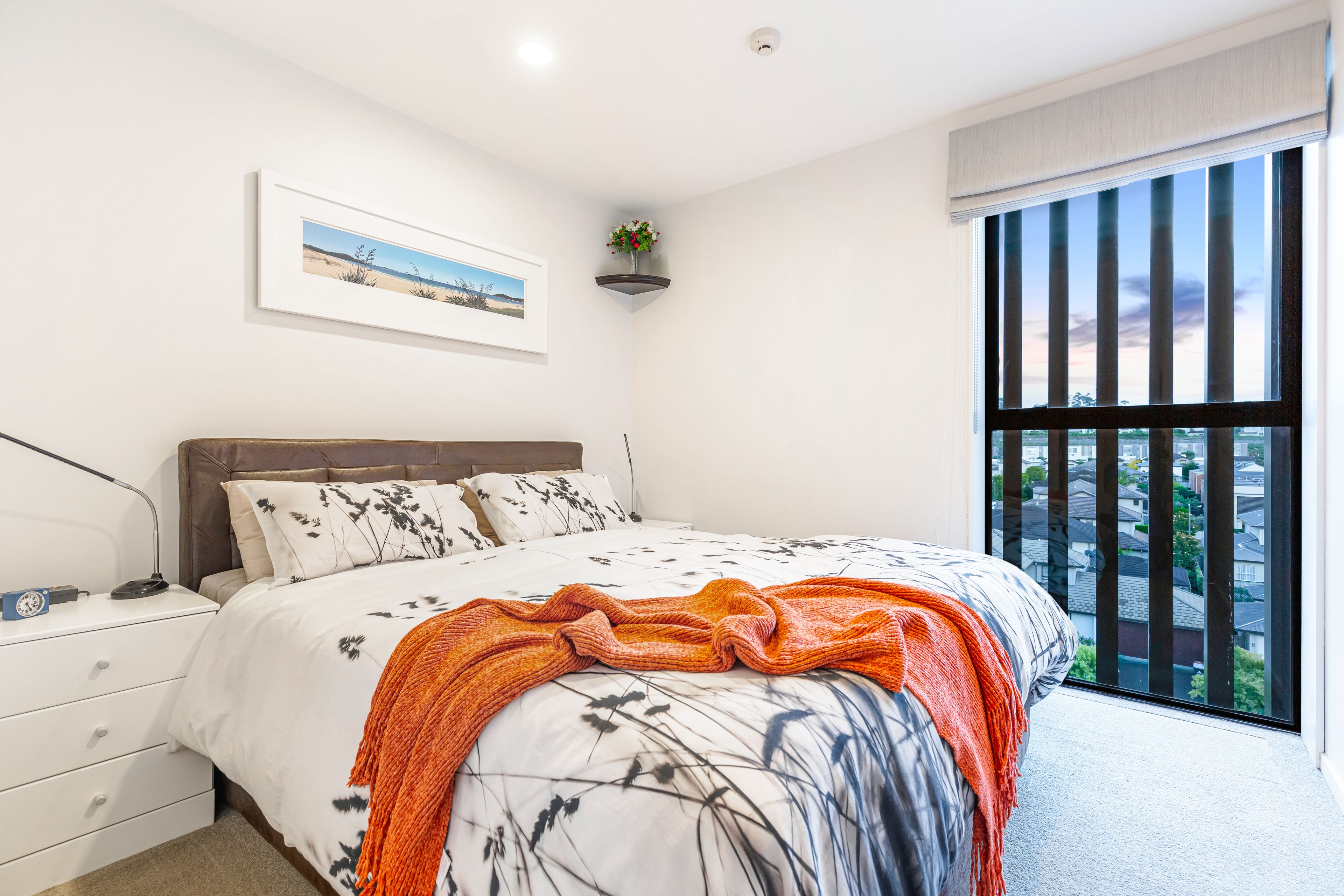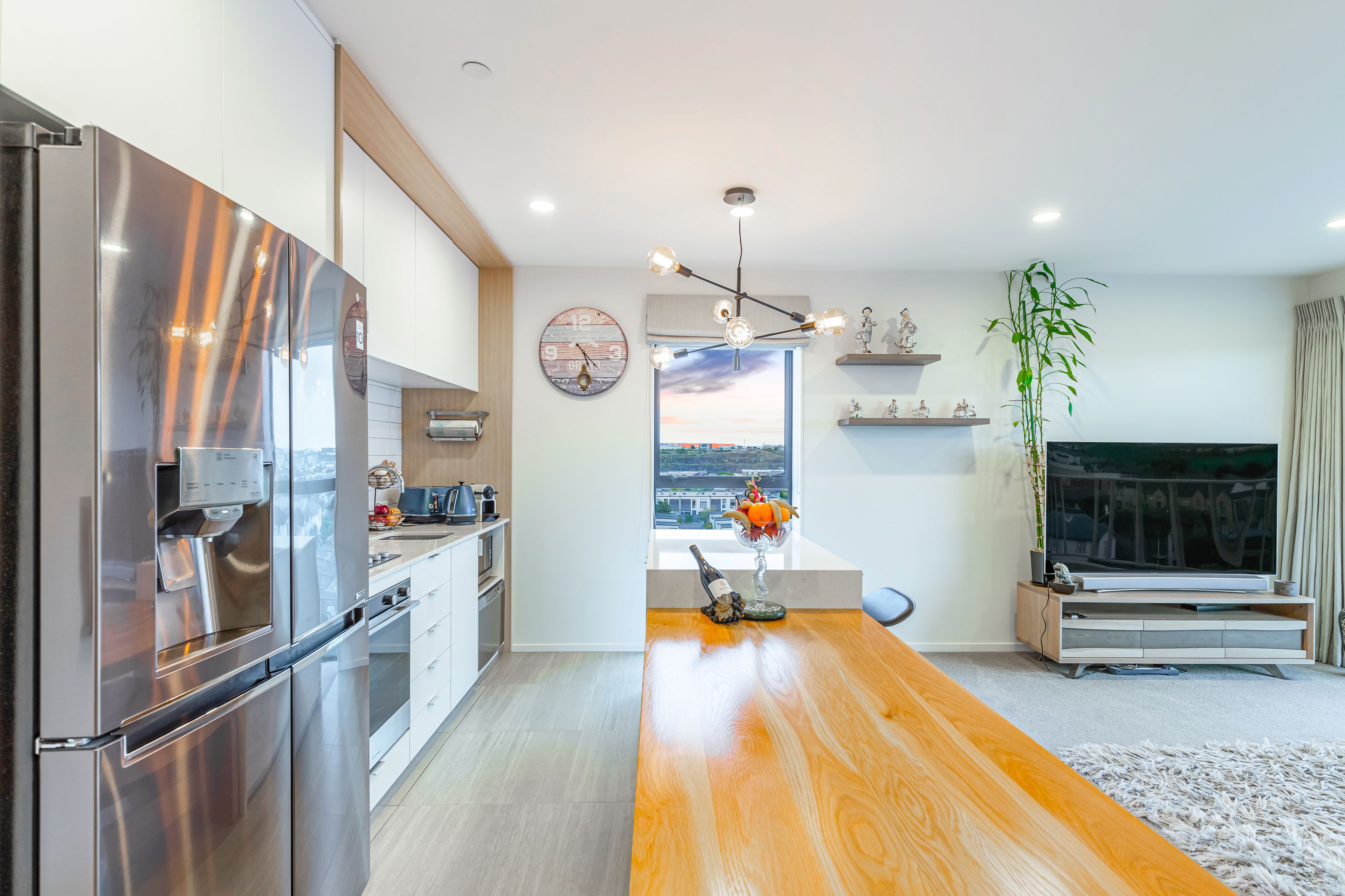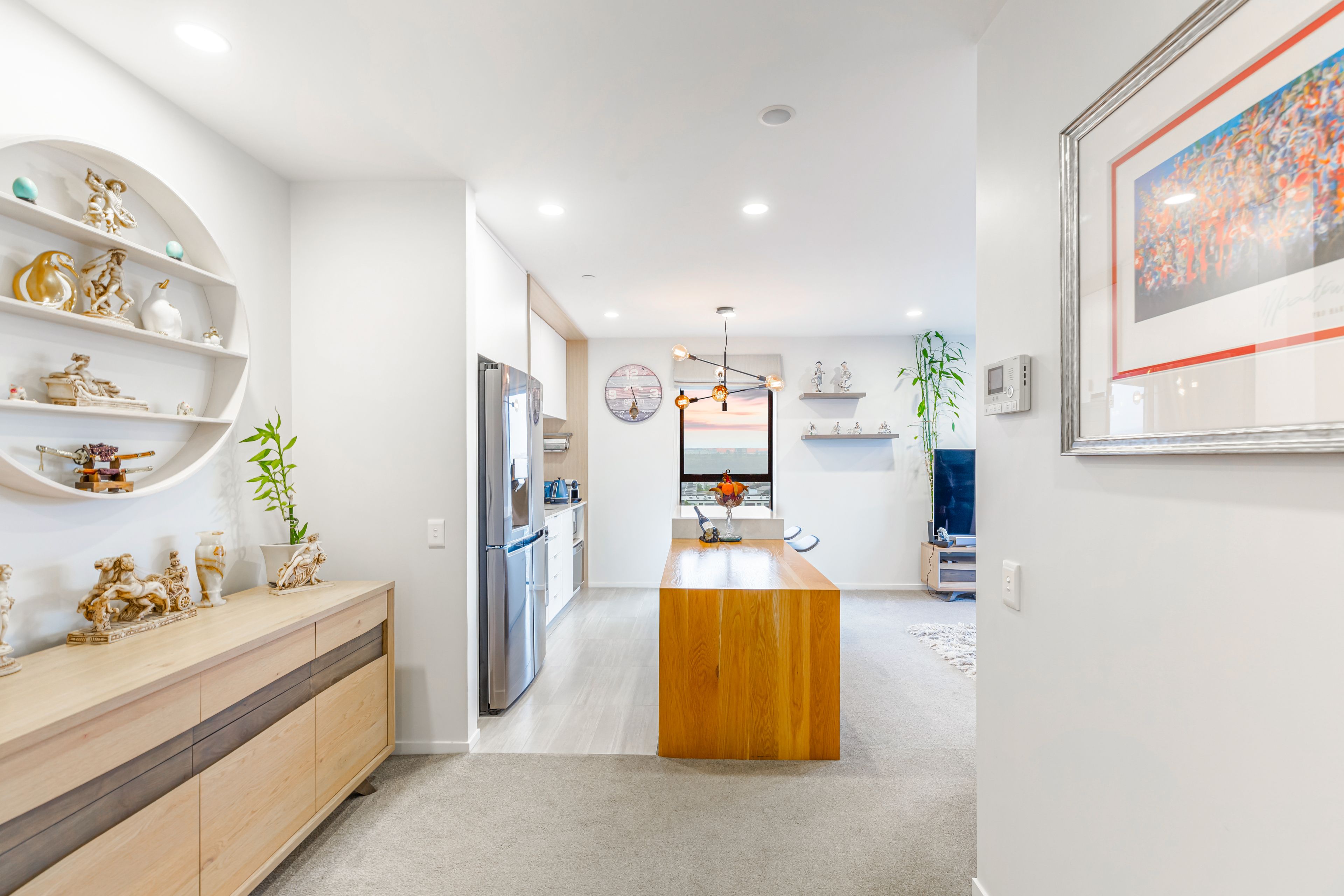 Positioned on the northwest corner, this penthouse apartment offers elevated, sun-filled living with serene views across Stonefields. The open-plan living area features a galley kitchen with custom cabinetry and a built-in waterfall dining space, seamlessly flowing onto a generous balcony - perfect for entertaining on warm summer evenings.