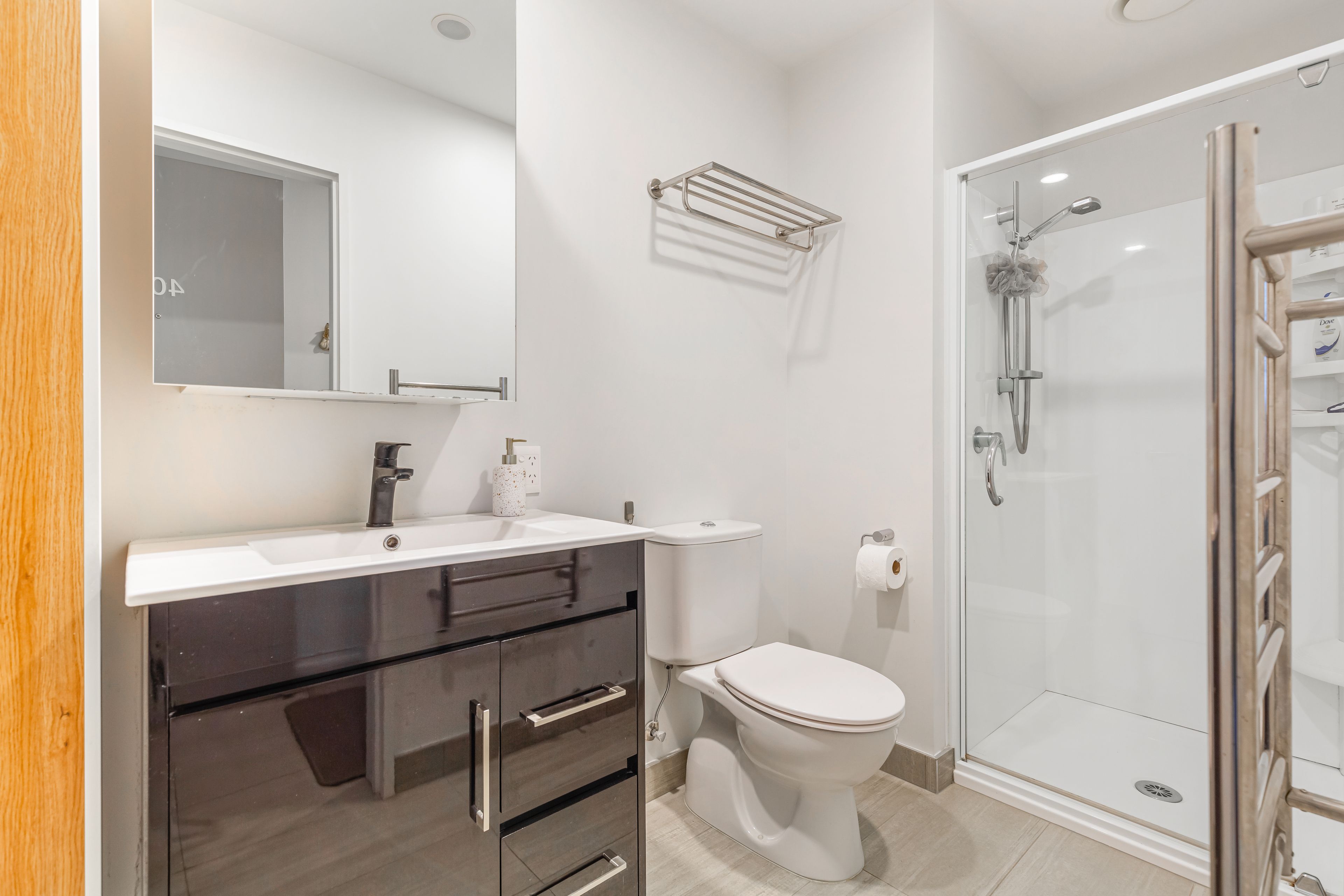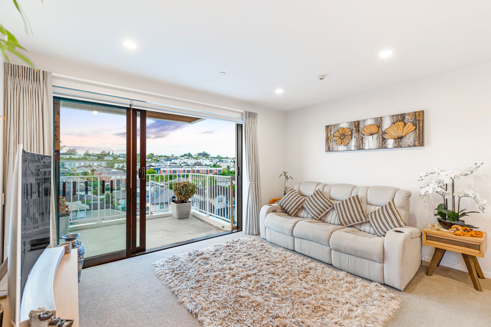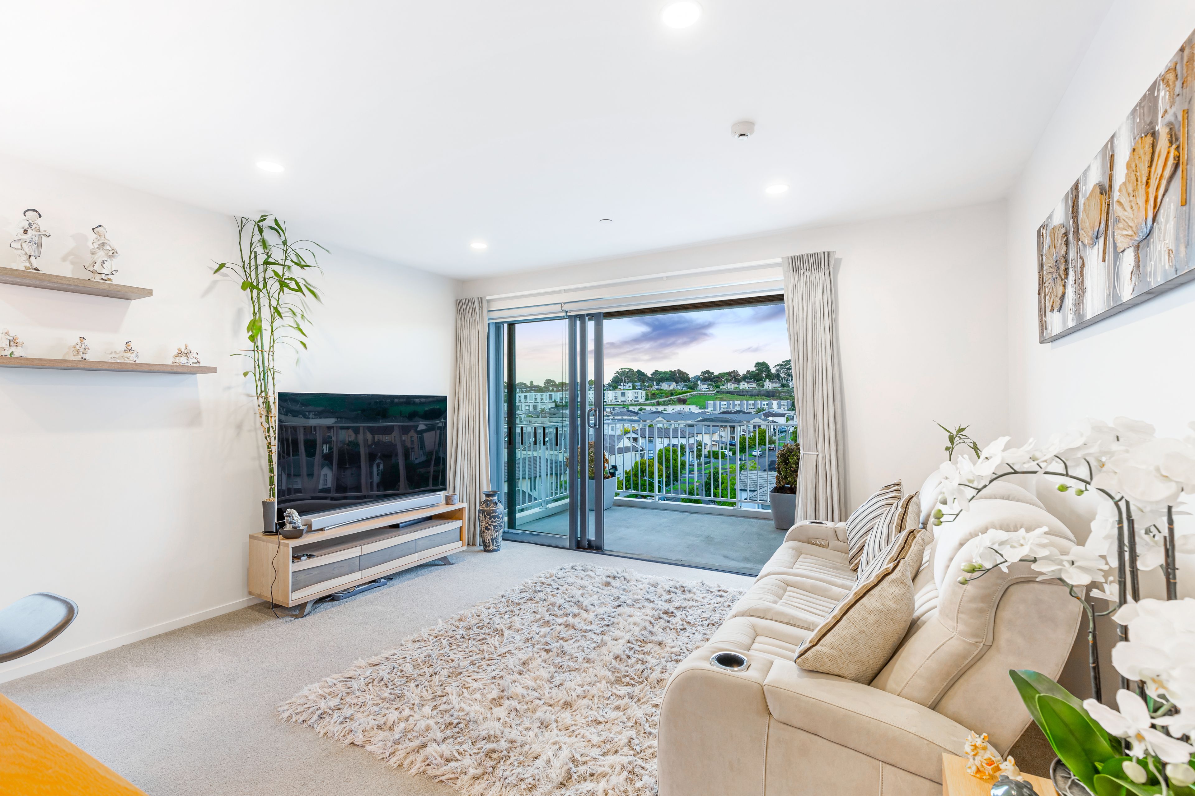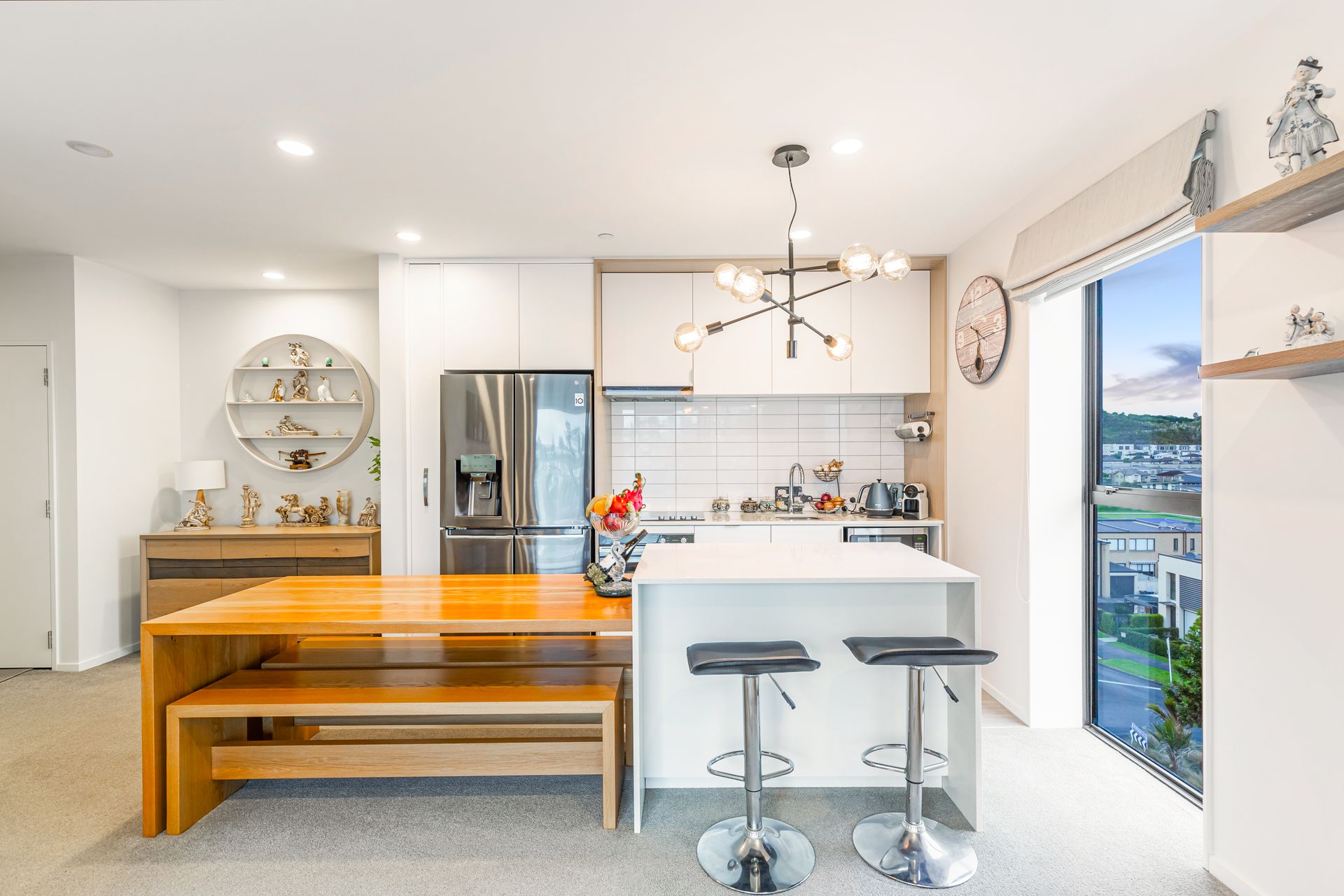 Positioned on the northwest corner, this penthouse apartment offers elevated, sun-filled living with serene views across Stonefields. The open-plan living area features a galley kitchen with custom cabinetry and a built-in waterfall dining space, seamlessly flowing onto a generous balcony - perfect for entertaining on warm summer evenings.