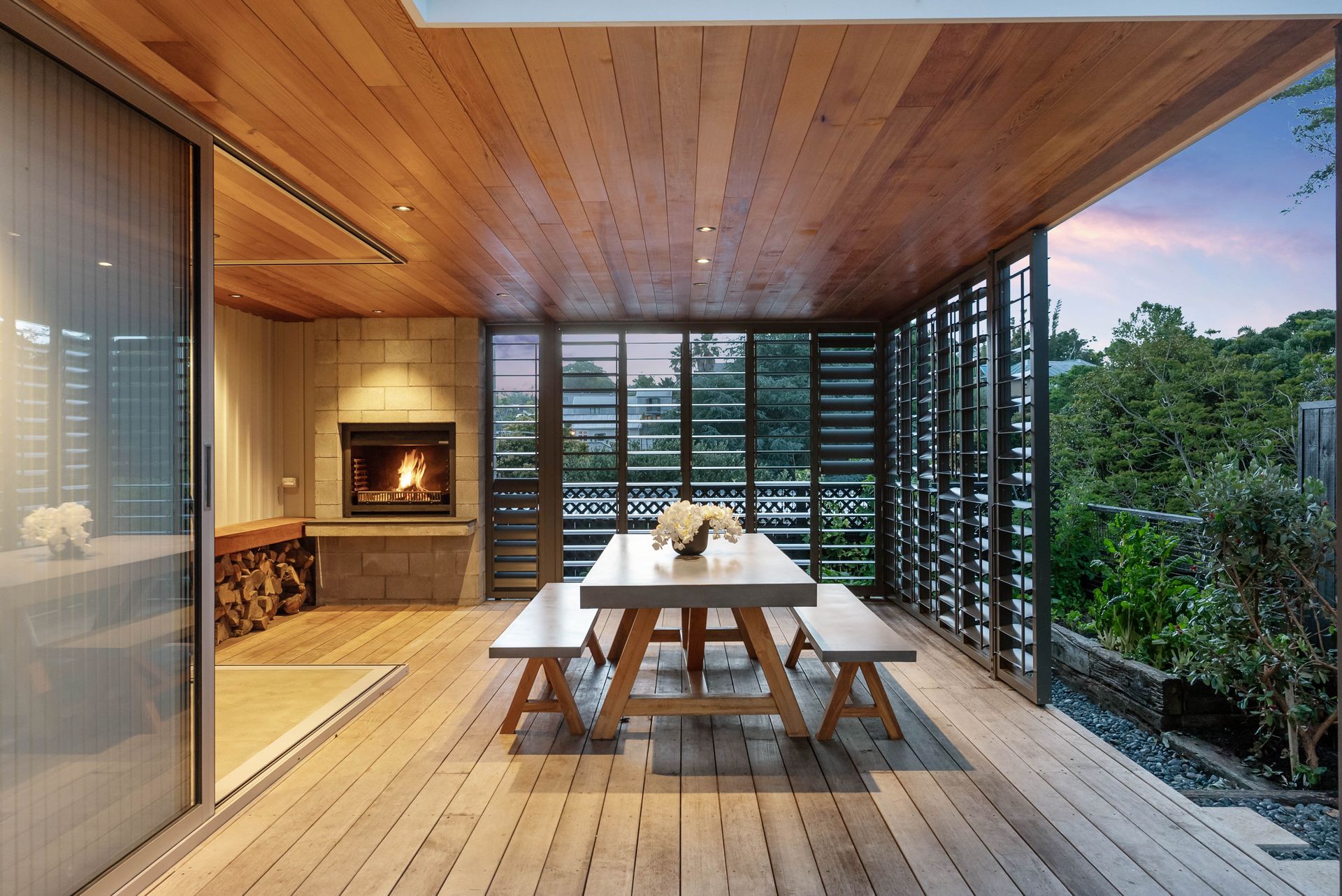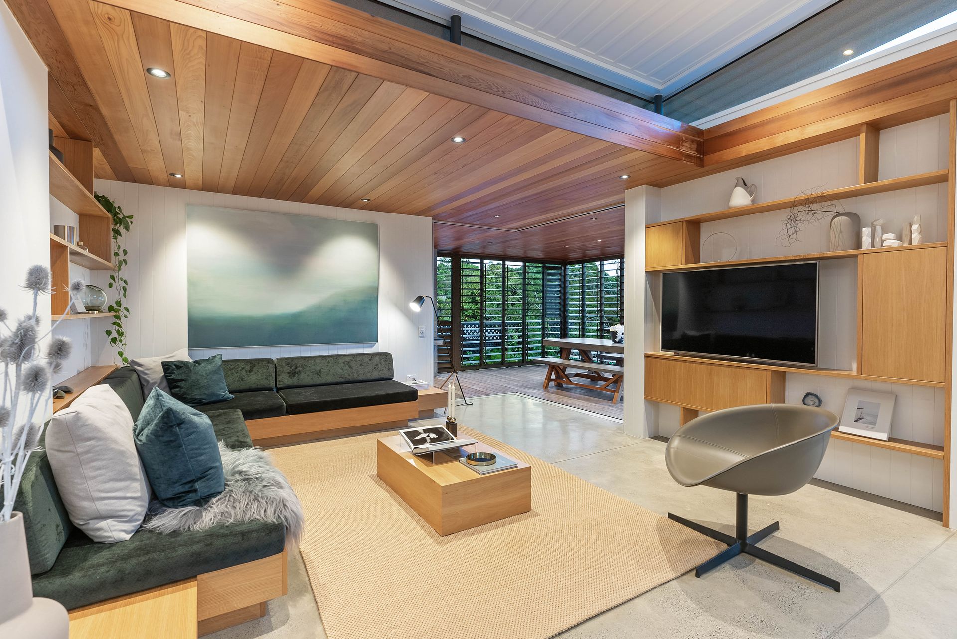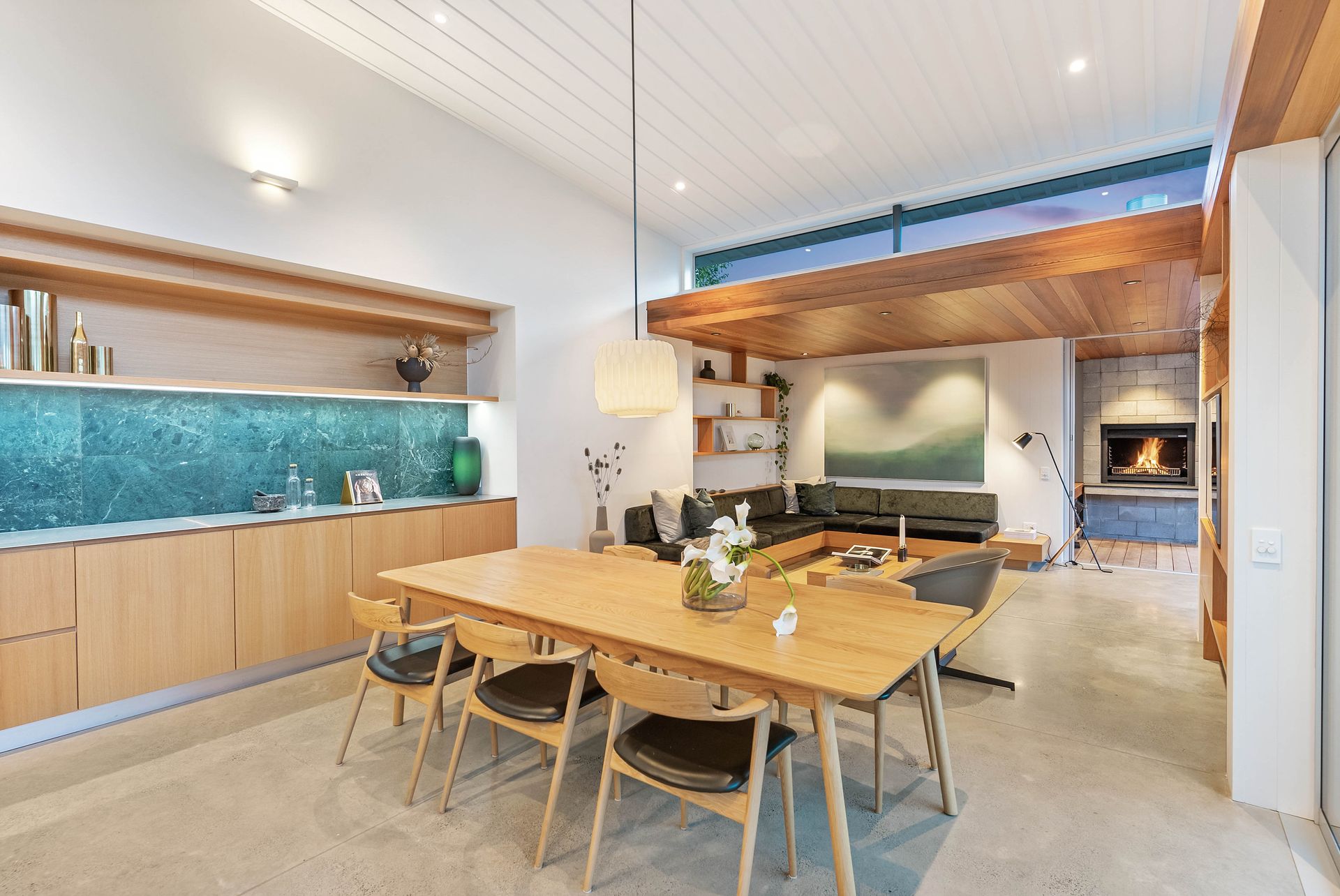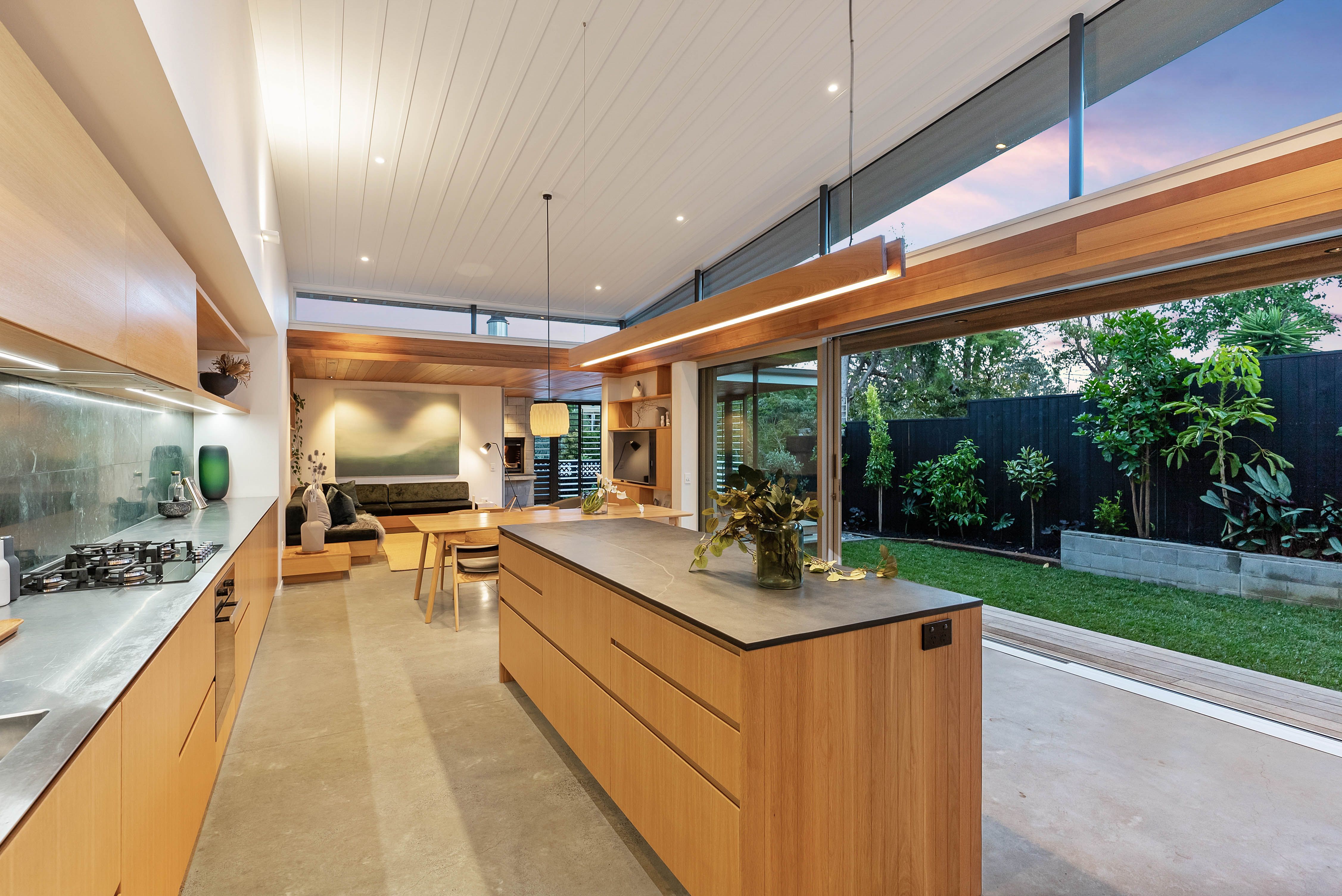 Embracing all day sunshine, the north facing pavilion is a carefully curated, light-filled space with custom designed built-in lounge seating, timeless timber detailing and heated concrete floors. Glass sliders provide a seamless extension to the outdoor living room complete with Warmington wood fire barbeque, perfect for year-round entertaining. The bespoke kitchen is a statement in contemporary design with Miele appliances, butler's pantry, emerald marble splashback and large black slate island bench. Epicureans will be right at home here.