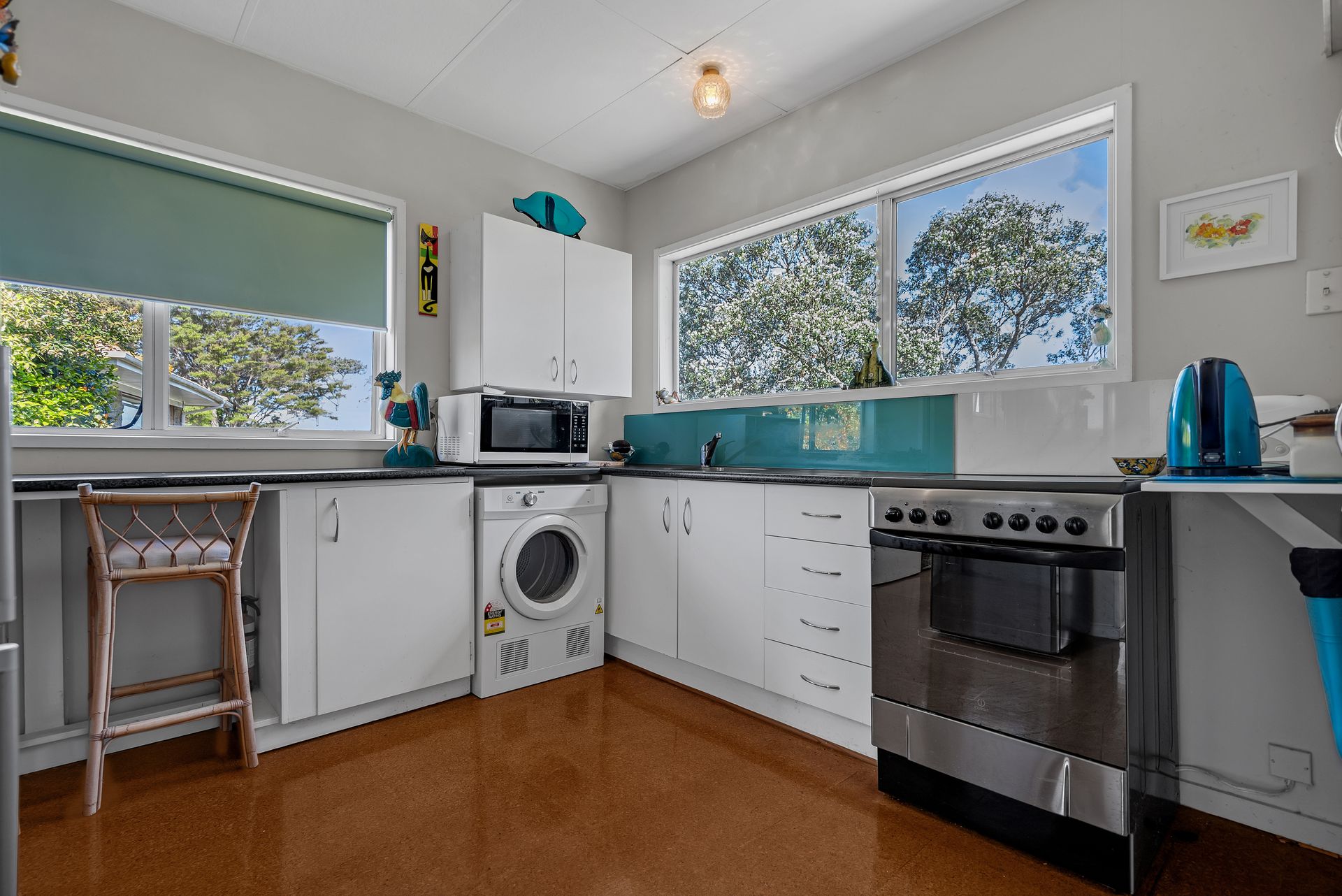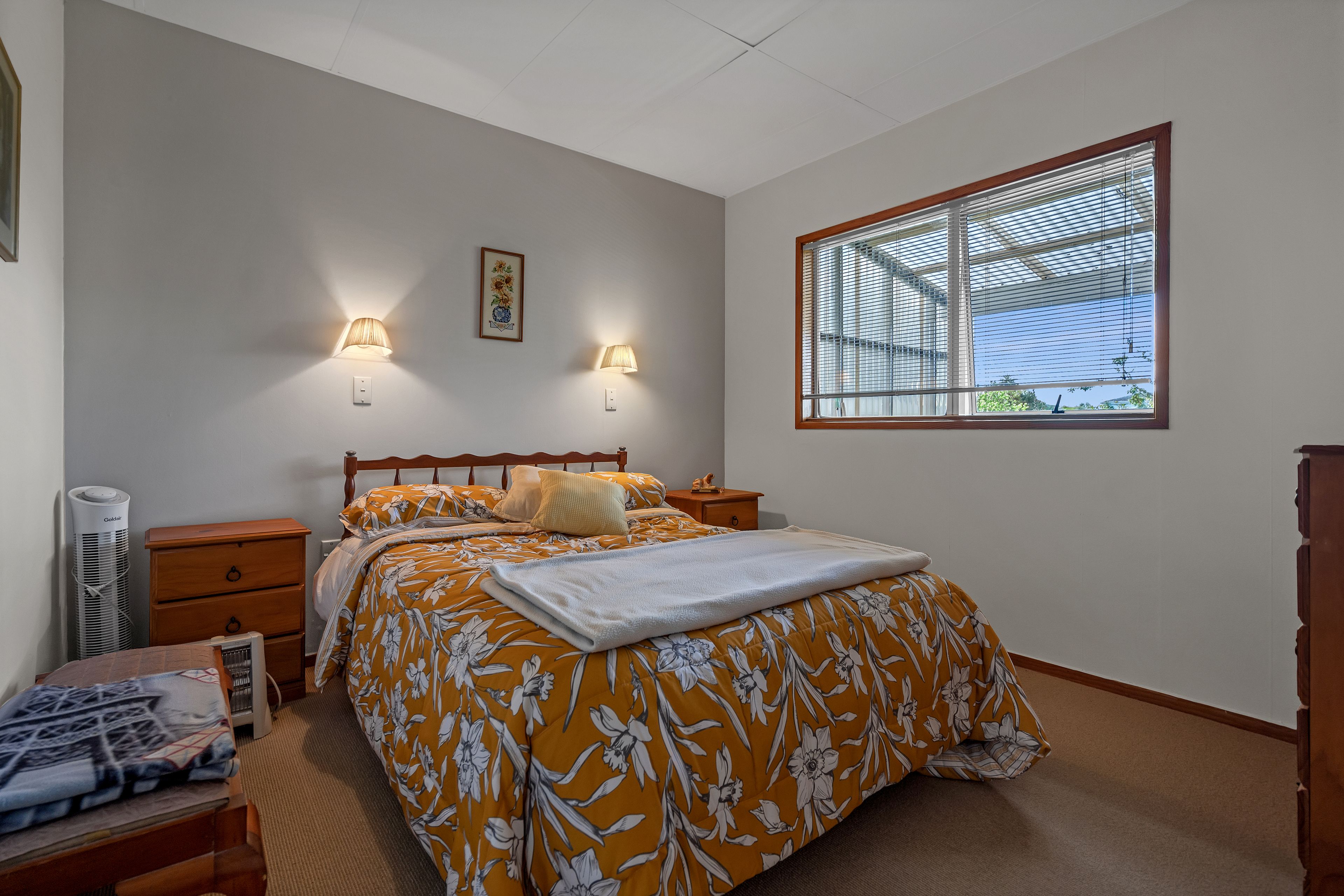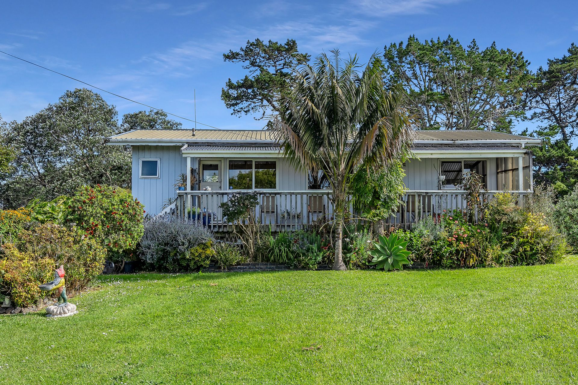 The exterior condition of the house comprises of a tin cladding, with a color steel roof and partially fenced yard. The southerly aspect offers beautiful views of the harbor and sea, creating a serene and picturesque atmosphere. Additional features of this property include a heat pump for heating, electric hot water system. The property also comes with blinds, fixed floor coverings, a garage door opener, light fittings, and a heat pump.