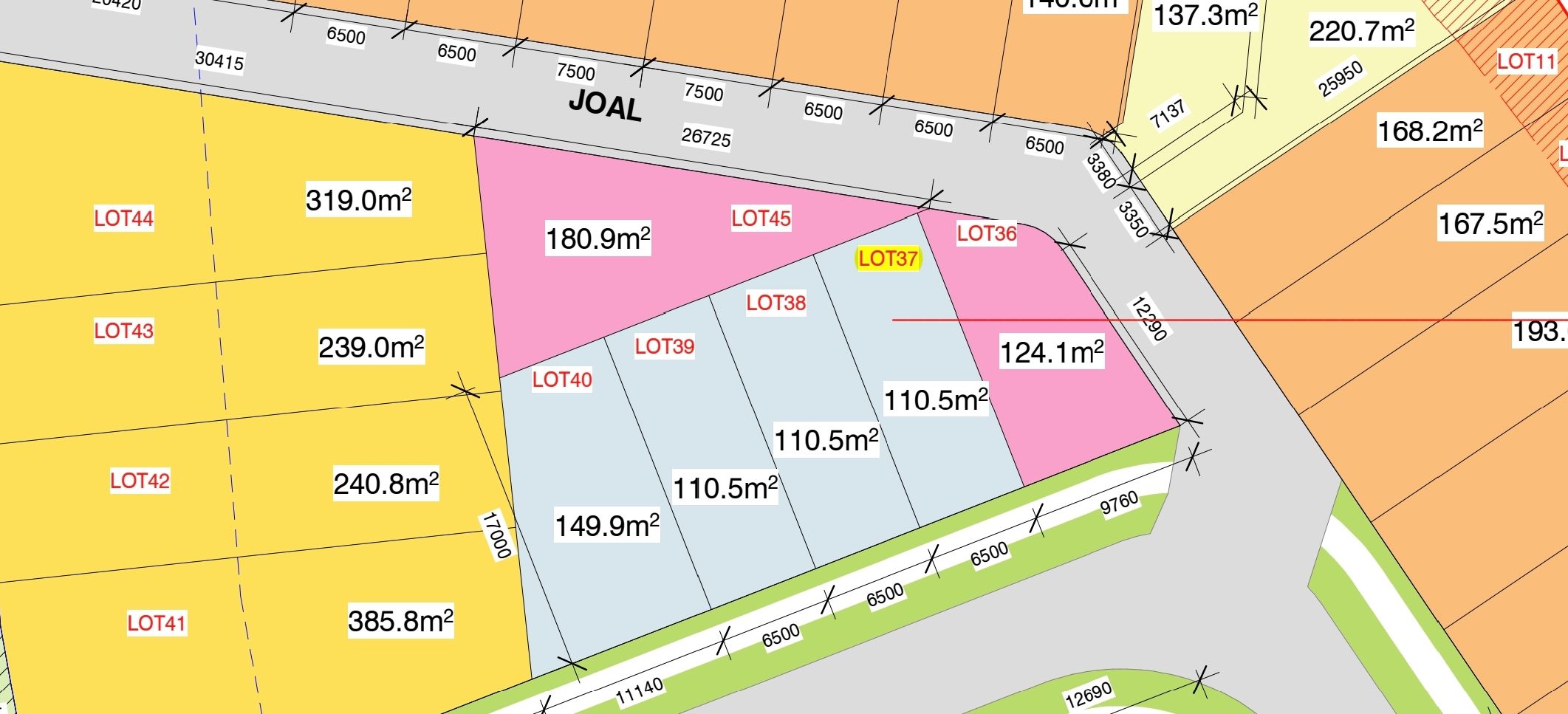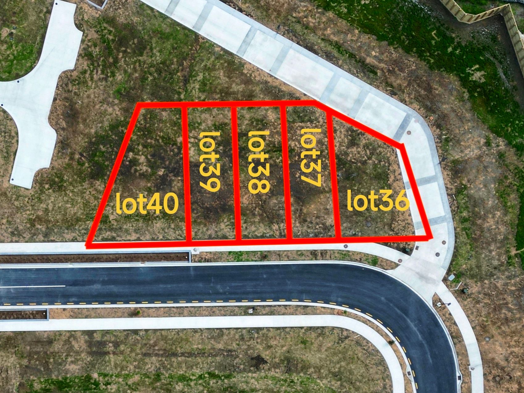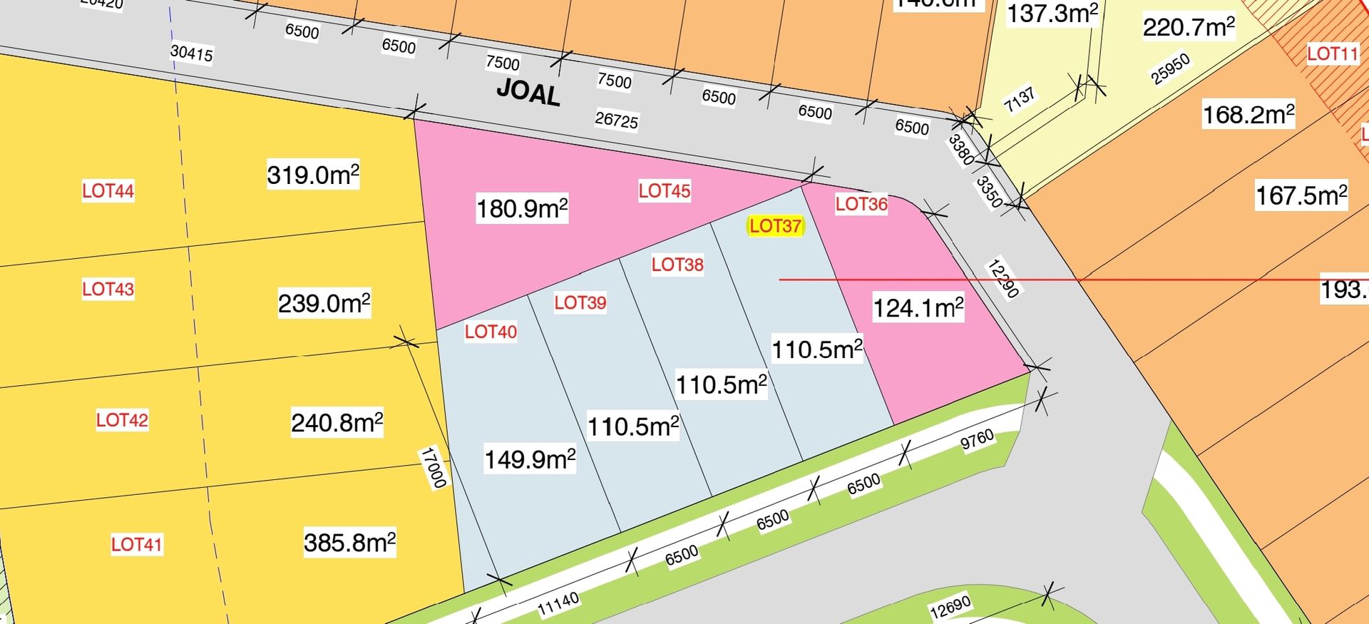 Lot sizes vary, with Lot 36 at approximately 125 sqm, Lot 40 at 138 sqm, and the remaining three lots (Lot 37,38,39) averaging around 114 sqm each.