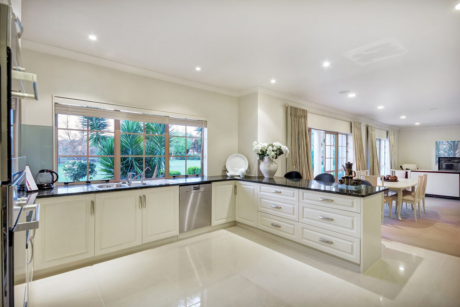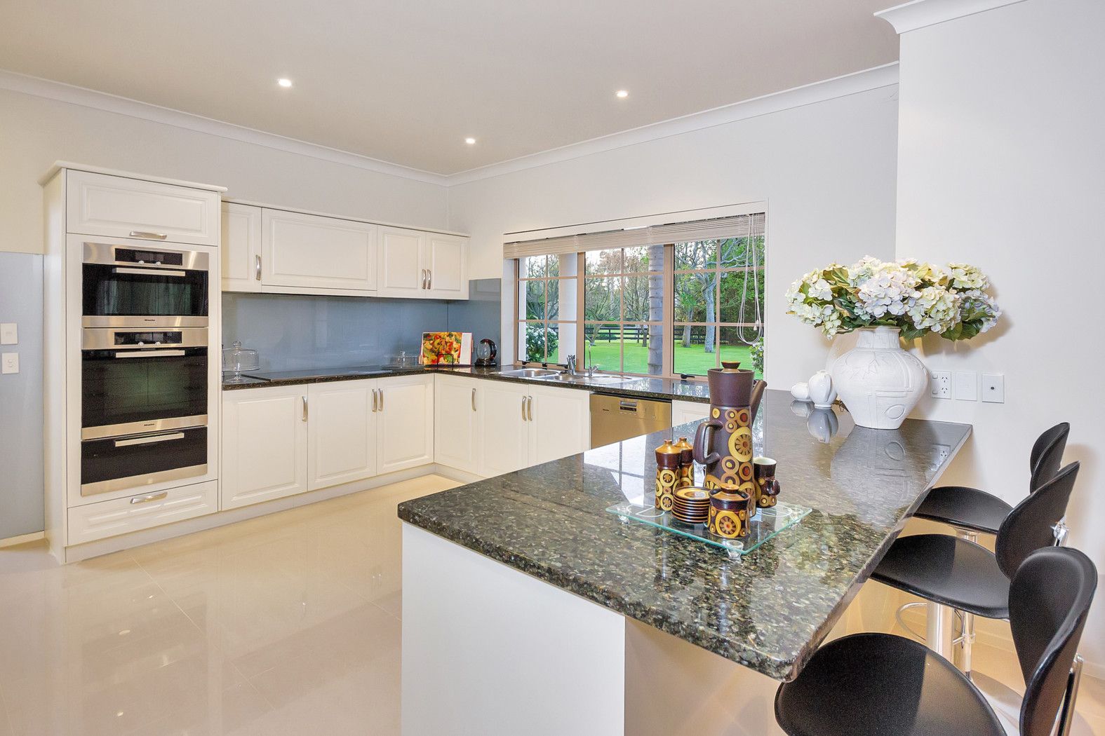 - Spacious kitchen with granite benches and porcelain floor tiles