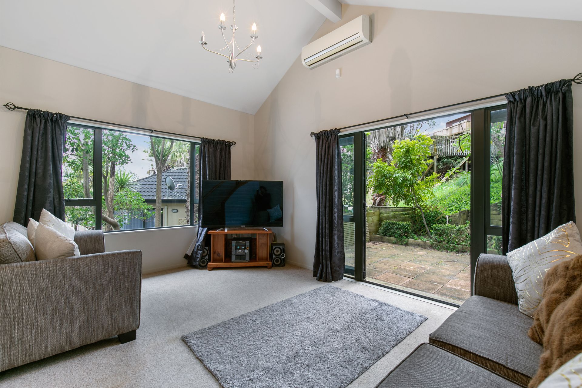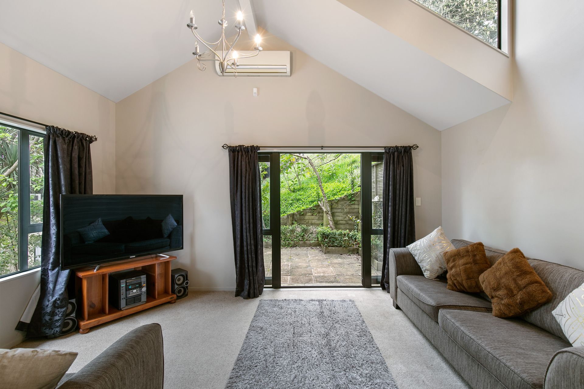 :: Soaring cathedral ceilings in lounge with heat pump