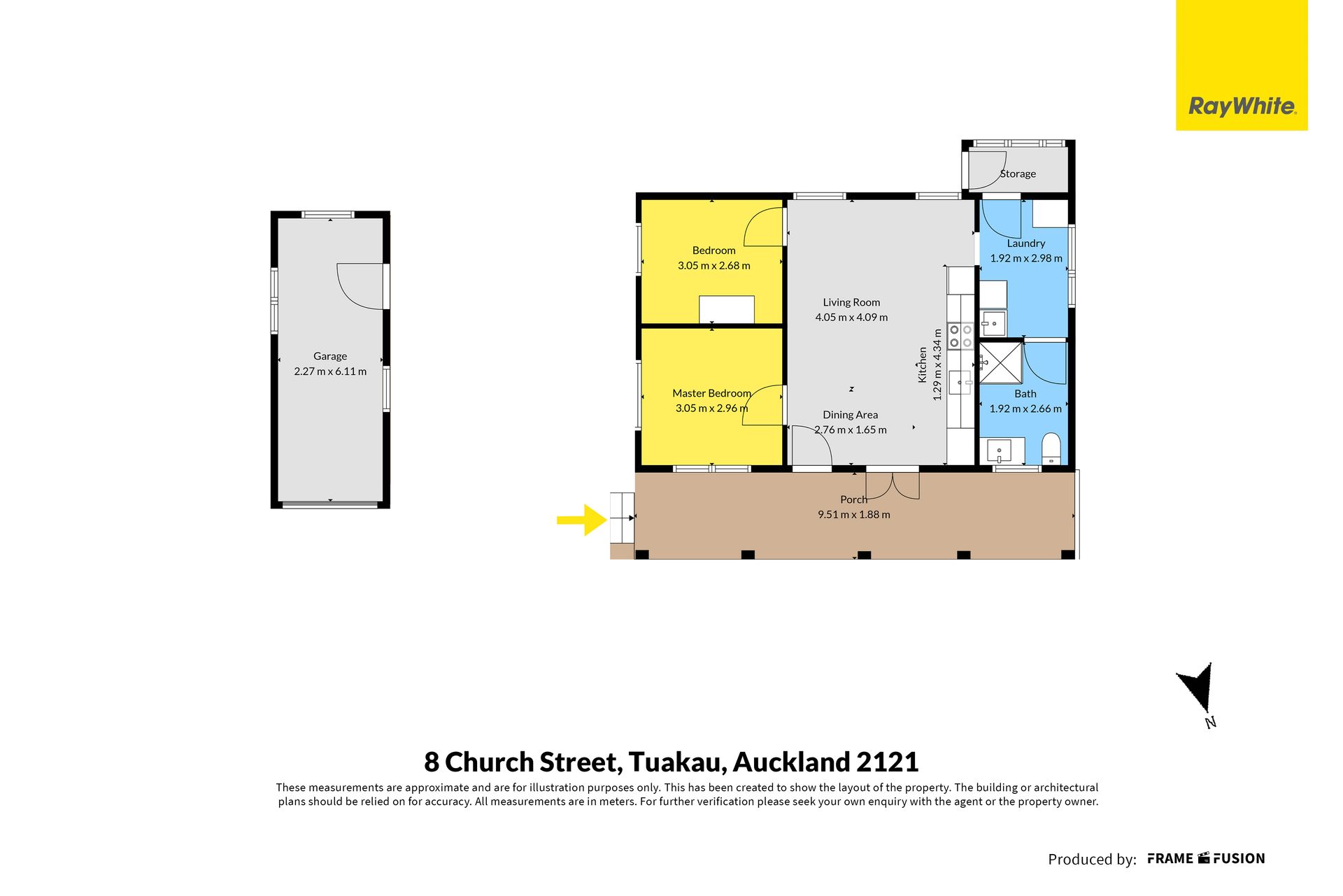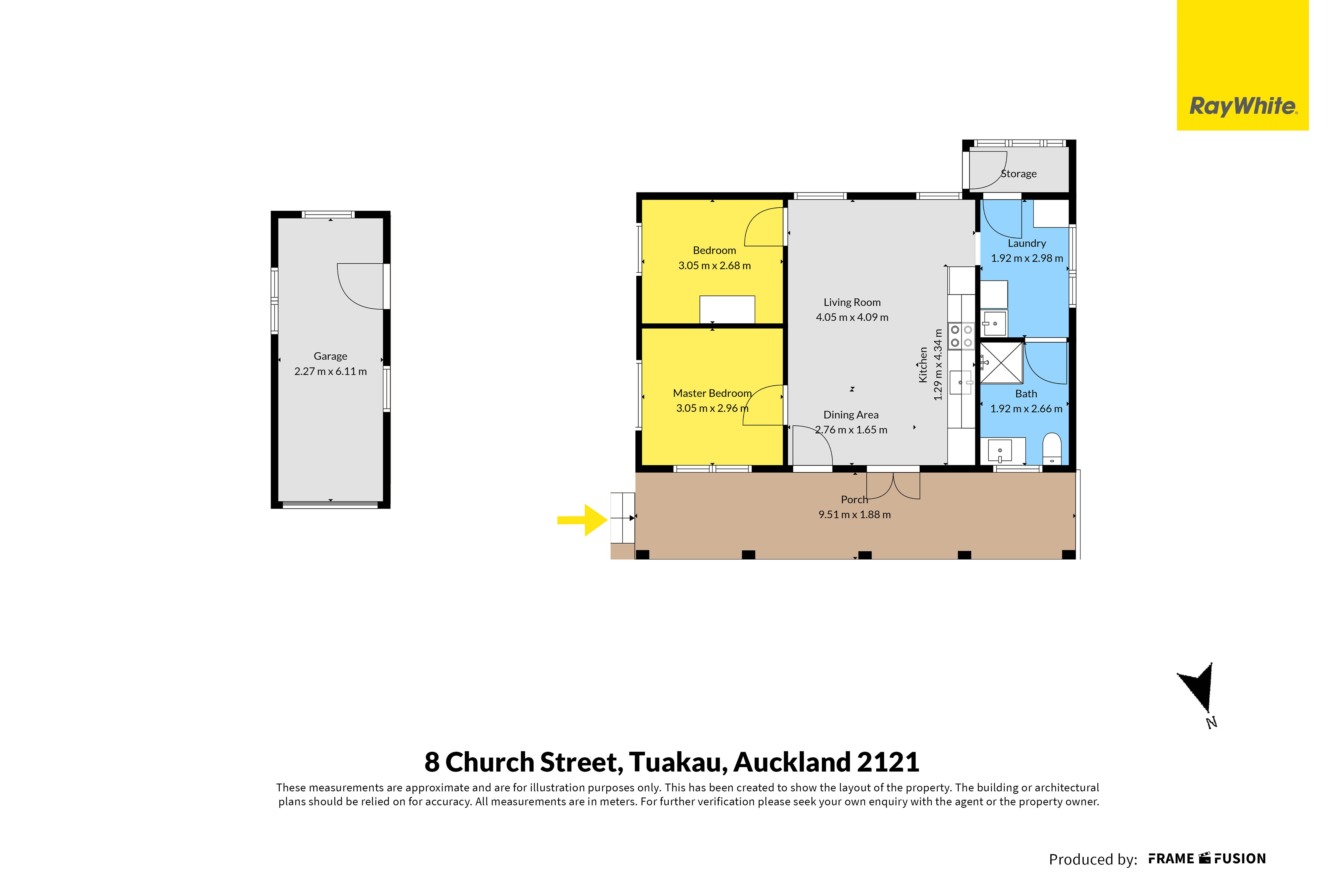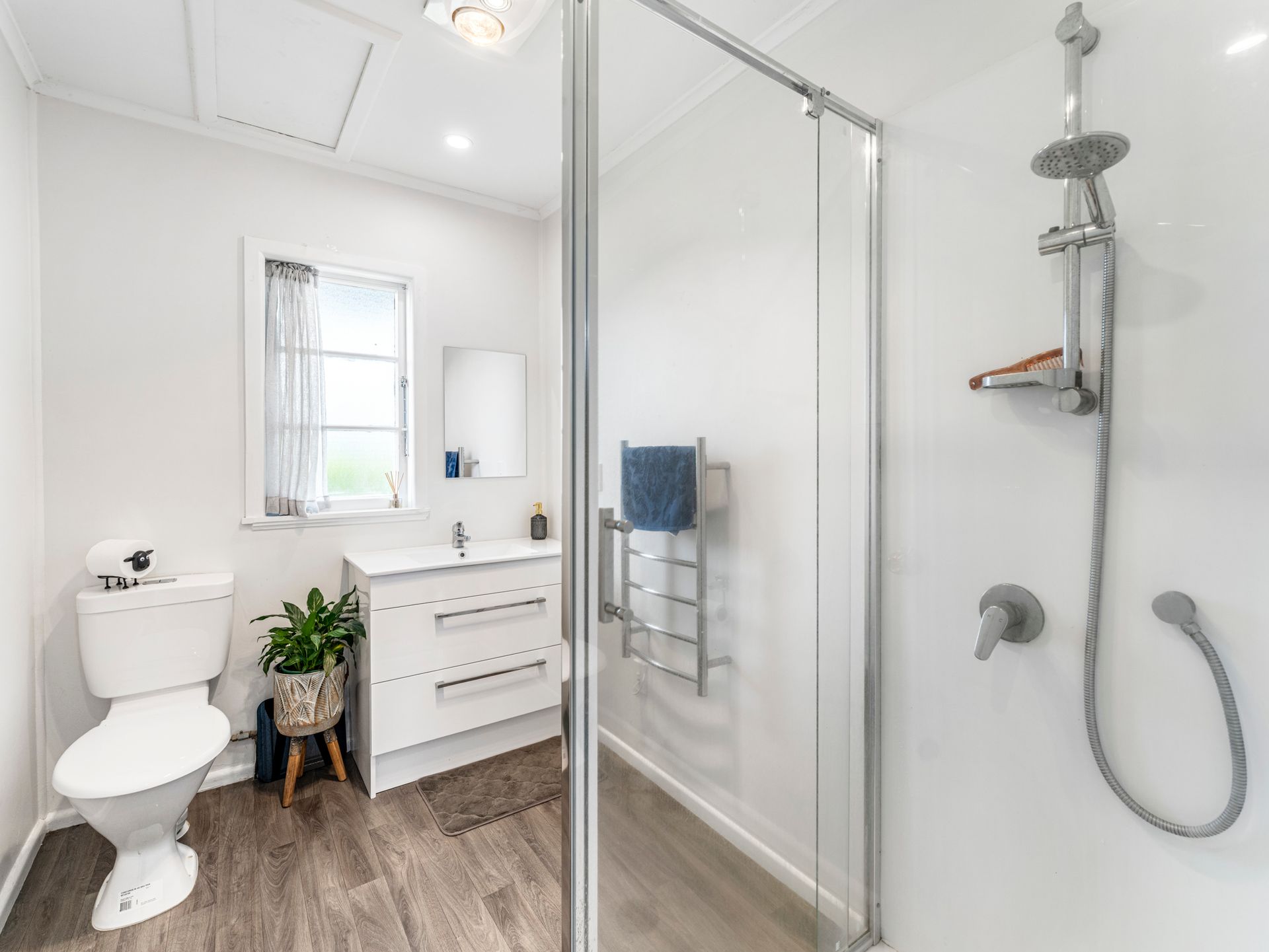 Accommodation includes two well-sized bedrooms, both enjoying natural light and a calm, neutral palette. The bathroom has been tastefully updated and features a glass shower, modern vanity, heated towel rail and contemporary finishes, complemented by a toilet for added convenience. A dedicated laundry with storage completes the interior layout.