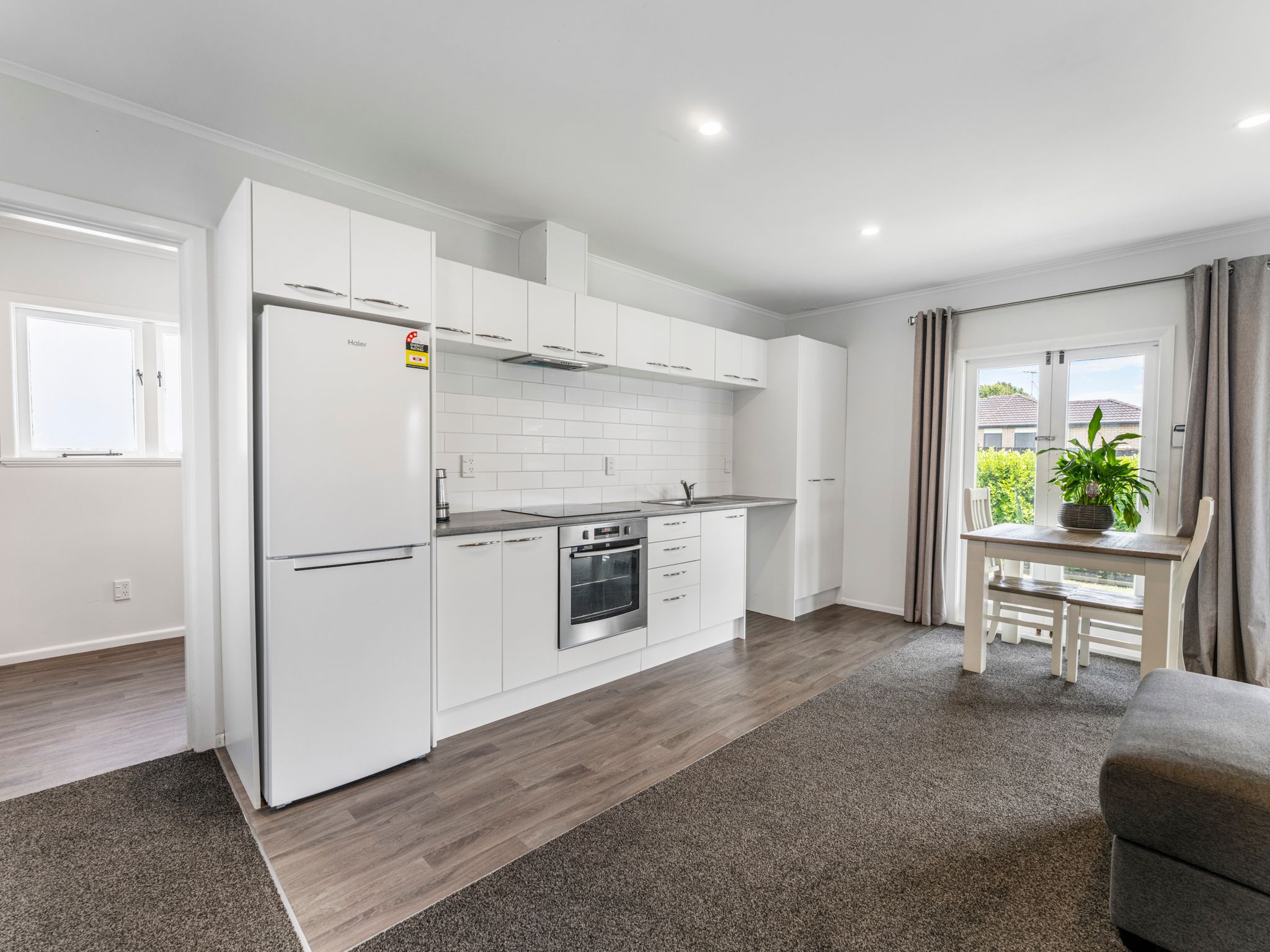 Inside, the home is light, warm and thoughtfully laid out. The open-plan living, dining and kitchen area forms the heart of the home, creating an easy flow for everyday living and entertaining. A heat pump ensures year-round comfort, while neutral tones and modern finishes give the home a fresh, move-in-ready feel.