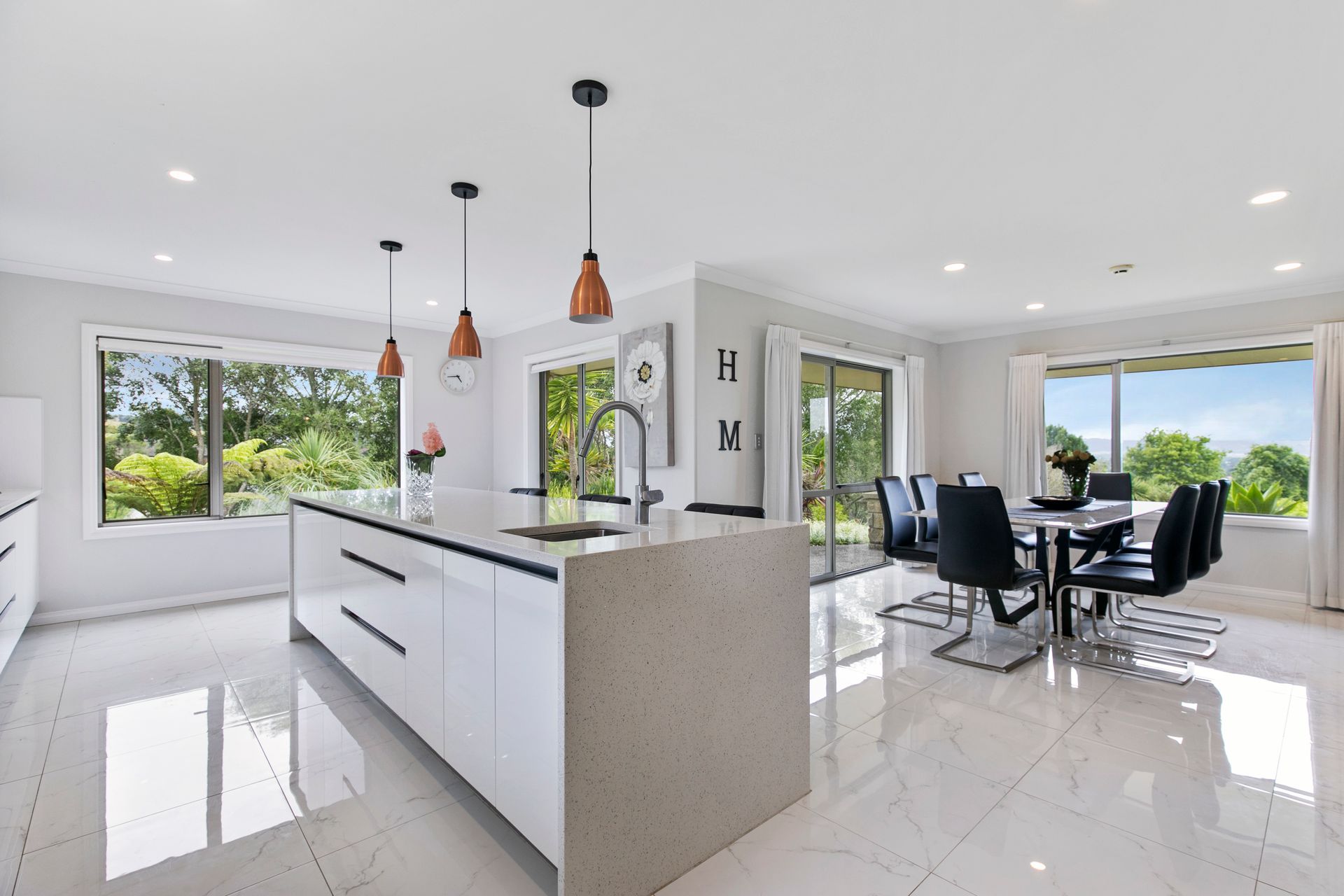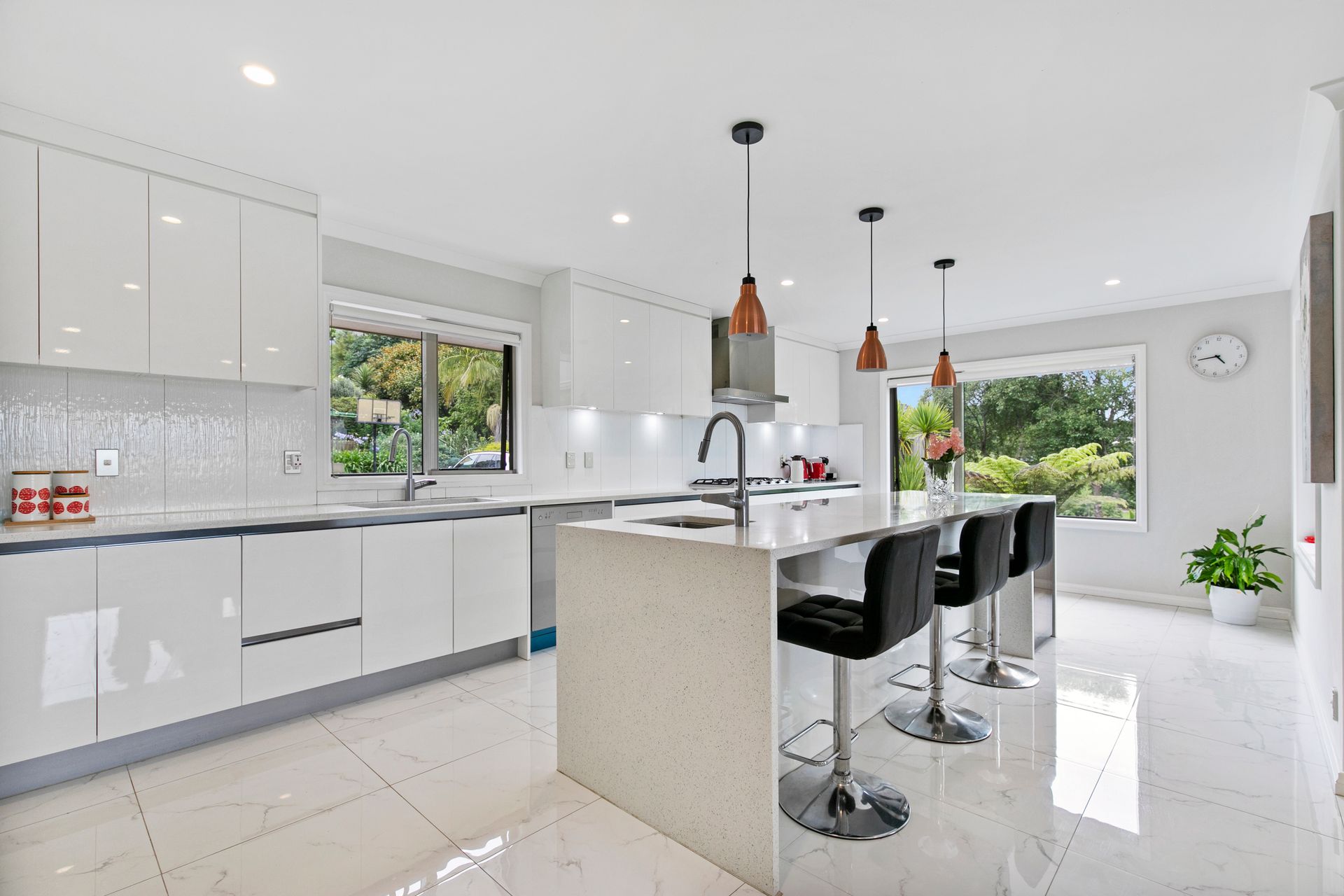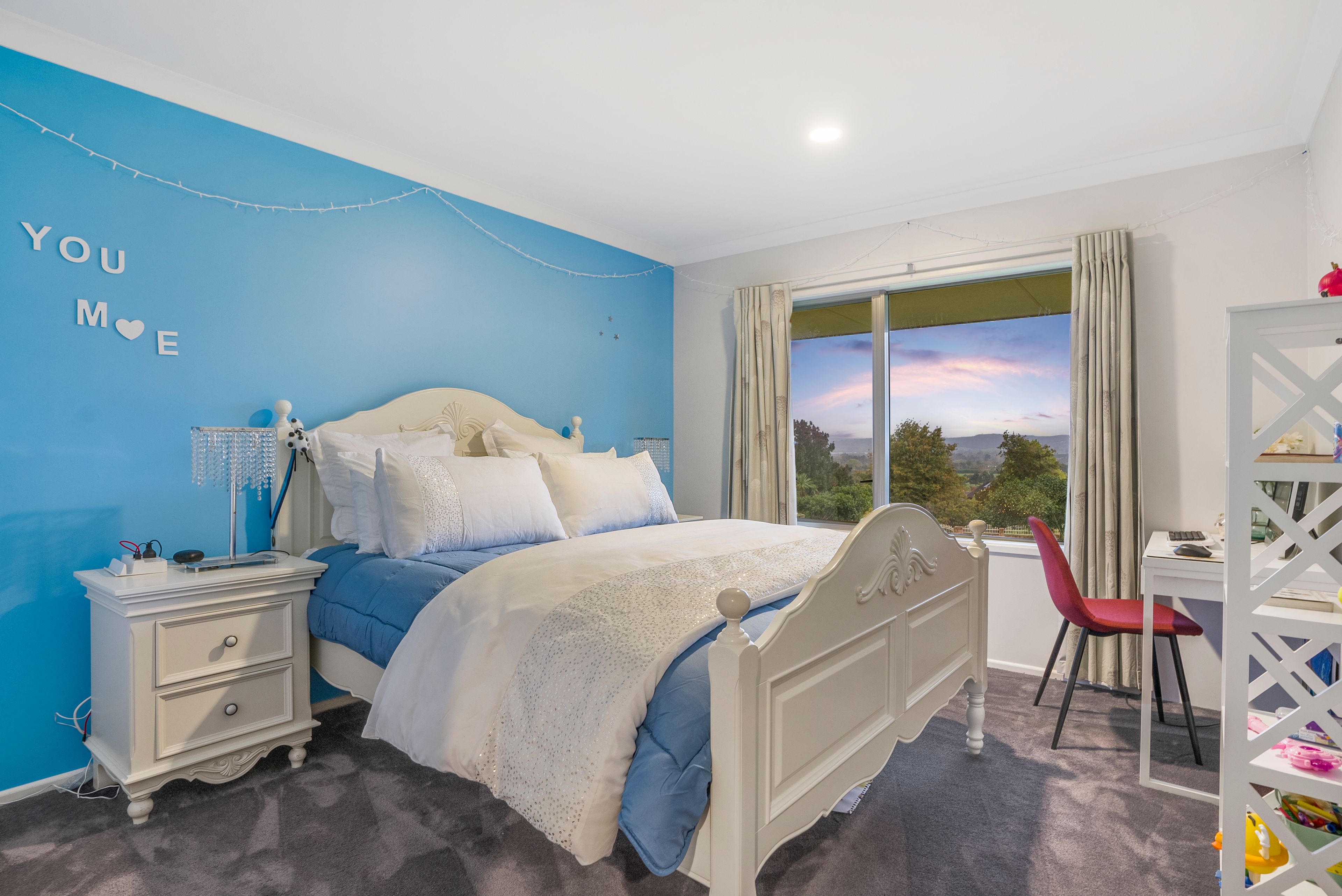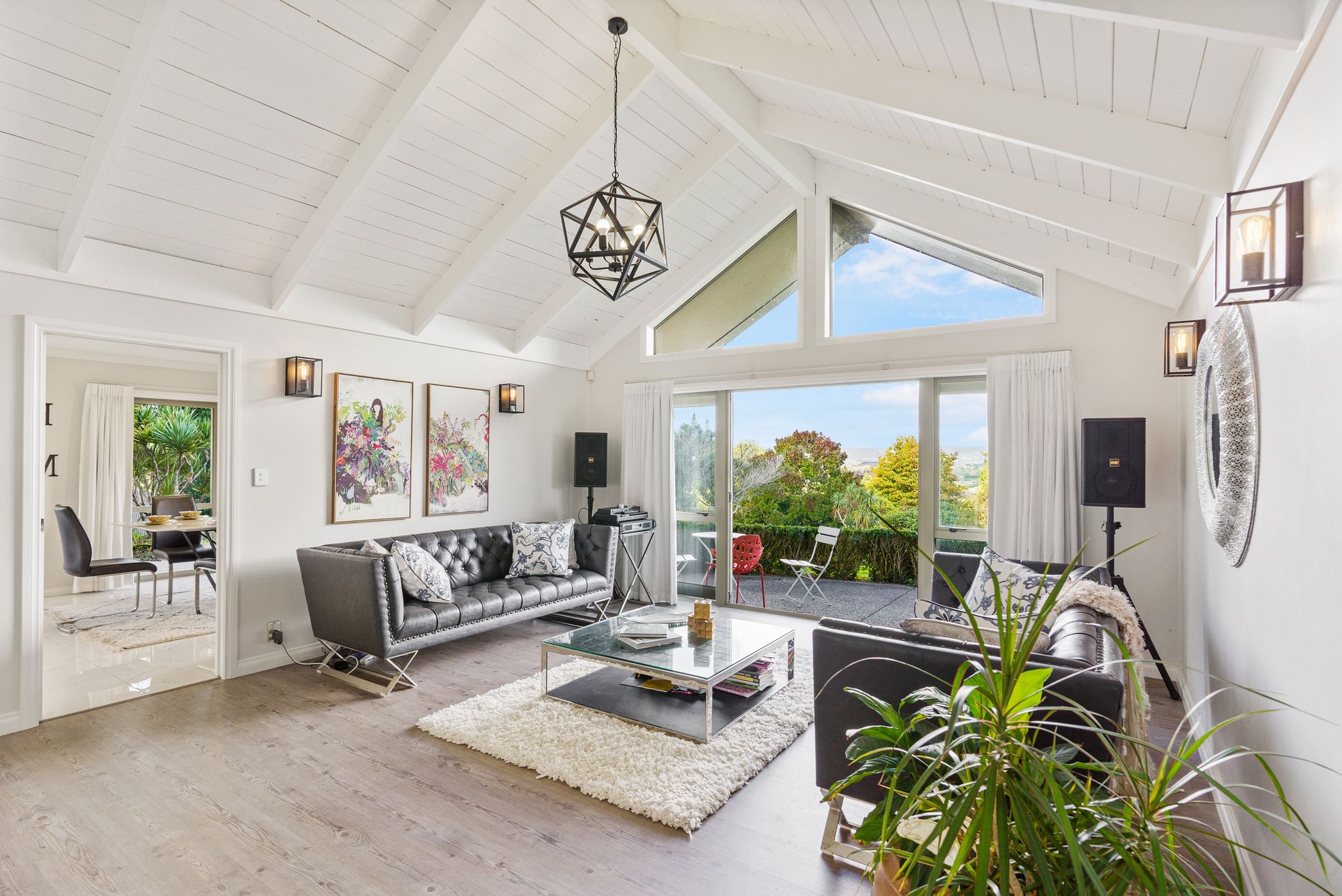 Gabled timber ceilings adorn the main living area, with the ambiance enhanced with a large gas fire providing instant comfort on those colder nights as you enjoy views out to the Hunua Ranges. The large, light & bright kitchen is complimented by two wet areas, perfect for large families who love to cook and entertain.