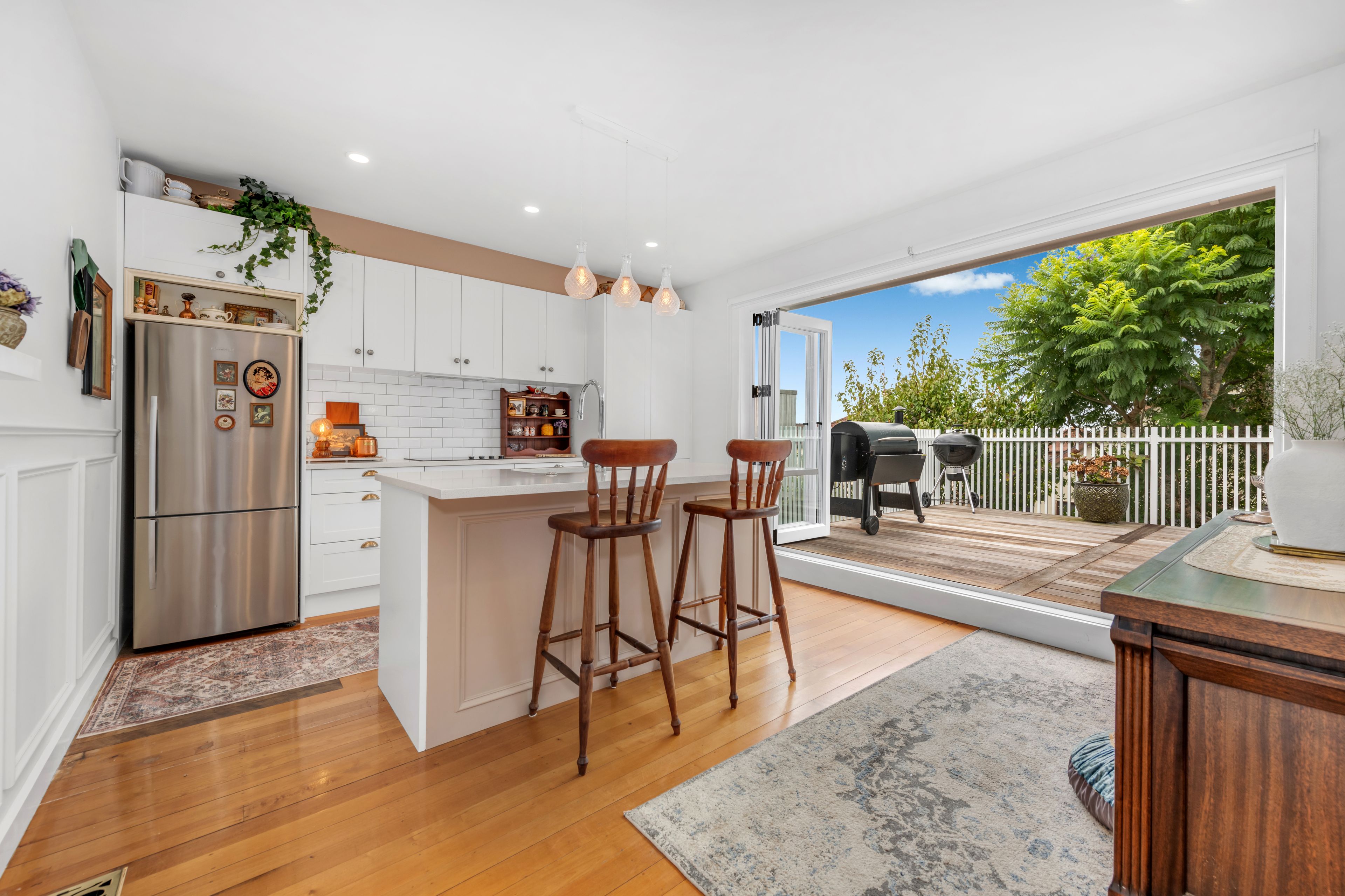 Step inside, and you'll feel it - that intangible magic that turns a house into a home. Sunlight streams through expansive windows, highlighting the character features and bathing each space in warmth. A seamless flow connects the heart of the home to an expansive entertainer's deck, an inviting space that serves equally well as a tranquil retreat or a vibrant play area for children. The lush, private outlook enhances the sense of serenity, while the open-plan kitchen, complete with high-quality appliances and generous storage, makes everyday living a joy. Floor-to-ceiling sliders extend the indoor experience to the sunny alfresco space, perfect for gathering with friends, indulging in a quiet moment, or simply embracing the beauty of your surroundings.