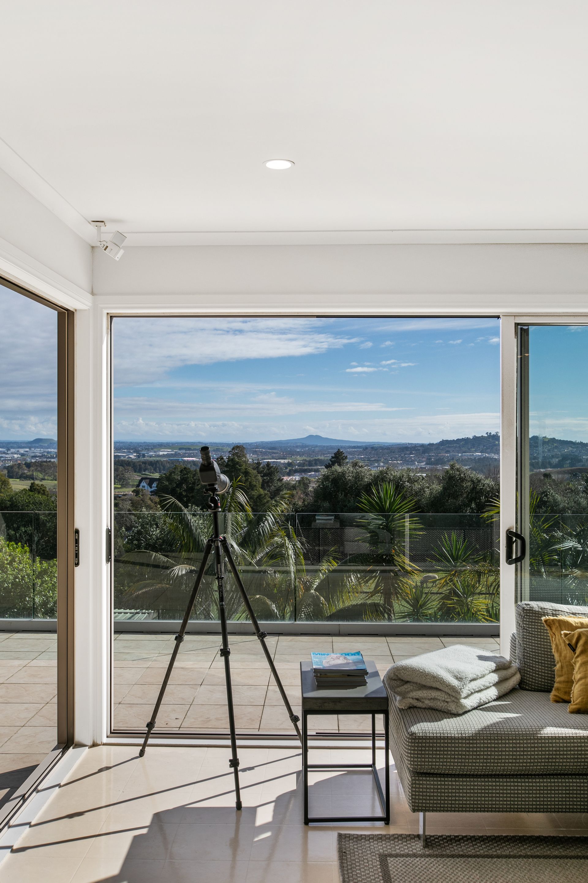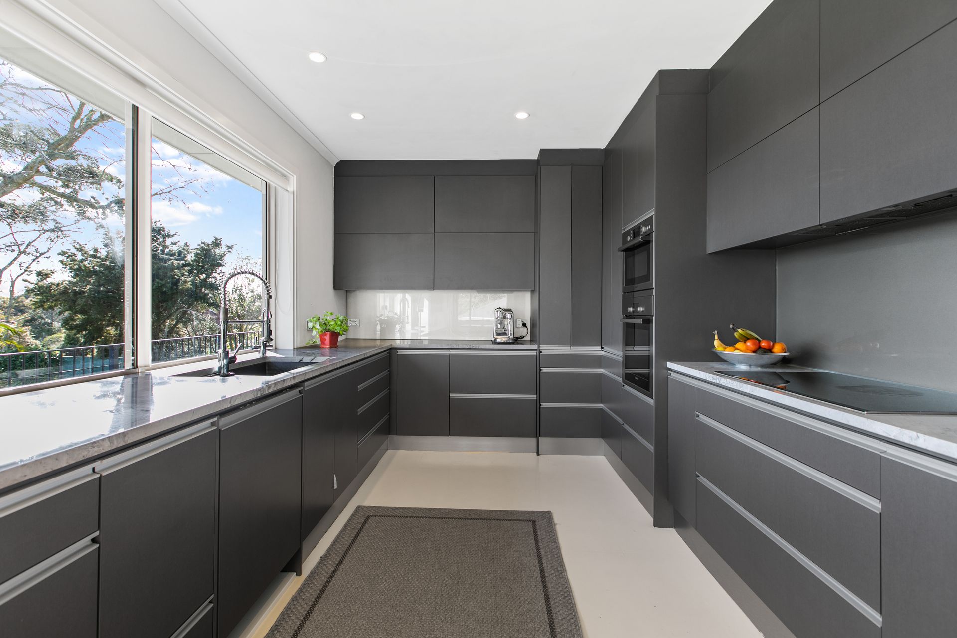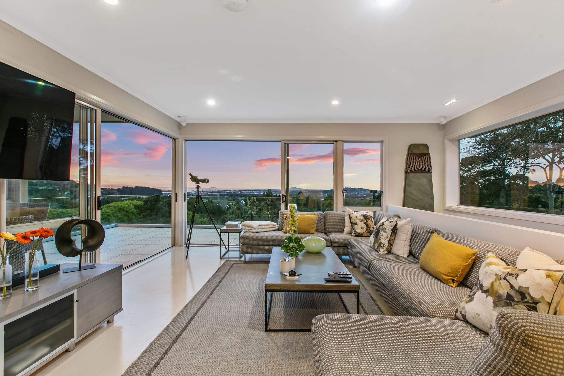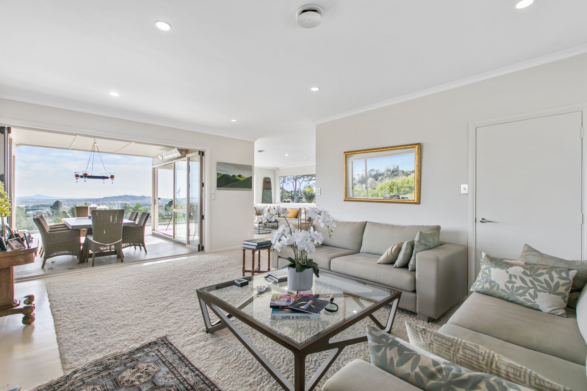 At the heart of the home, you'll find a light-filled and spacious open-plan designer kitchen with sleek cabinetry and European appliances, leading out into the dining and living room, which in turn spill out onto a covered deck that allows for year-round relaxing, al fresco dining and easy entertaining. From your elevated position on the deck you will enjoy verdant views as far as the eye can see. A roomy separate lounge also spills out onto the deck and is flooded by sunlight.