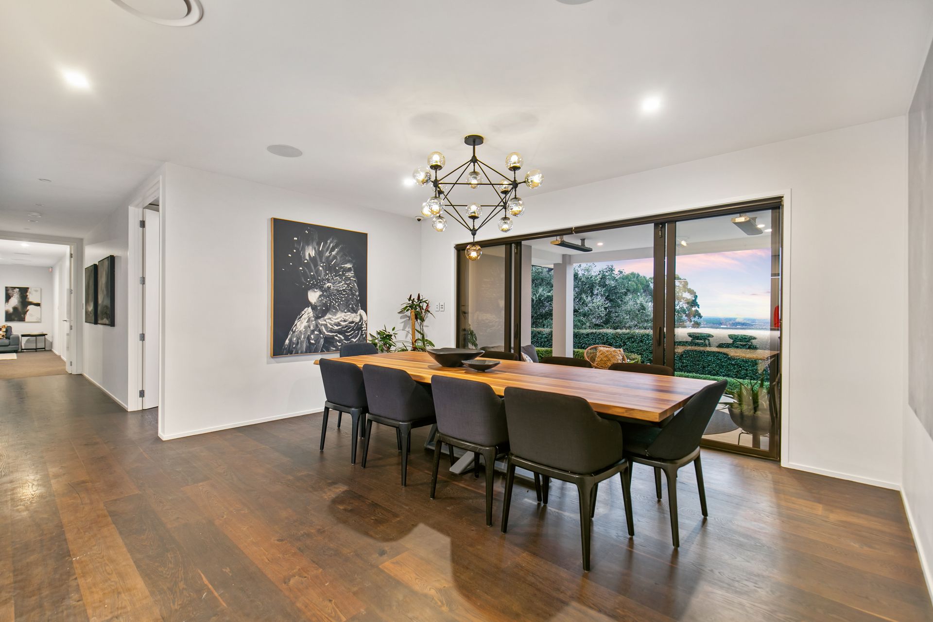 Flowing from bench to table, the dining area runs in parallel and leads directly out to a covered area to enjoy the lush surroundings no matter the season. Flanked by spacious living areas on both sides, take your pick depending on the occasion.