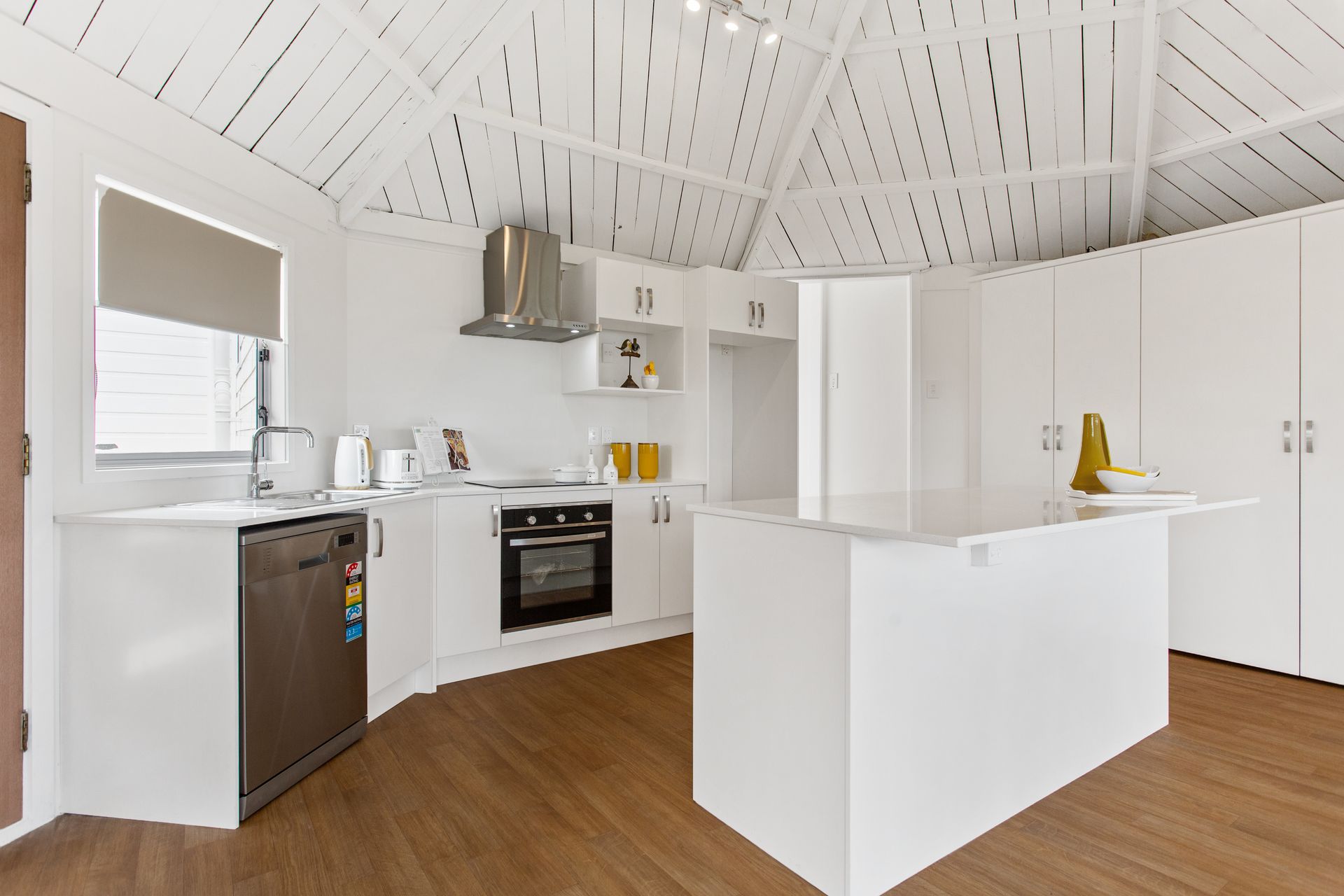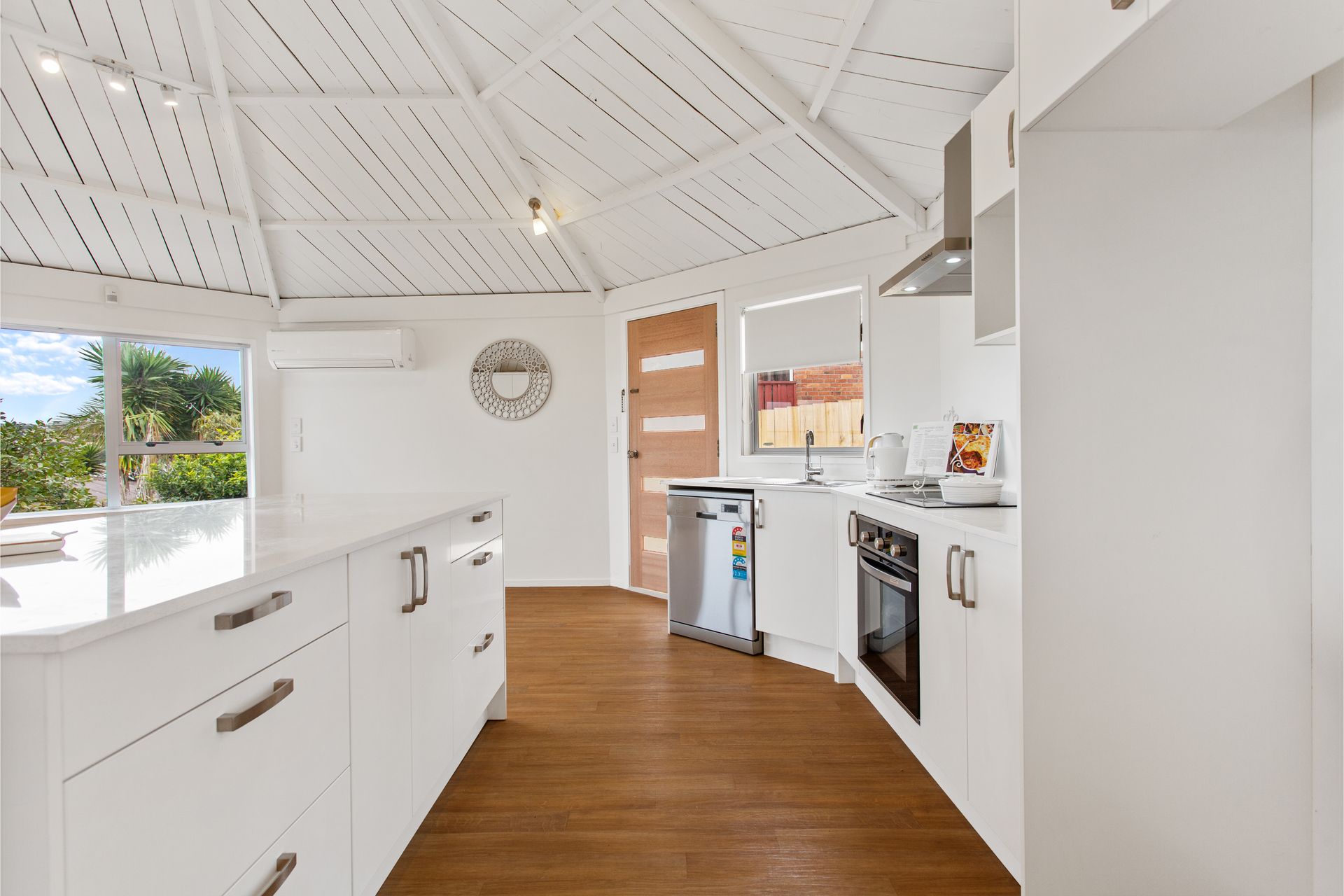 Modern kitchen reposed beneath segmented ceilings interfaces seamlessly over a central island with spacious open plan living and promenade-styled sunroom flanked on both sides by dual decks.