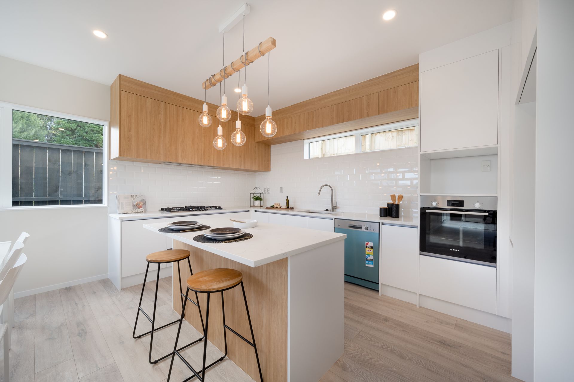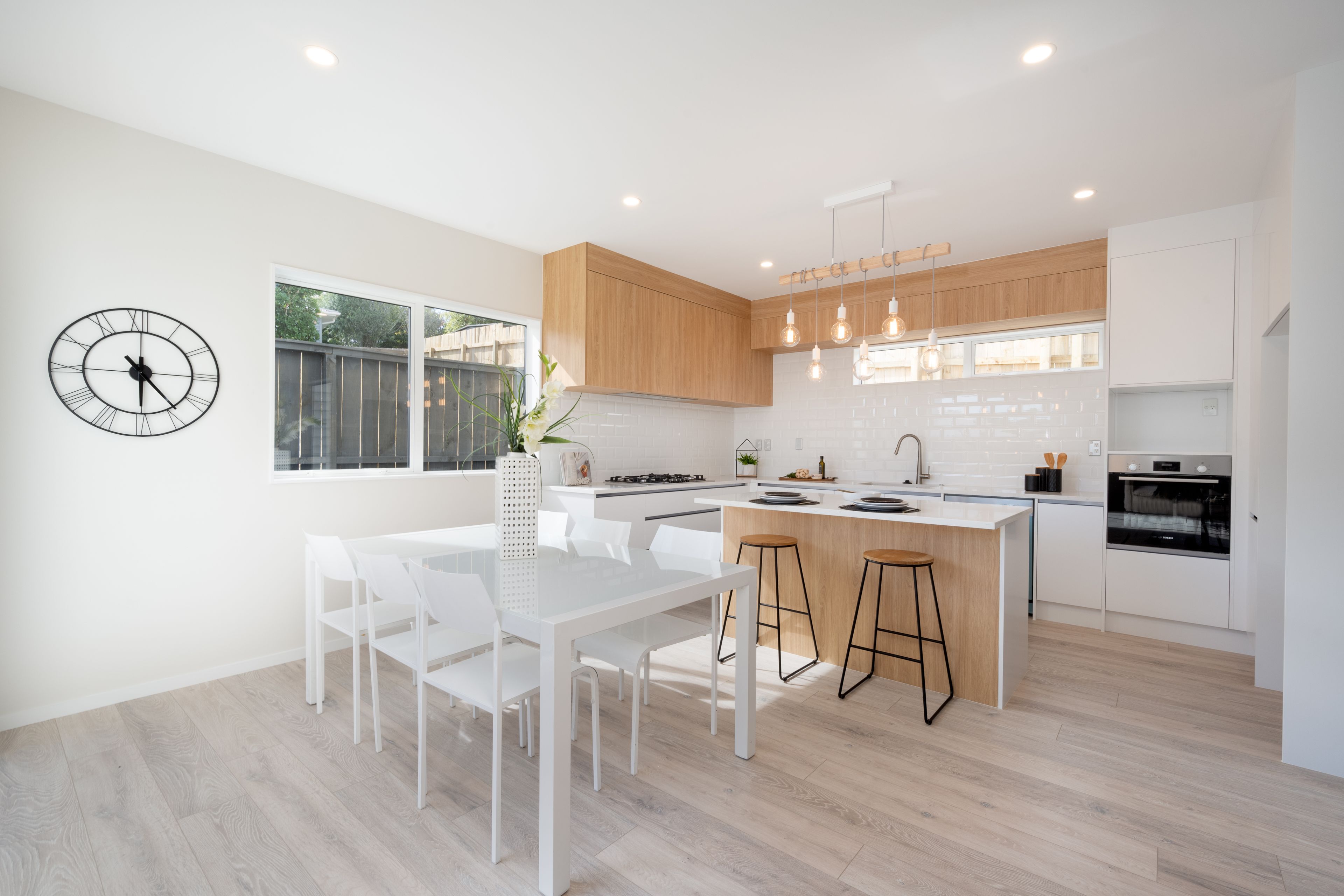 On the ground floor, the fabulous light and bright open plan kitchen contains quality appliances including a gas cooktop and features beautiful laminate flooring. With the dining room adjoining this, you can easily keep an eye on the kids or interact with guests as you whip together a meal.