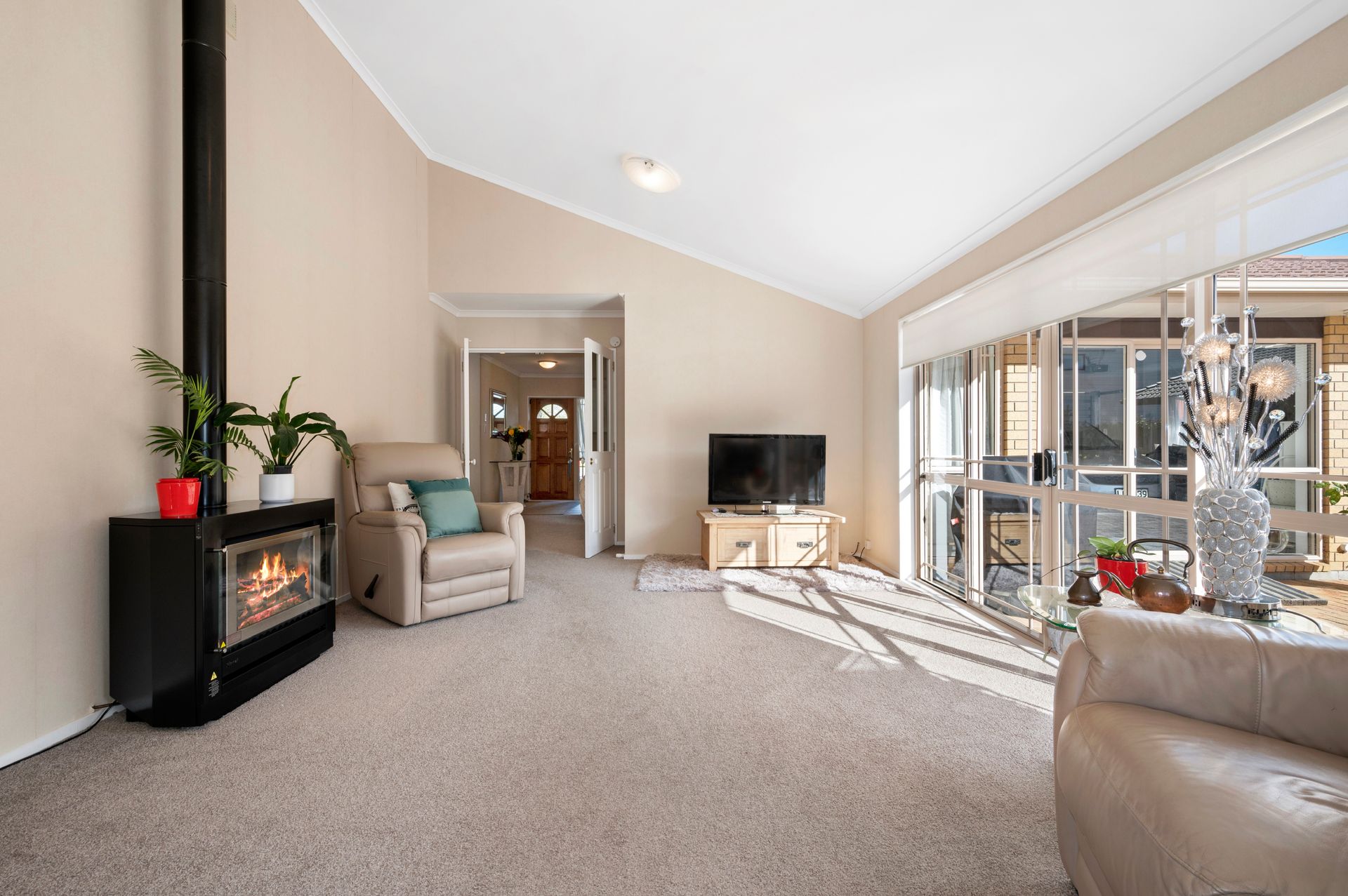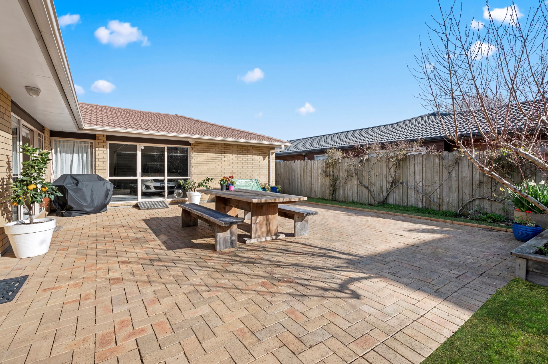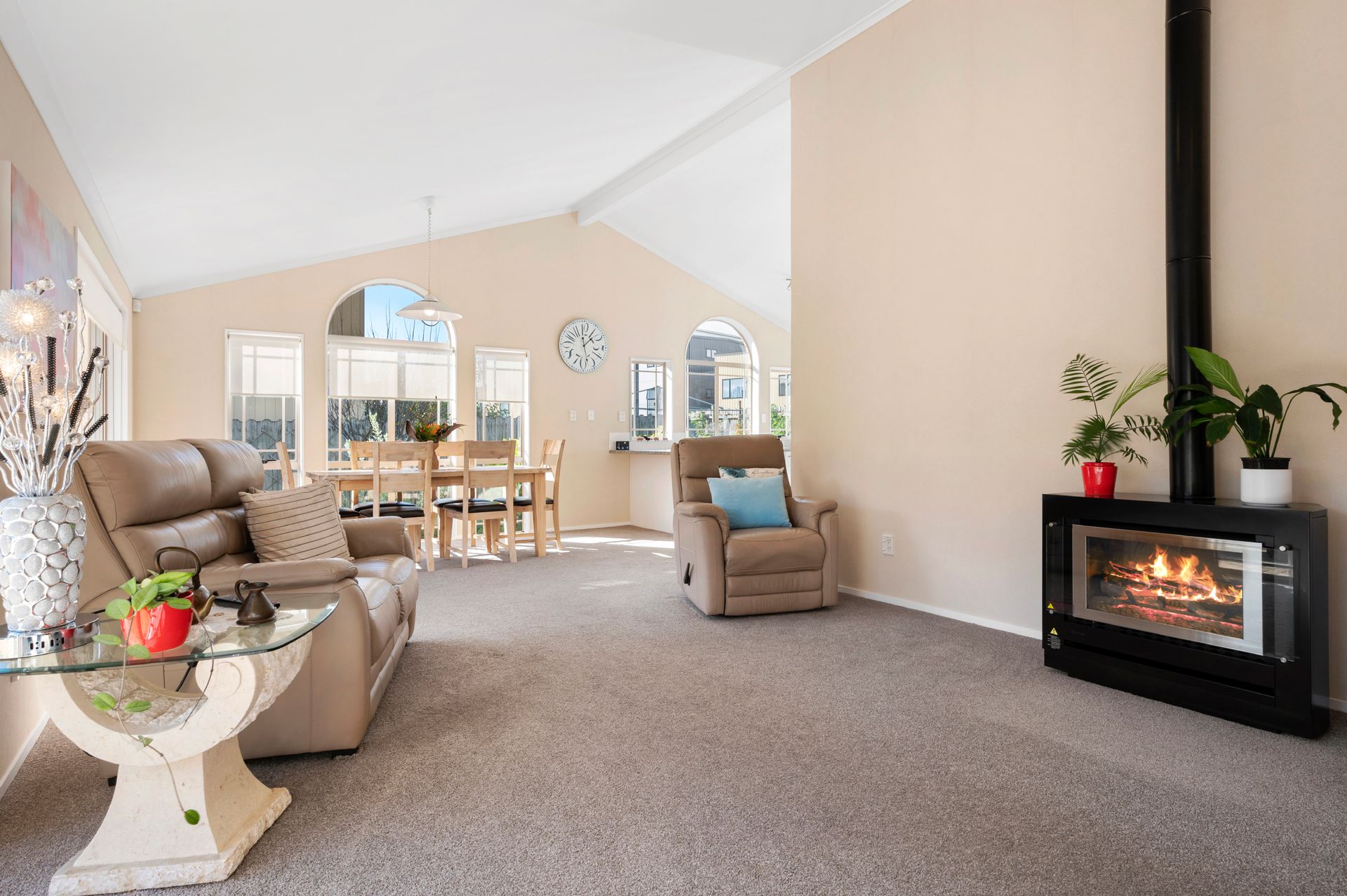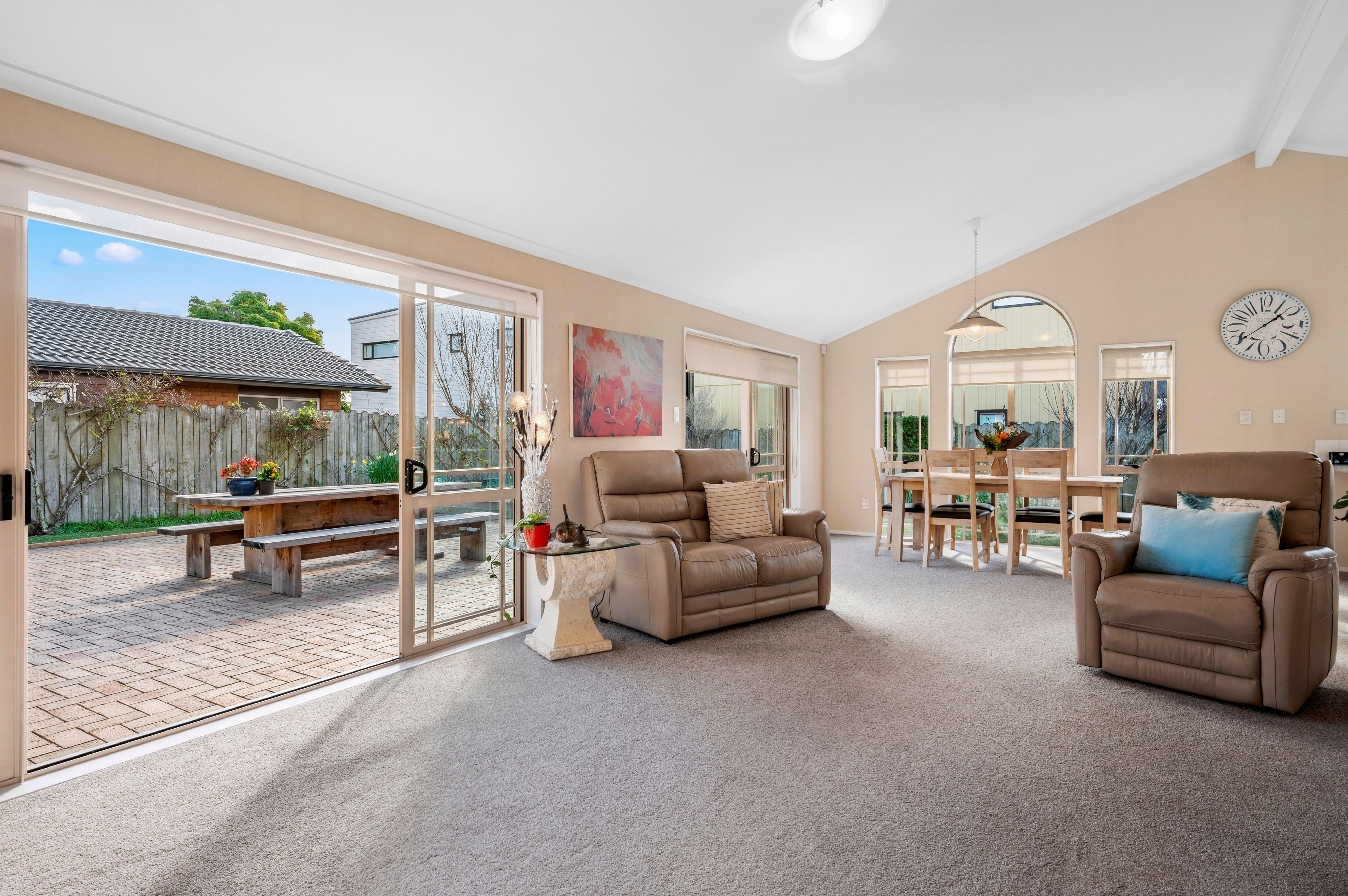 The open-plan kitchen, living and dining room is an inviting social setting, laden with natural light and kept cosy by a gas fire. Sliding doors expand your space out to a sizeable patio, with the 562m2 site also showcasing manicured grounds with a wide variety of fruit trees, including Pear, Apple, Plumcot, Peach, Lemon and there's even a Grapevine, you don't have far to go for breakfast.