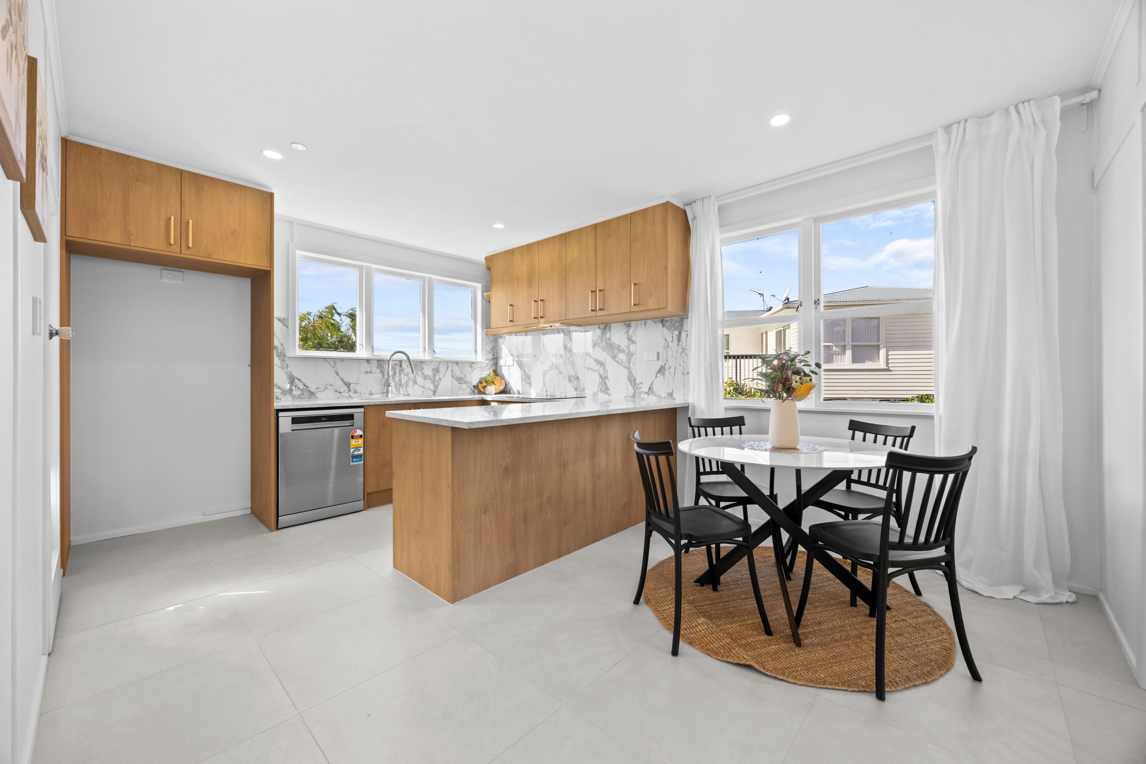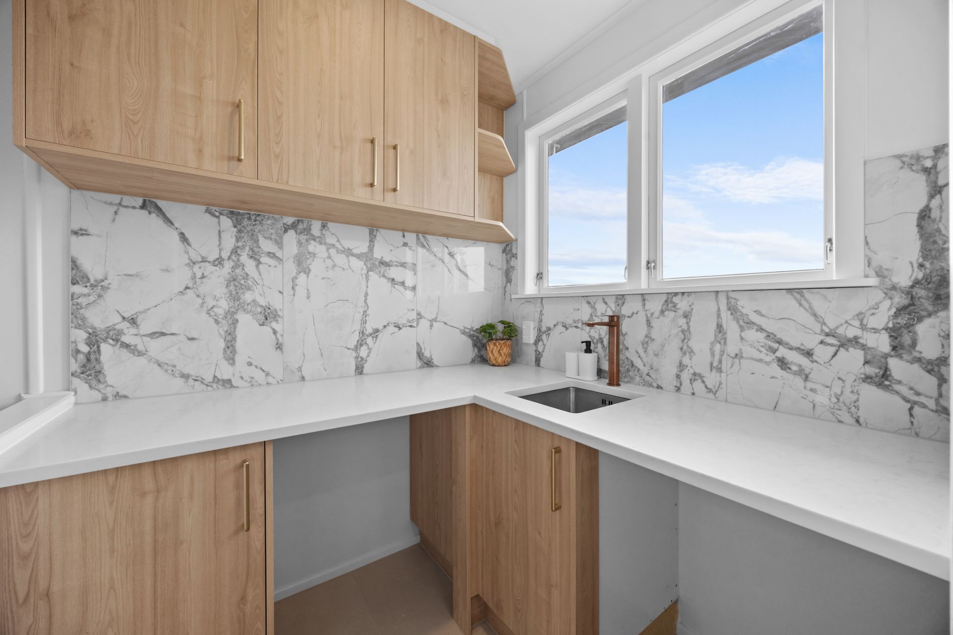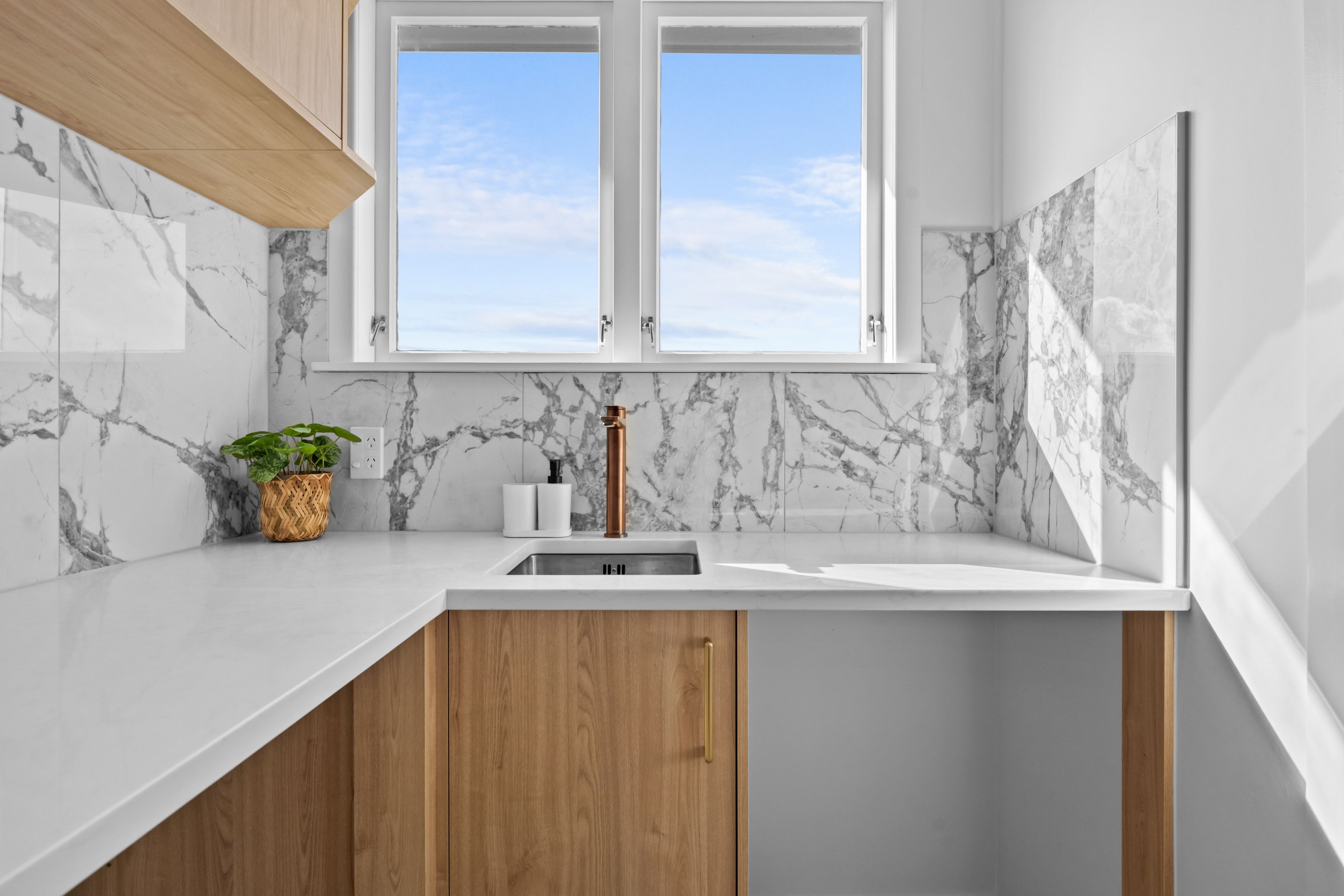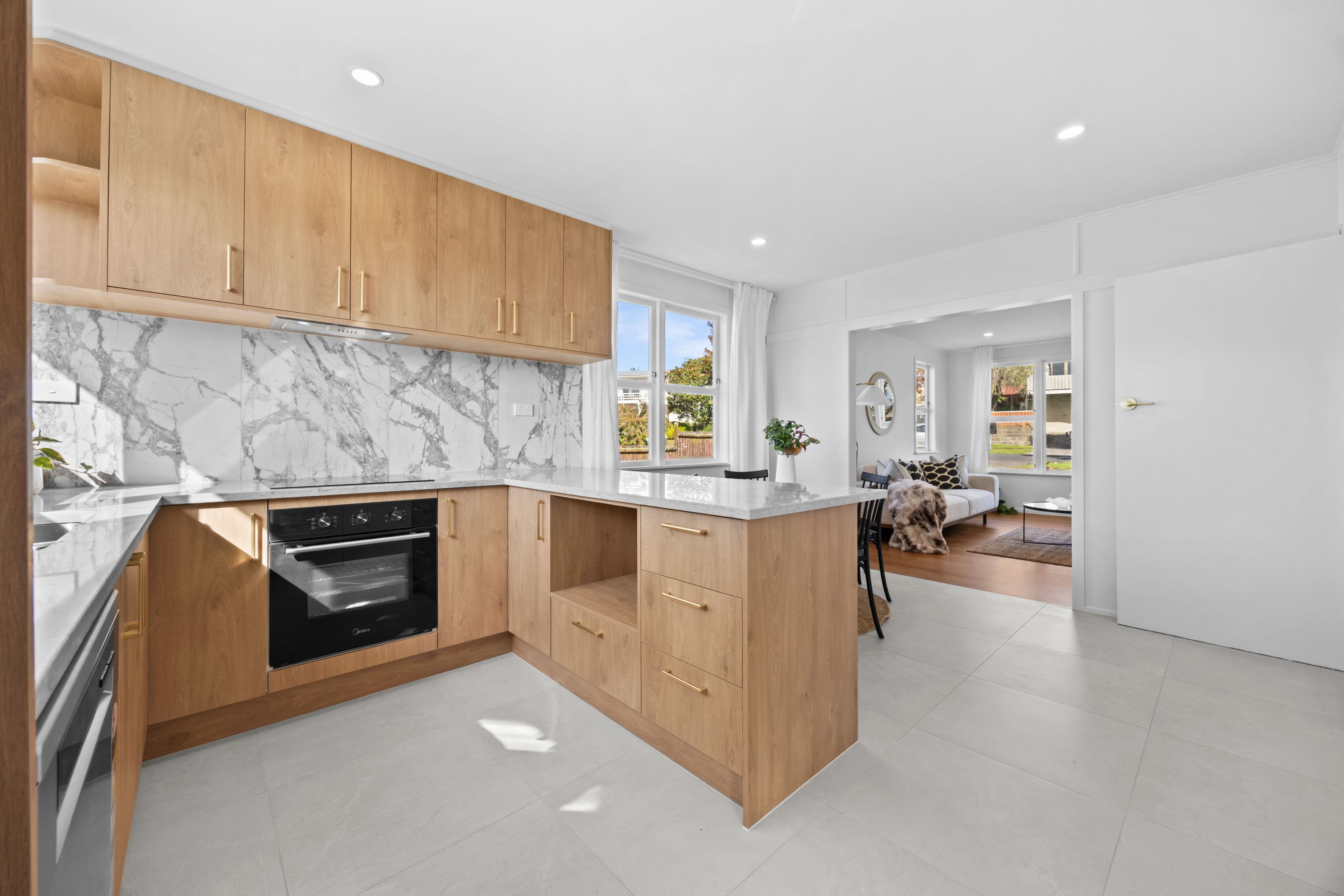 A brand-new kitchen anchors the living space, finished with engineered stone benchtops and a full-height Italian-tiled splashback, paired with quality appliances and brushed brass detailing that carries through the home.