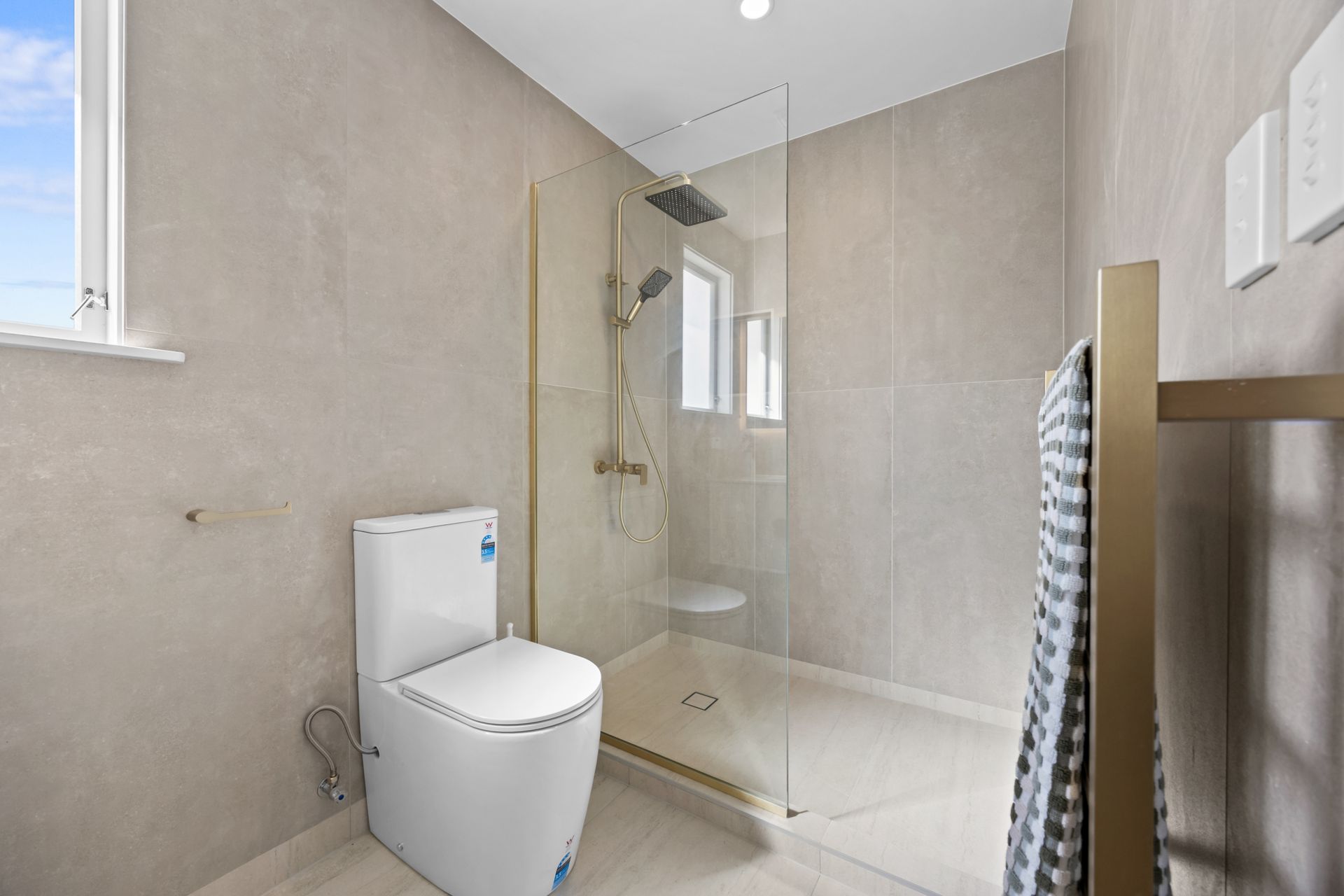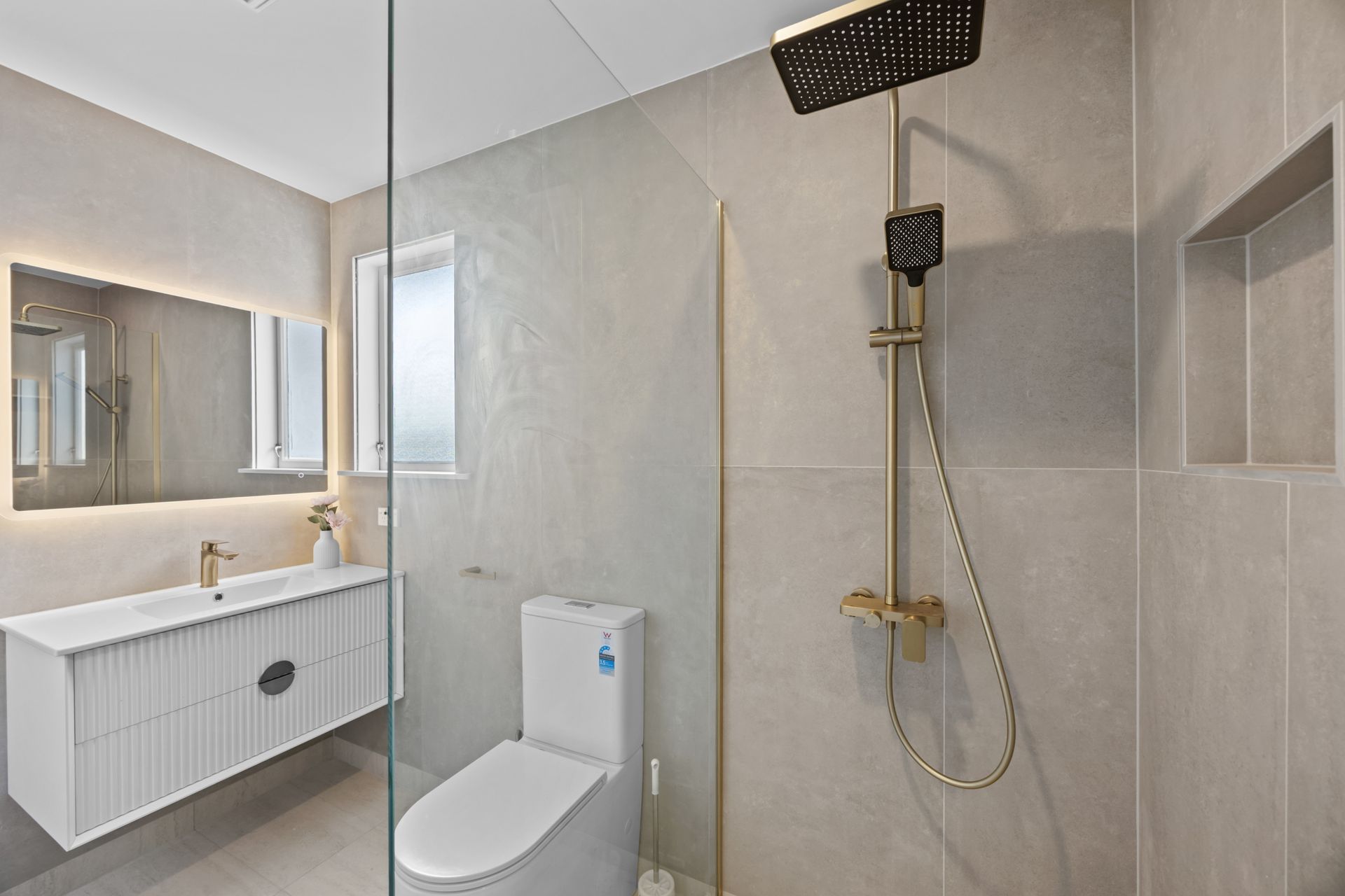 The bathroom has been fully upgraded, featuring floor-to-ceiling tiling, sleek vanities, and quality fittings that give a subtle, high-end feel without overdoing it.