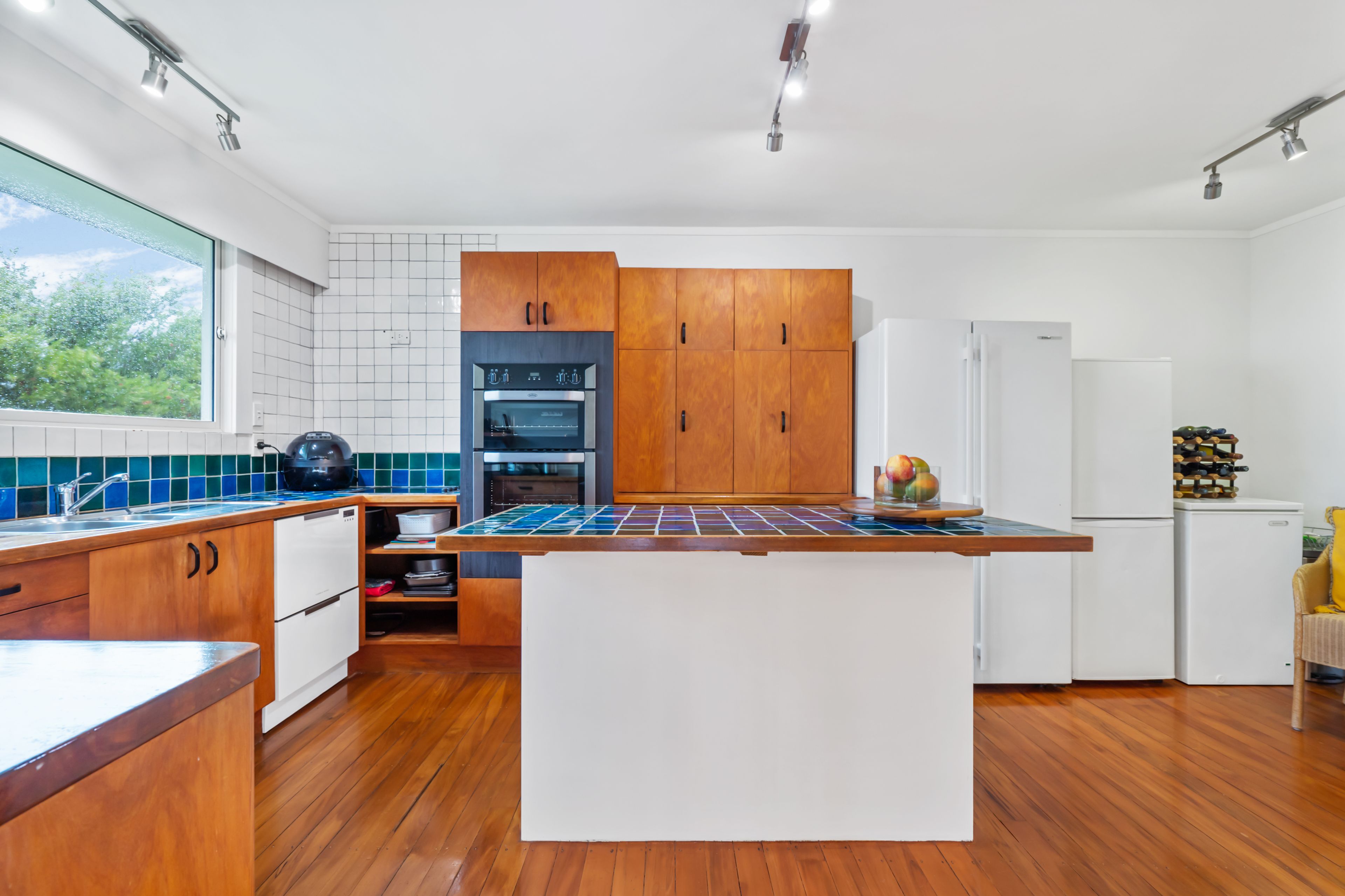 The extra-large kitchen provides ample storage and space for 3 fridges as well as a centre