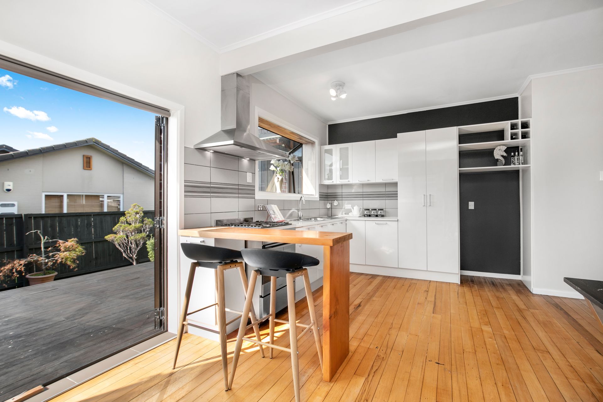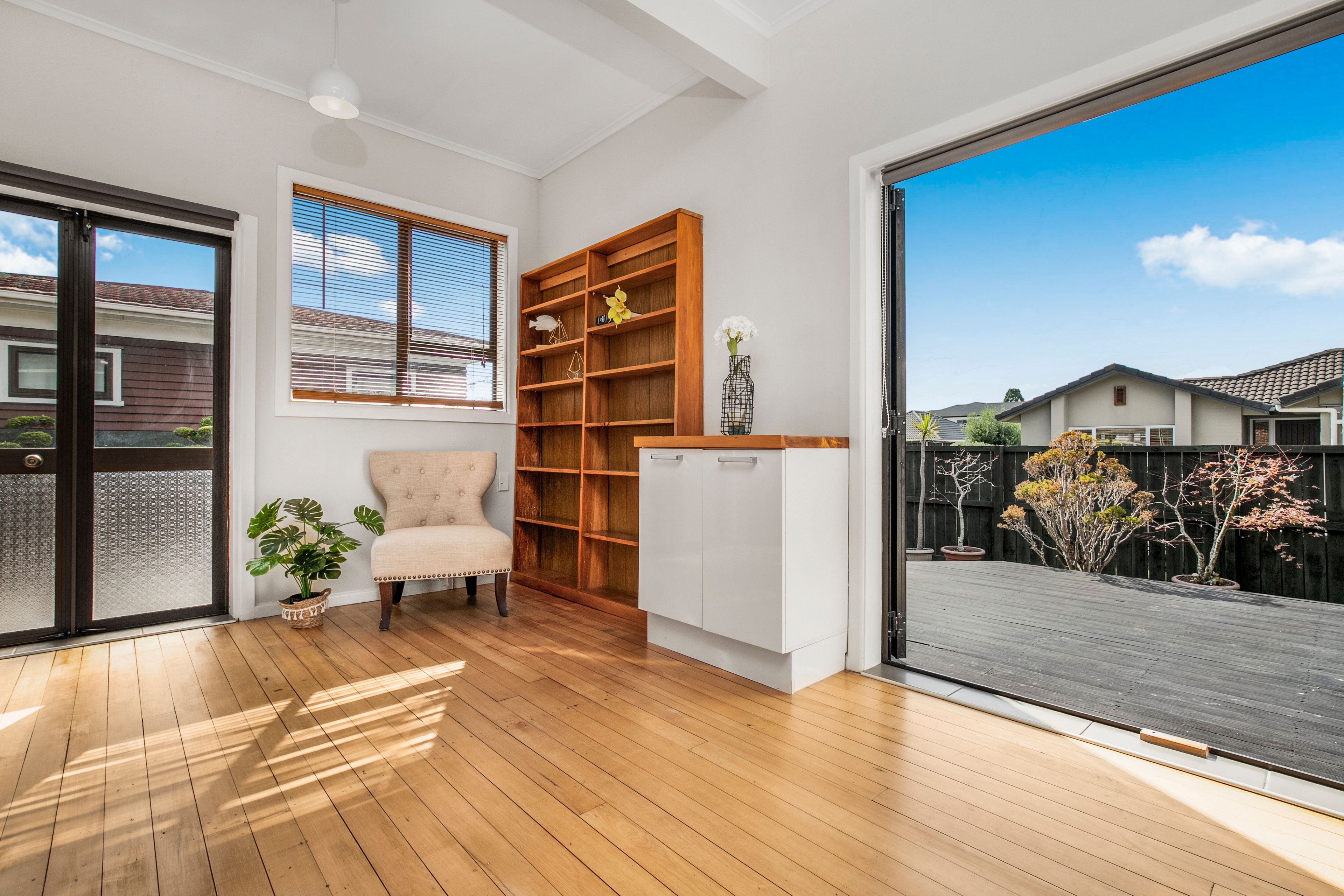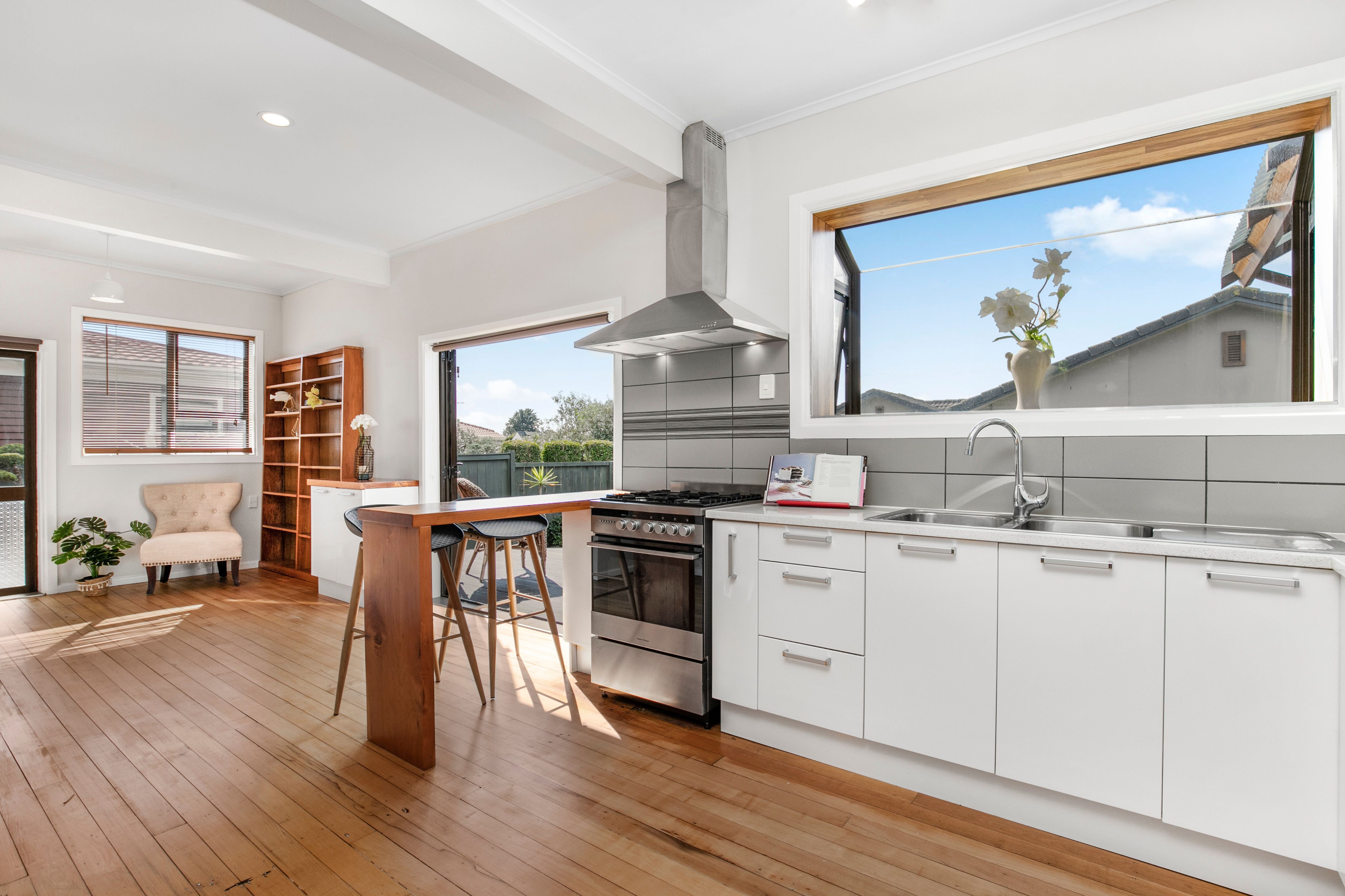 The bright kitchen and dining area welcome family time. Choose between casual, quick meals at the breakfast bar or come together around the table; the choice is yours. Opening up to the deck, you can embrace the fully-fenced and easy-care garden at every opportunity.