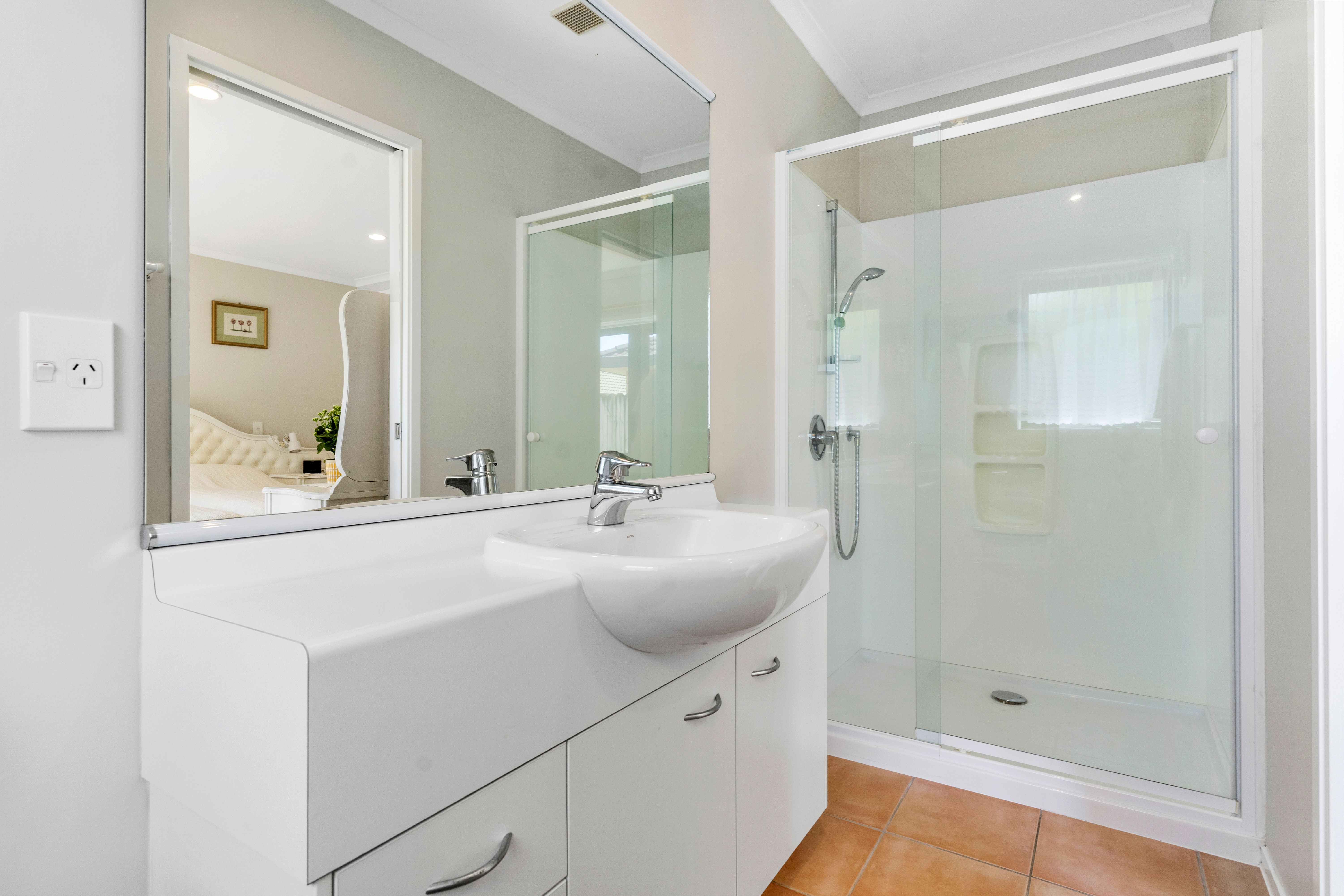 The main bathroom features a shower and full-size bath and services three double bedrooms, each with its own built-in wardrobes. The spacious master bedroom is complemented by a modern en-suite with a well-lit vanity, ensuring a smooth start to your day.