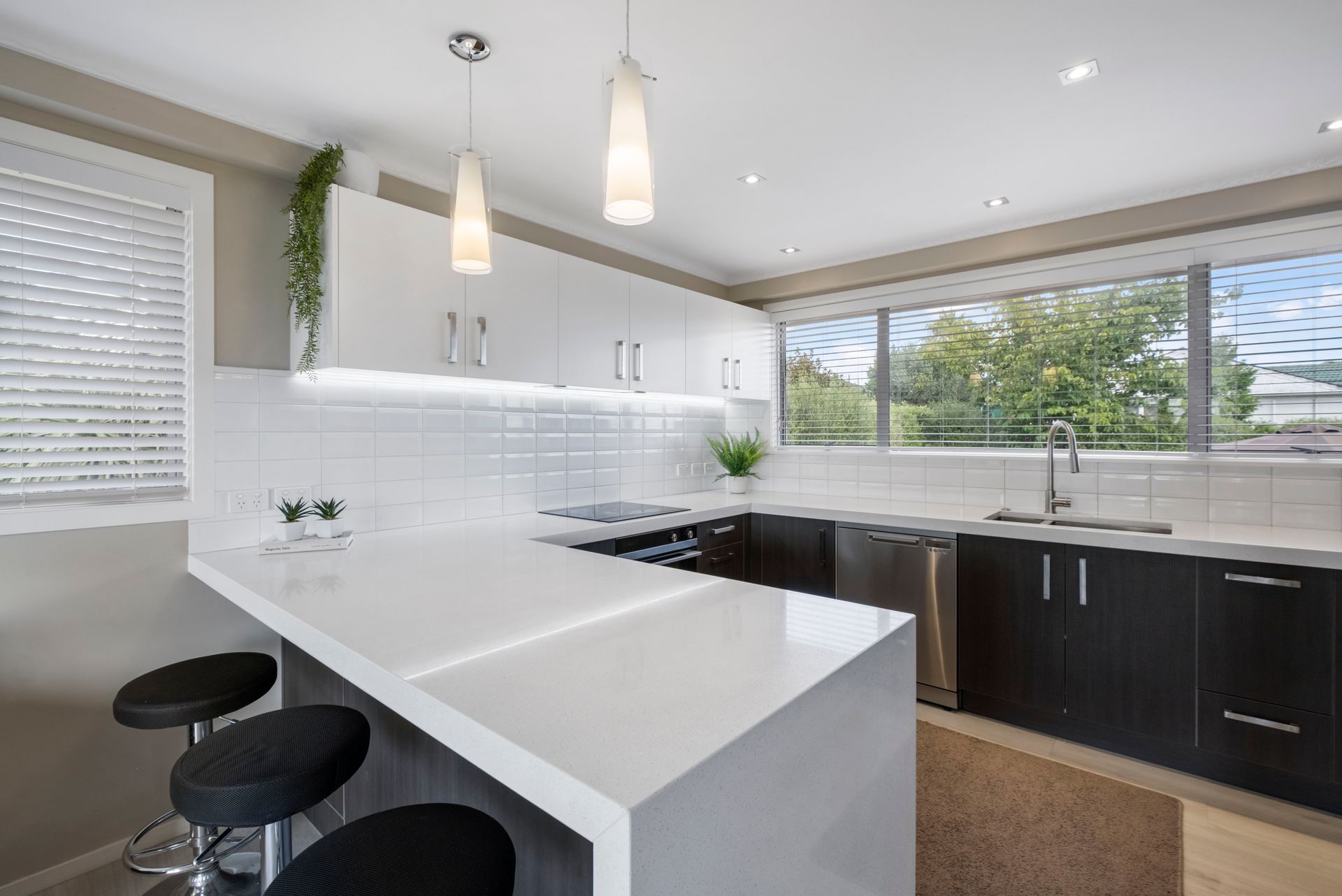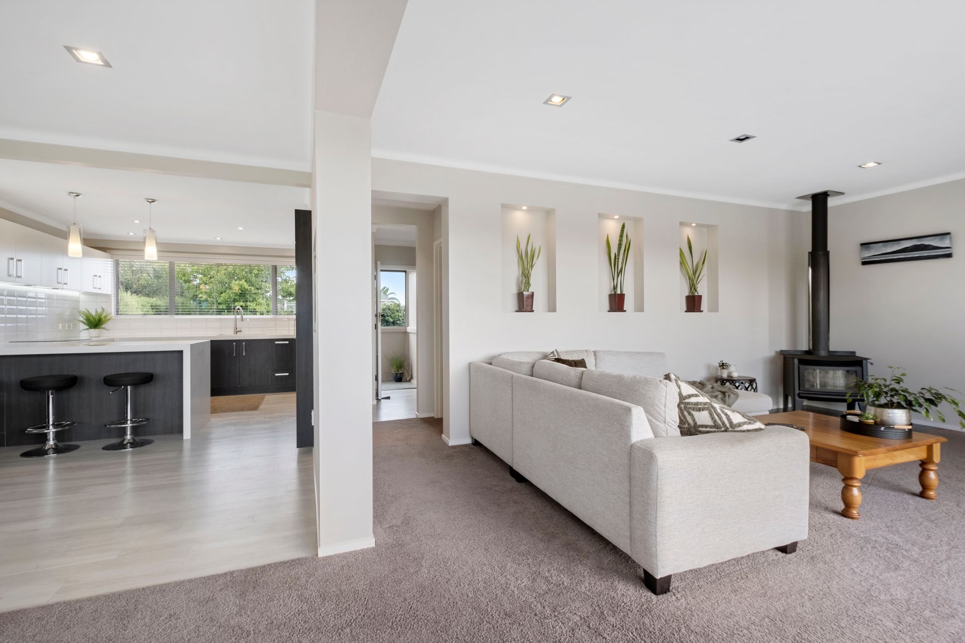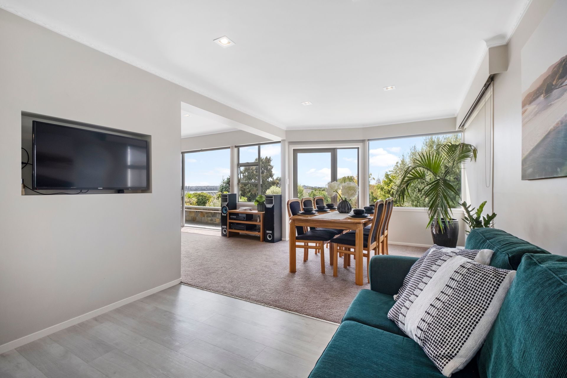 Upstairs, the kitchen is modern contemporary, offering an open plan living and dining soaking views of the Rotary Walkway from the elevated position. Four bedrooms are tucked away in the same wing of the house, and the master bedroom has a small en-suite for extra convenience.