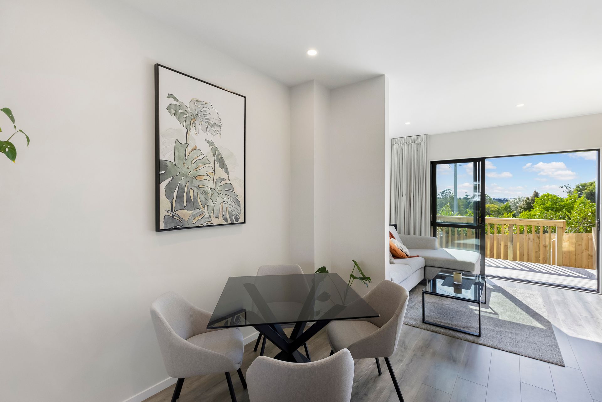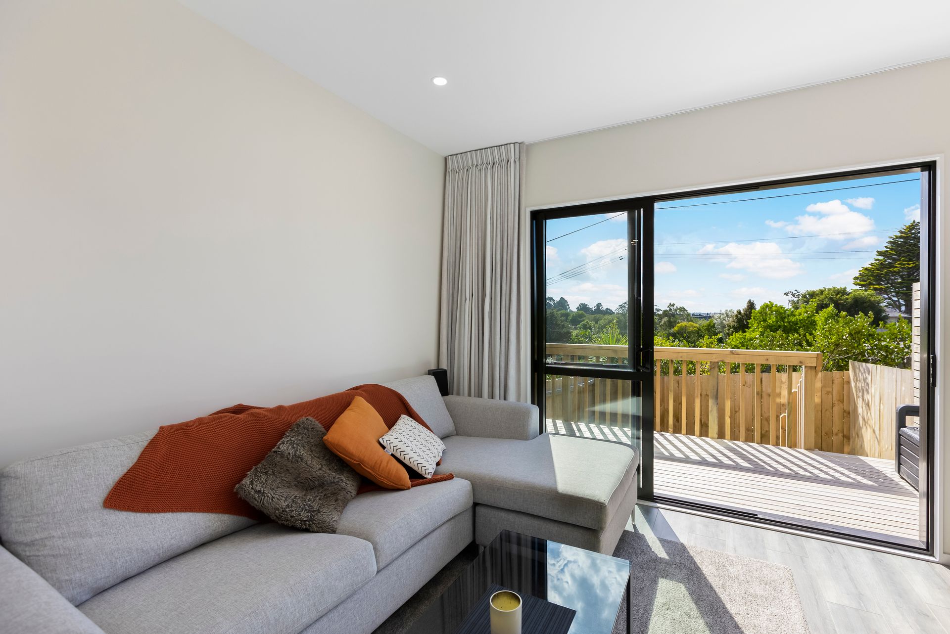 * Airy, open plan living, dining, kitchen with guest toilet on the ground level, flowing to a private deck