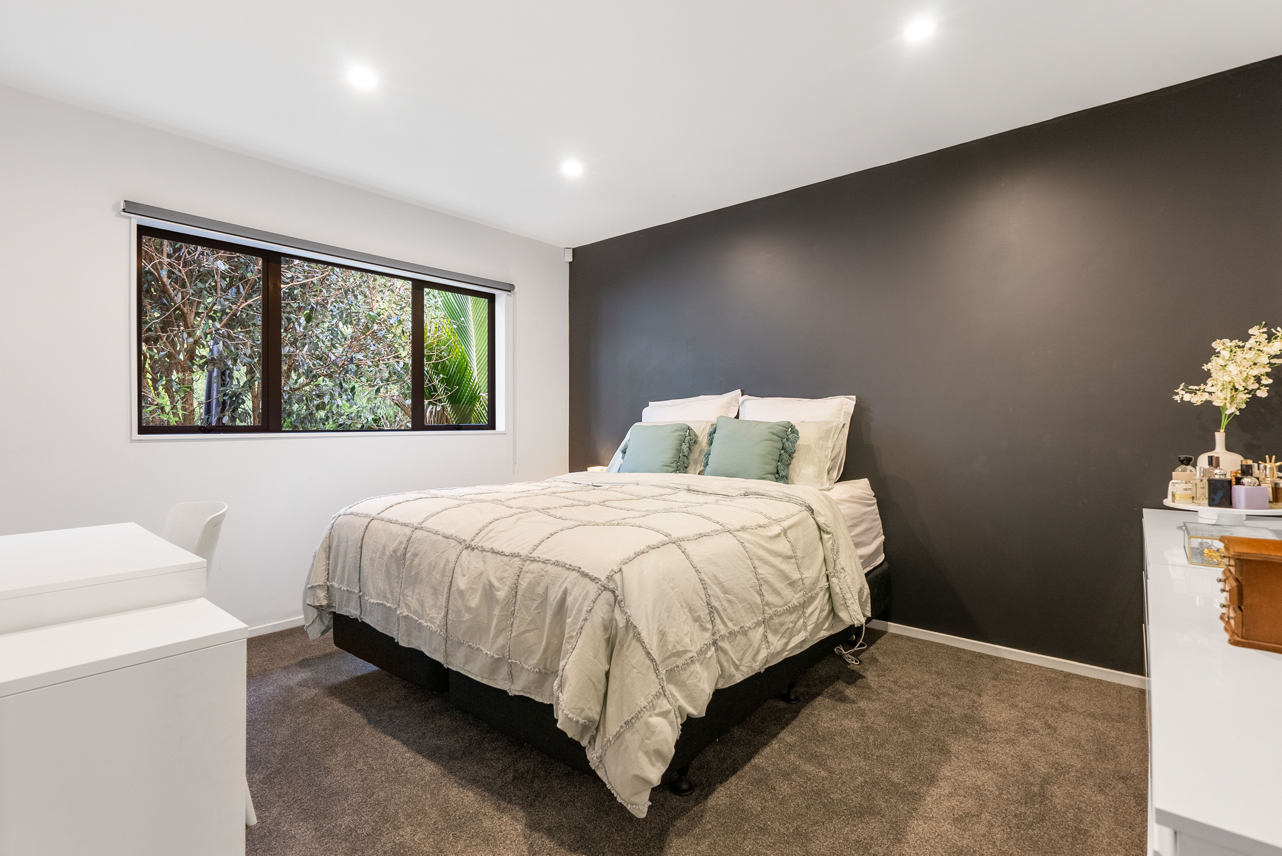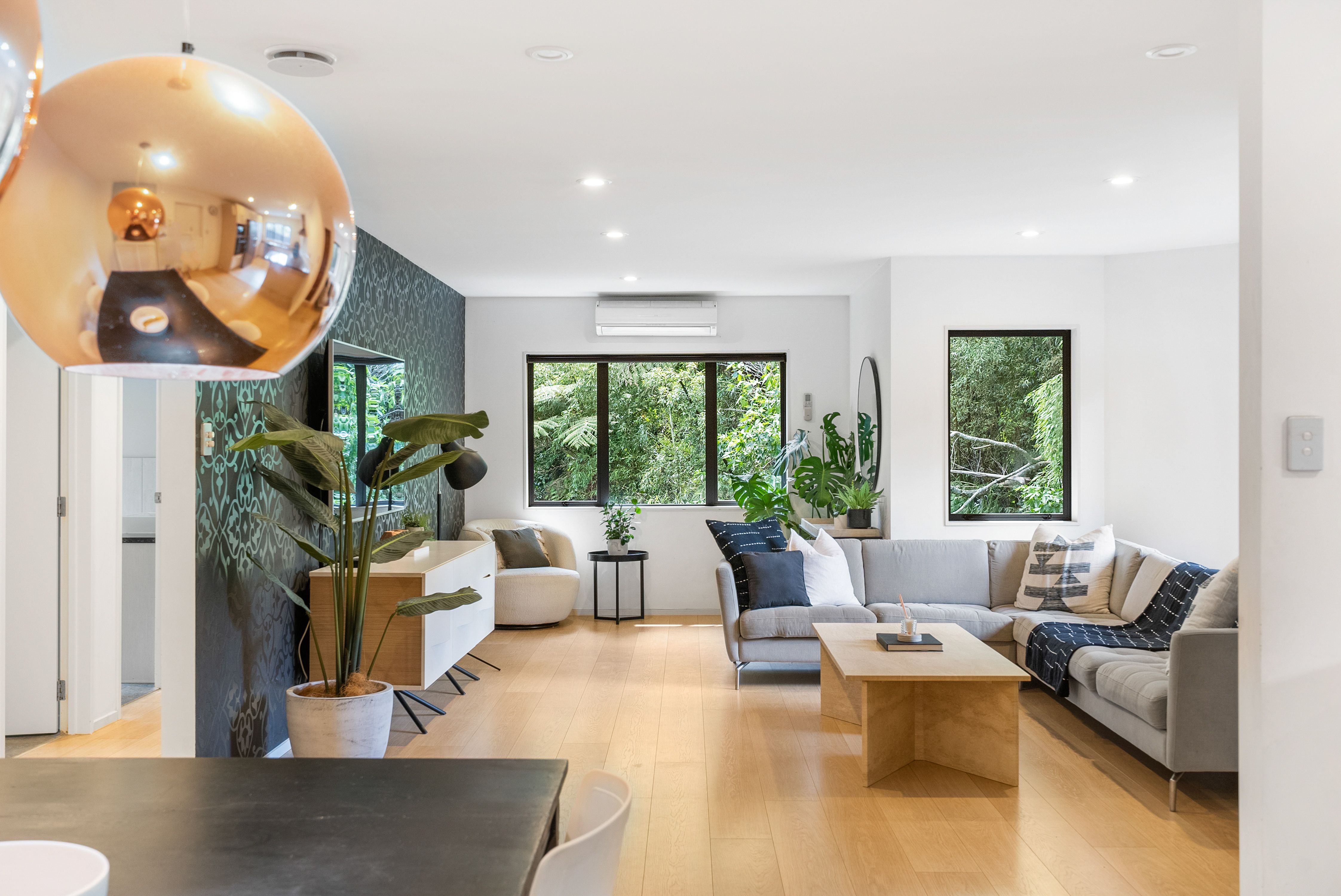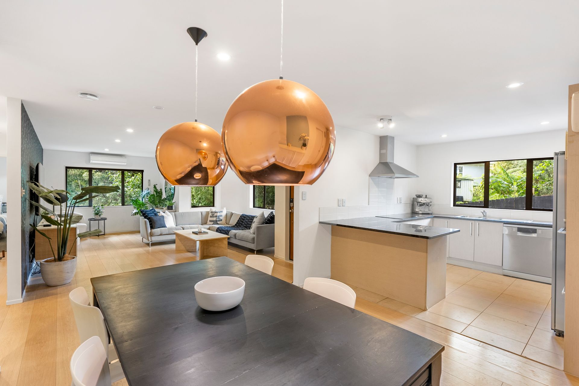 At the end of a cul de sac and backing on to NZ native bush, a private and quiet home awaits. Spread across a single level you are welcomed into this stylish home with a bright and airy open plan living room with hardwood floors. A gorgeous dining area with feature pendant lighting to really set the mood, and the kitchen… it's a dream, with stainless steel appliances, lots of bench space and plenty of storage, perfect for whipping up delicious meals and entertaining guests. Everywhere you look you're surrounded by the tranquillity of nature, creating a very calm and inviting atmosphere to enjoy.