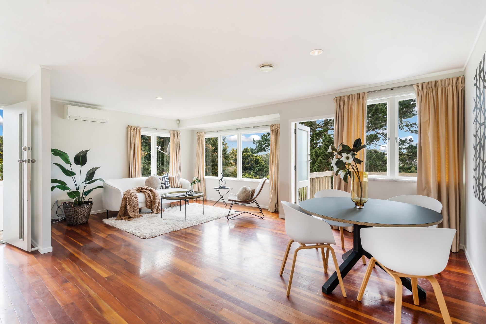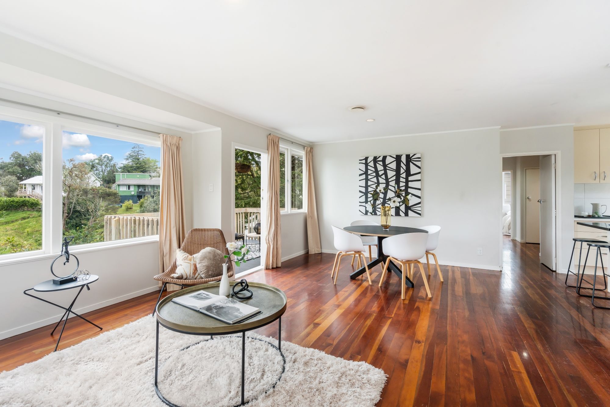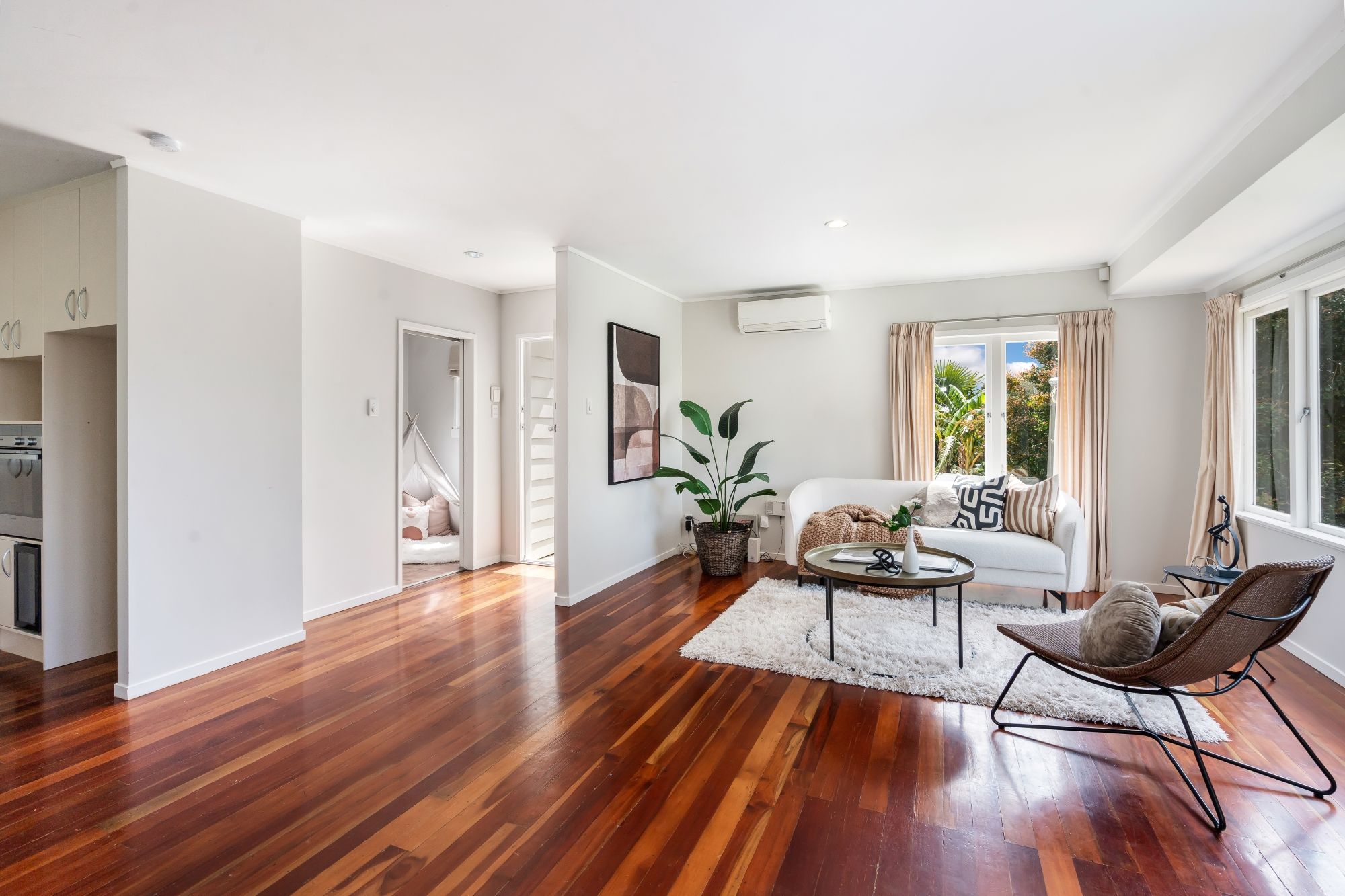 Inside, you'll discover timeless Matai wooden floors that exude elegance and warmth, creating an inviting atmosphere throughout. The heart of the home is a bright, open-plan living space connecting the kitchen, dining, and living areas.