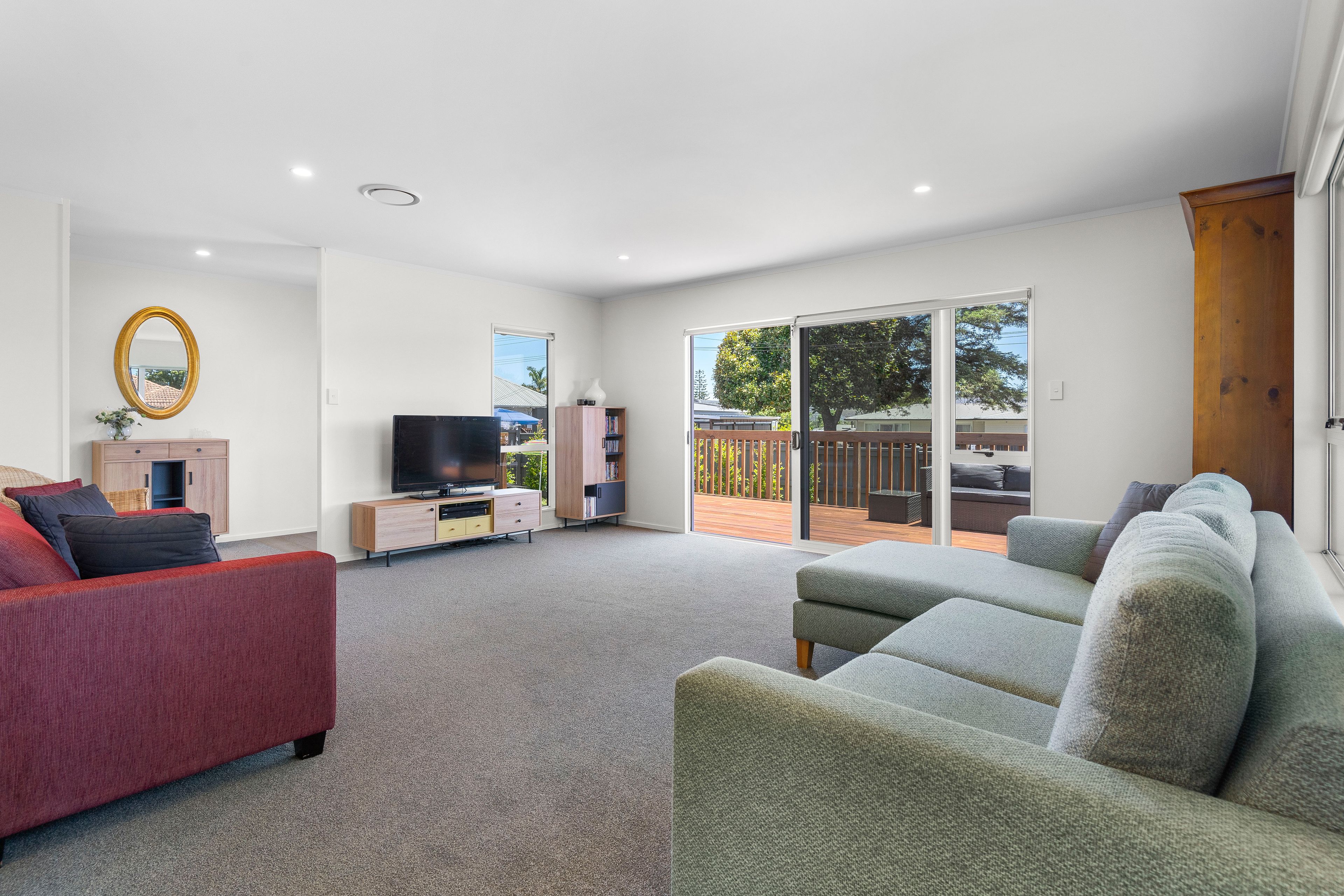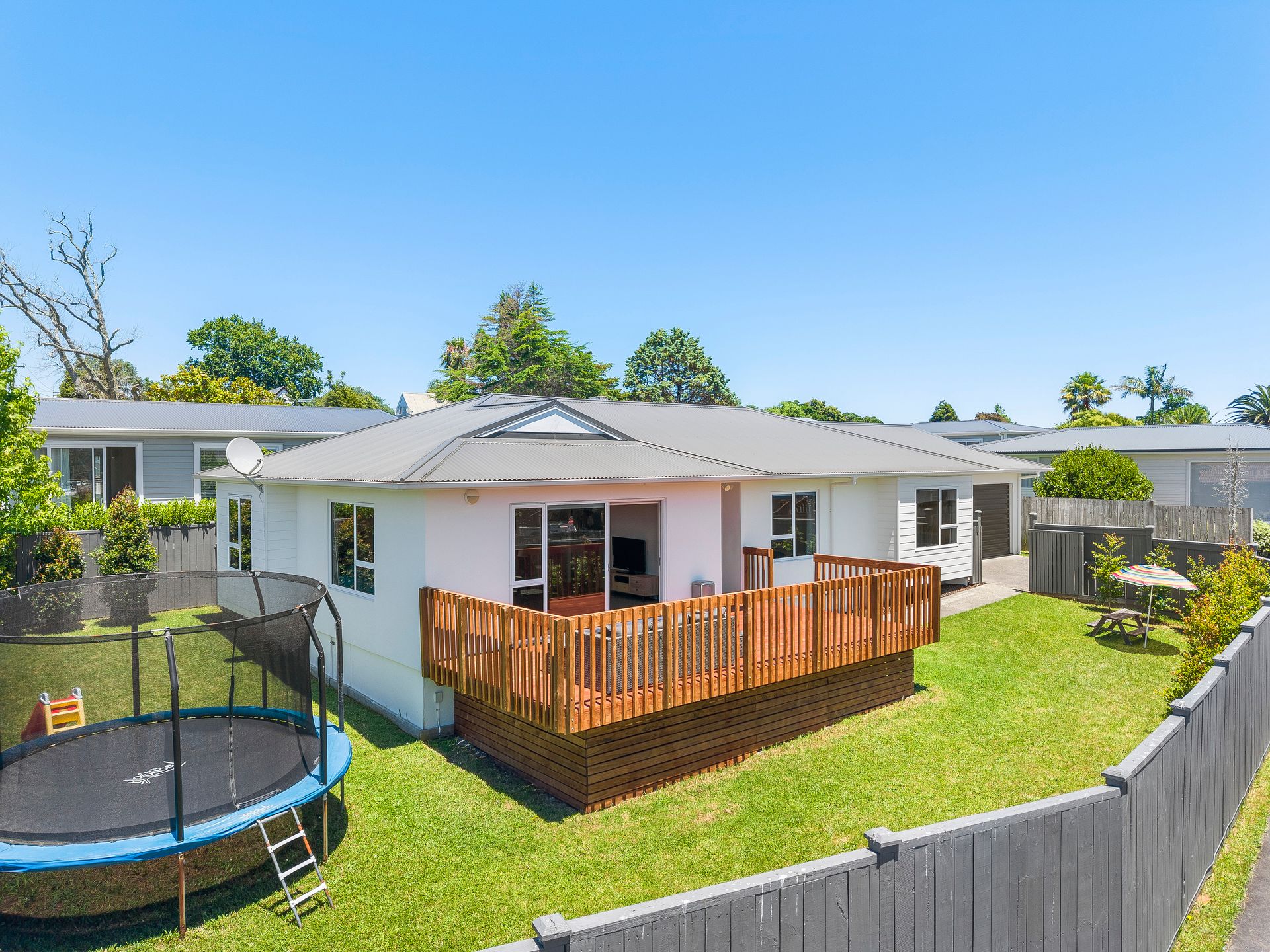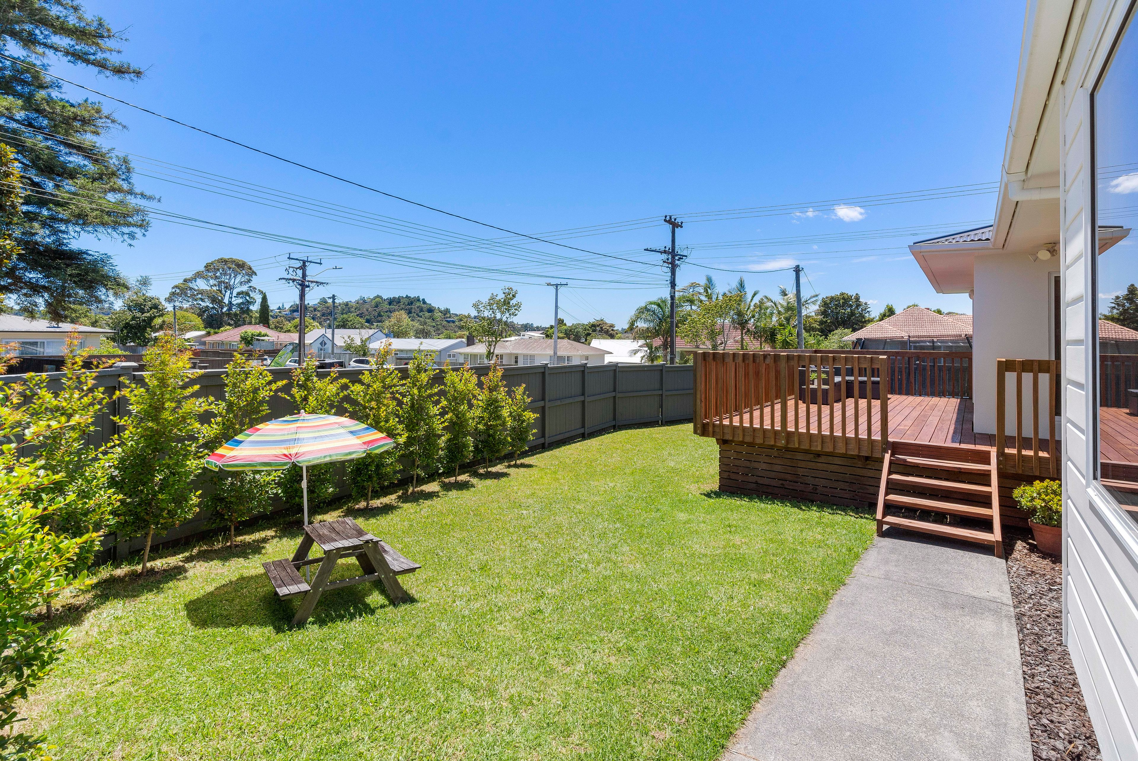 Indoor-Outdoor living at its best! Step outside to sunny decking, ideal for hosting BBQs, sipping morning coffee, or soaking up the sunshine. The fully fenced, near-flat lawn provides a safe & secure space for children & pets to play freely.