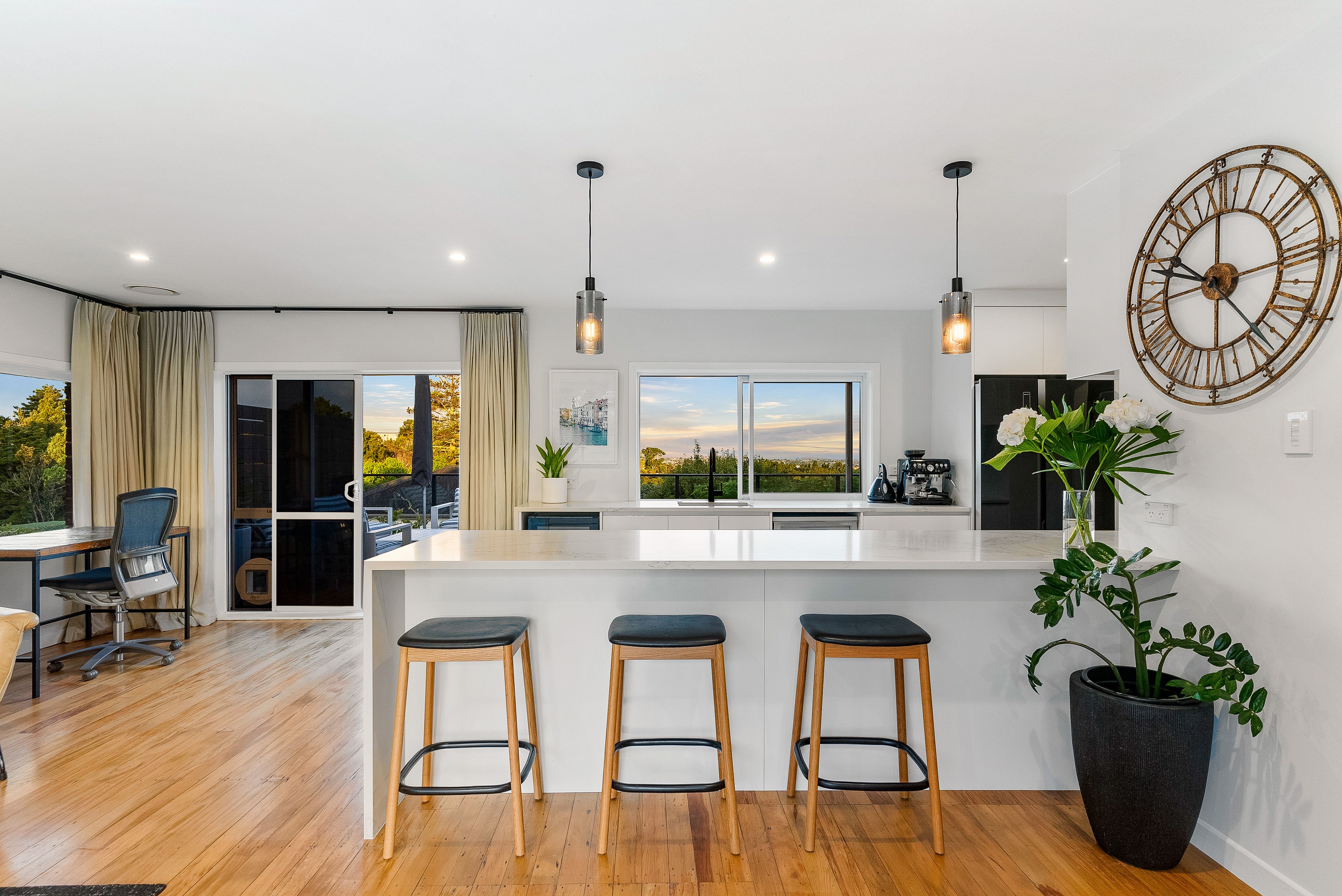 The water and skyline views are out-the-gate spectacular and best enjoyed from the entertainer's deck overseeing the backyard. Light-saturated, tastefully refreshed-including the modernised kitchen and bathroom-and finished with all the bells and whistles that make a home inviting year-round, there's nothing to do but unpack and unwind.