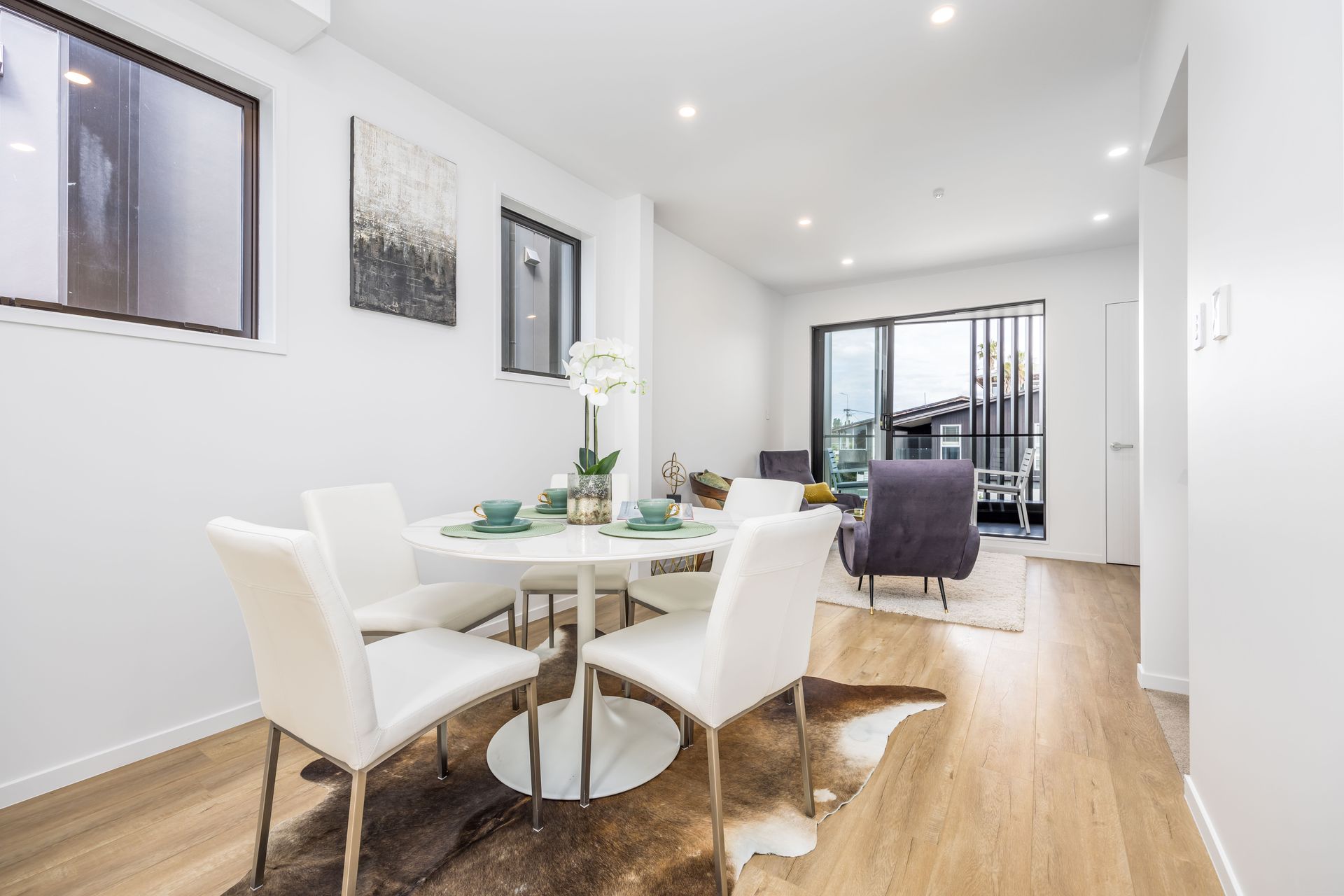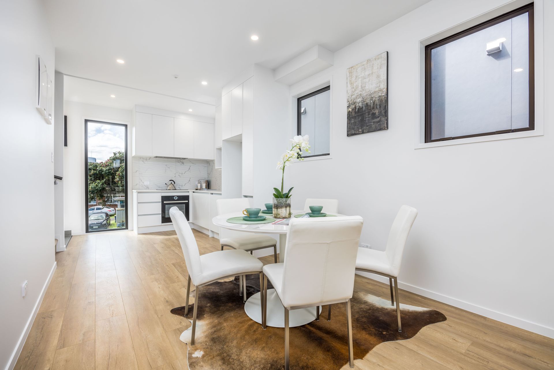 This three-level townhouse features 3 bedrooms, 2.5 bathrooms, an open-plan kitchen/dining/living area, balcony from living and bedroom, and dedicated car park. Modern design elements like stone kitchen benchtops add sophistication.