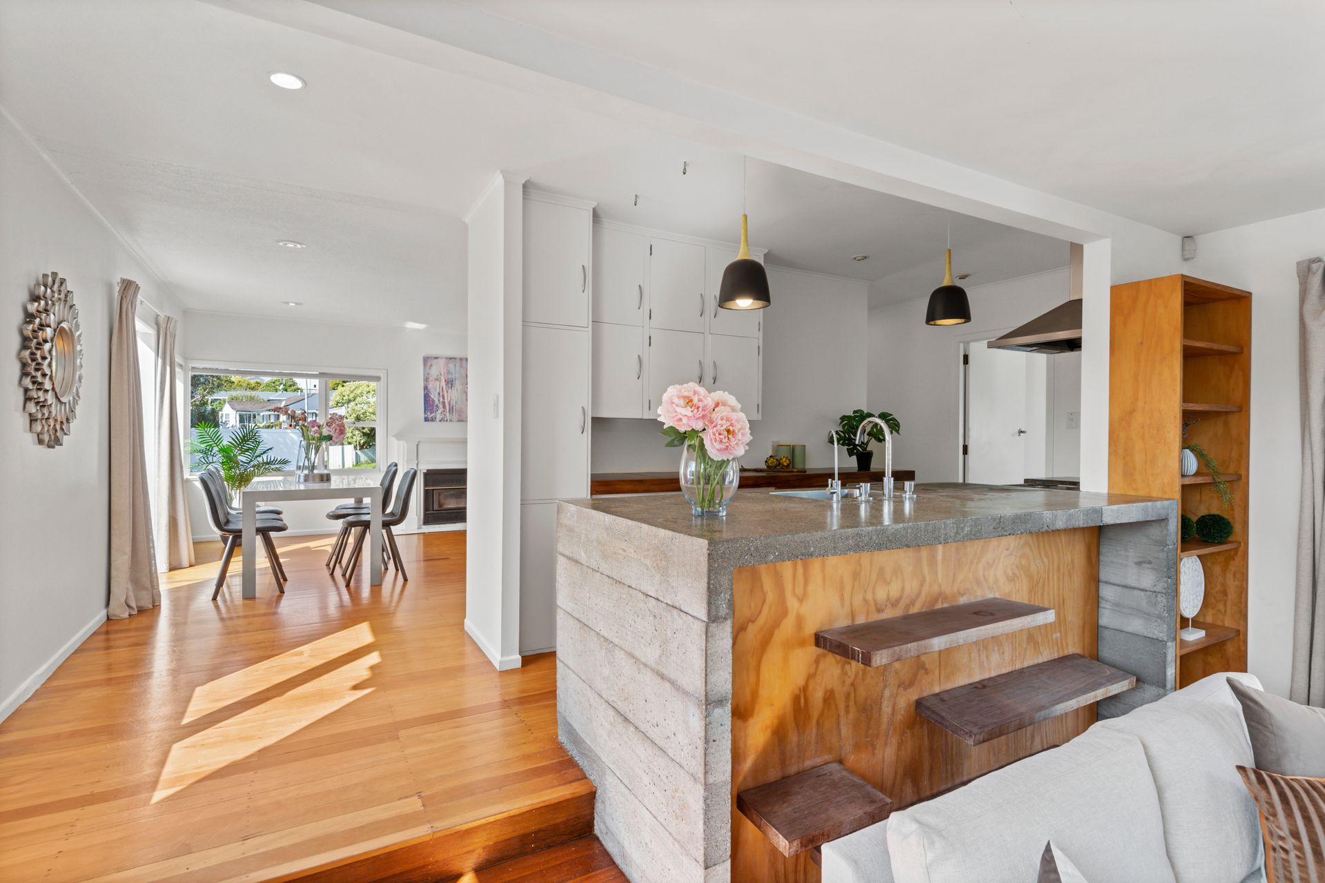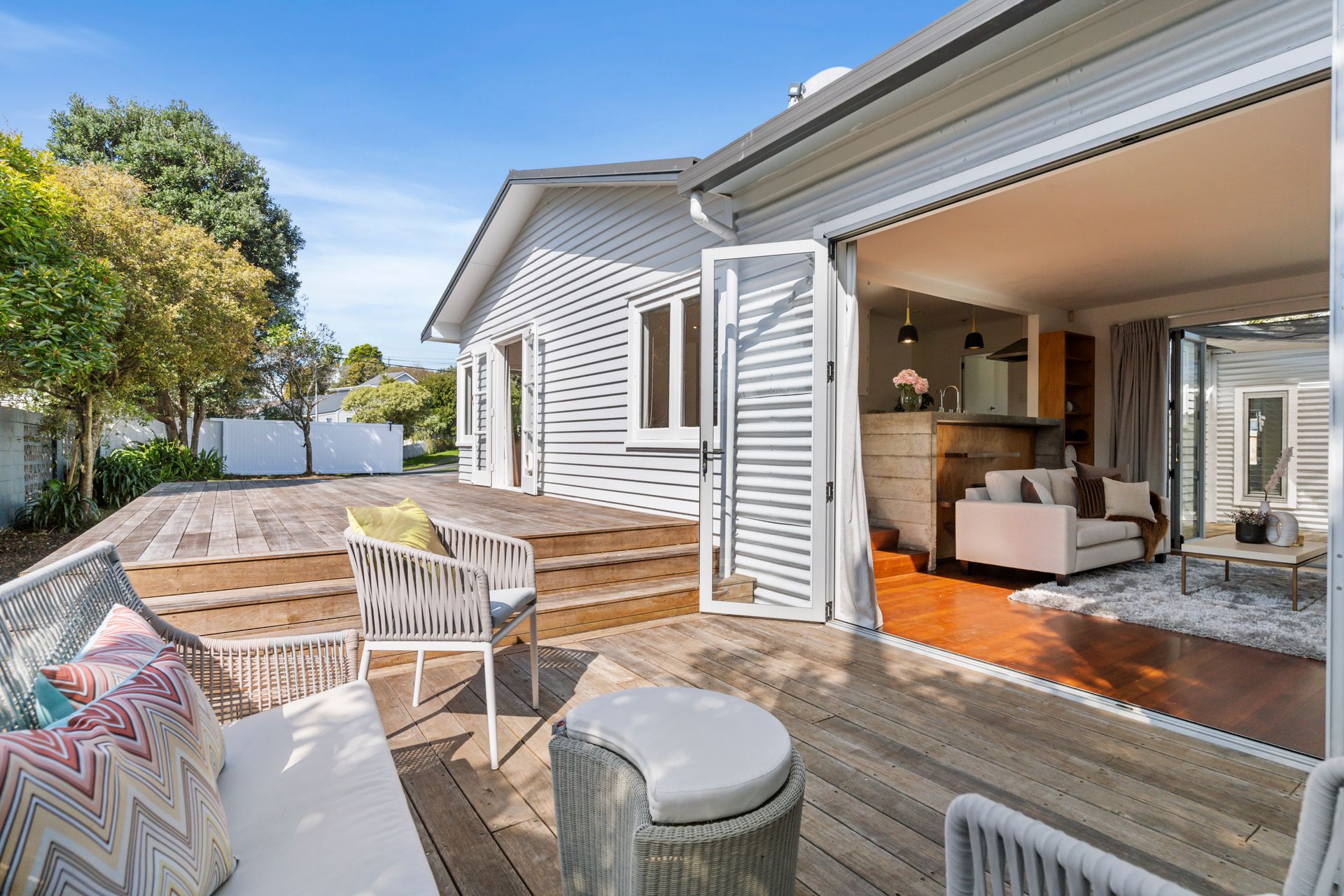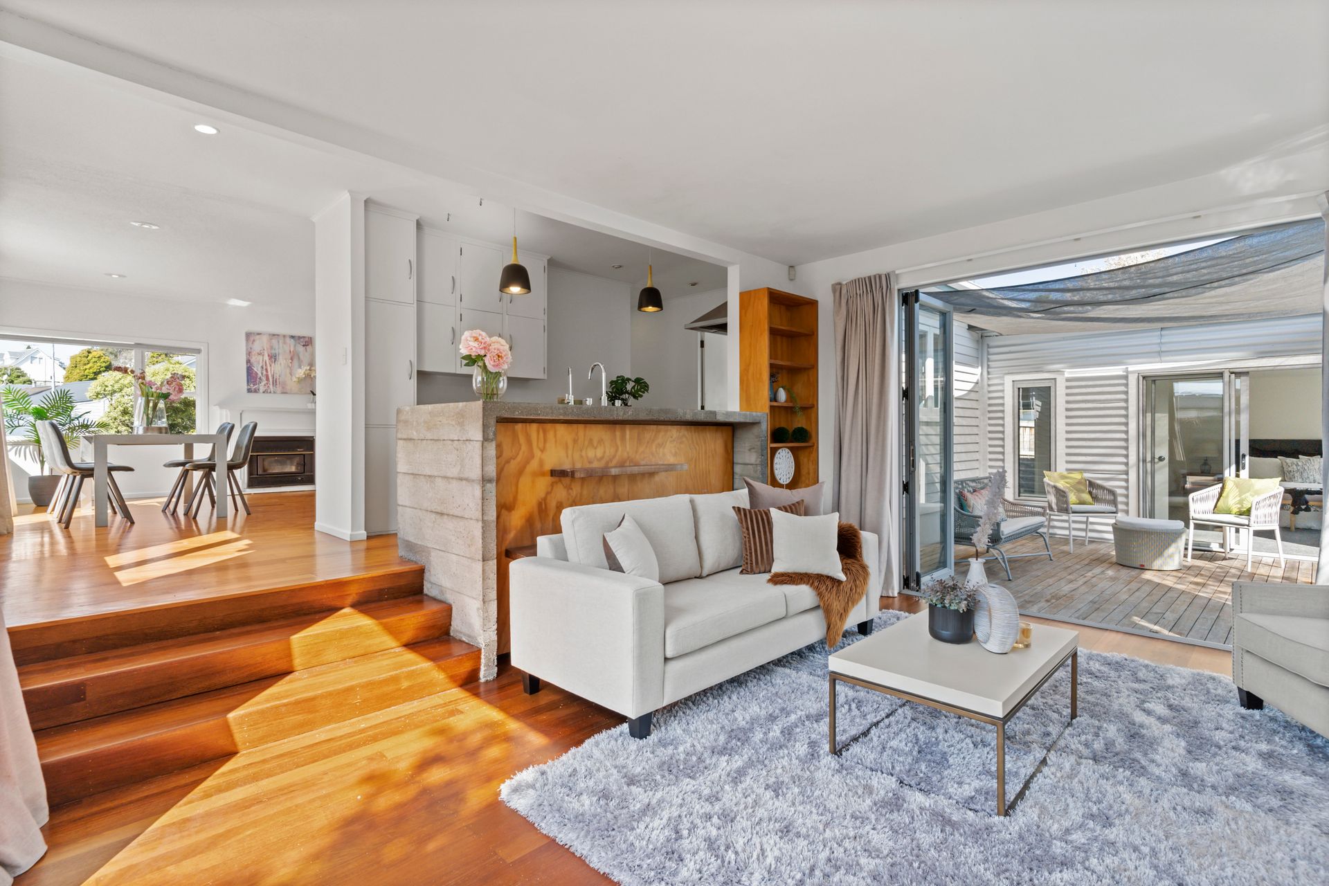 - Open plan kitchen/lounge area with newly polished floors, flowing onto a private deck.