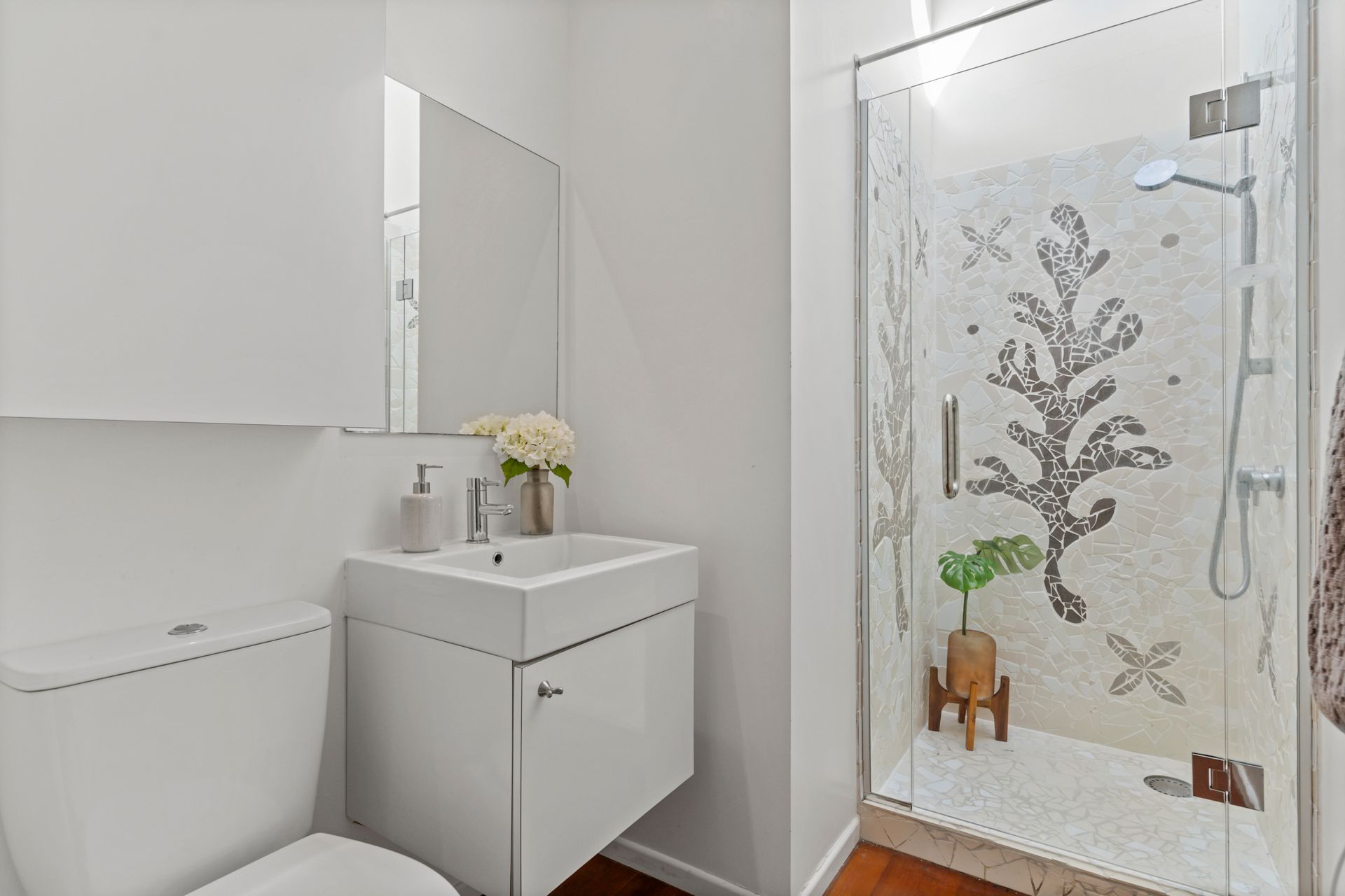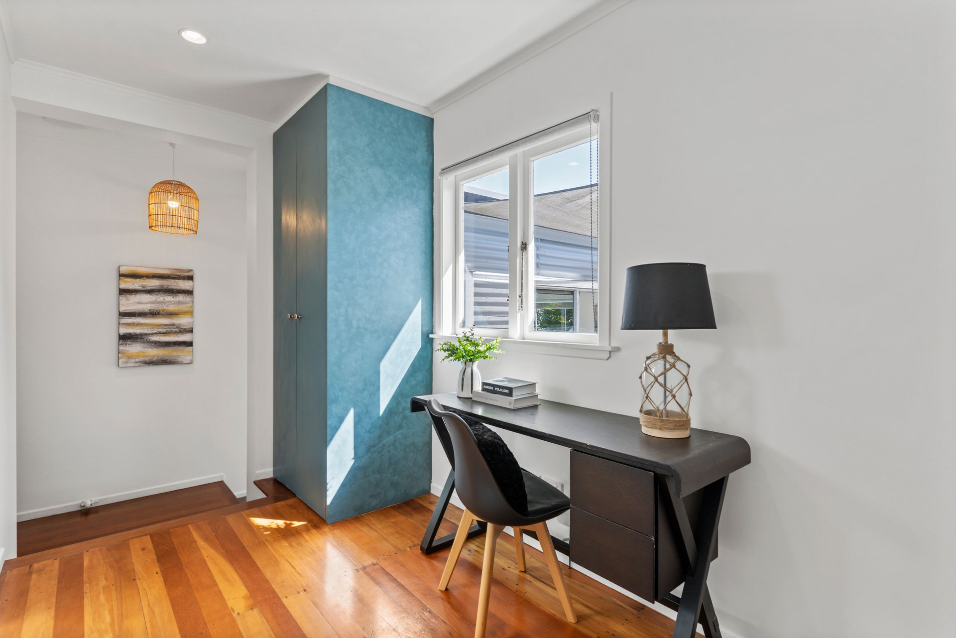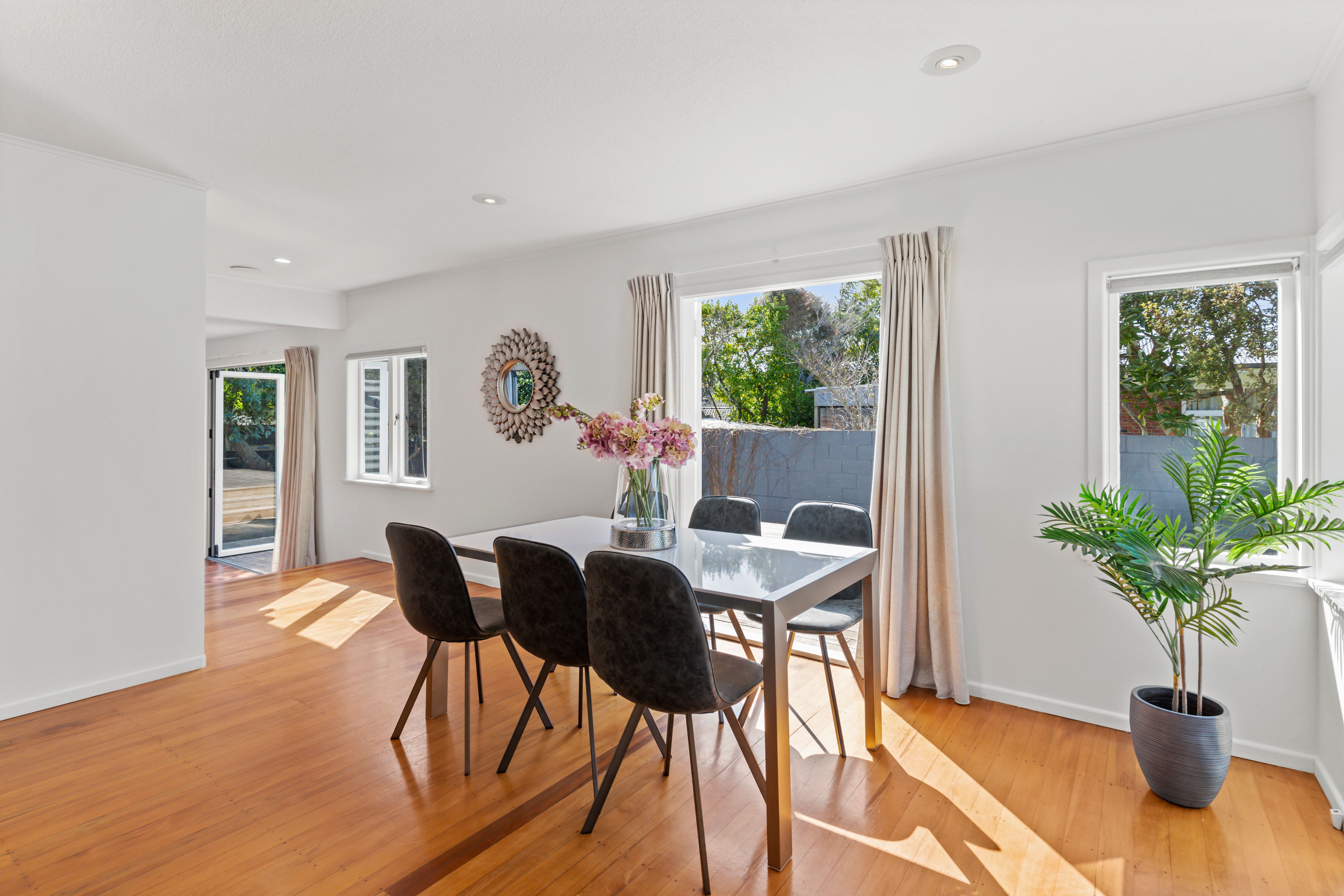 - Open plan kitchen/lounge area with newly polished floors, flowing onto a private deck.