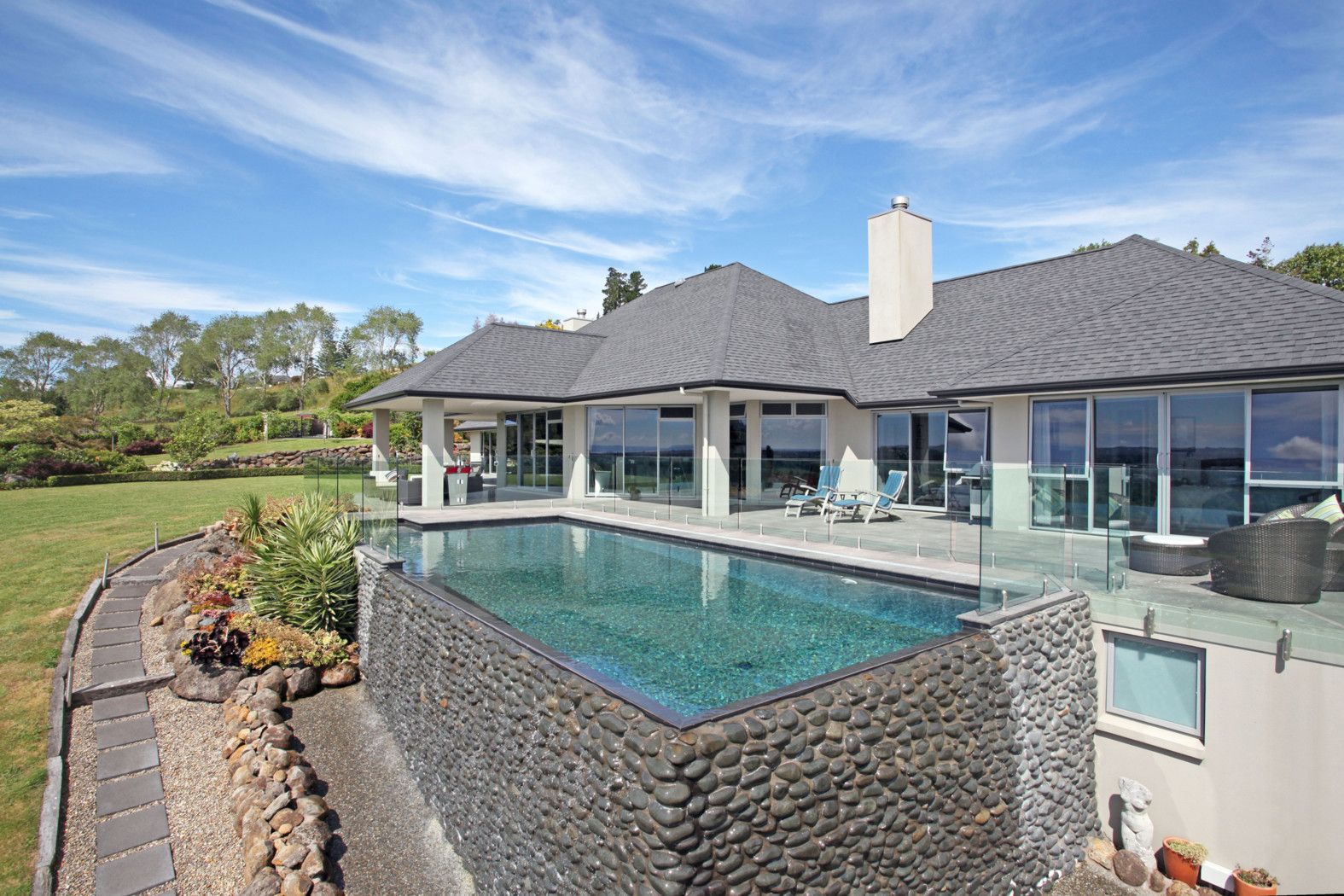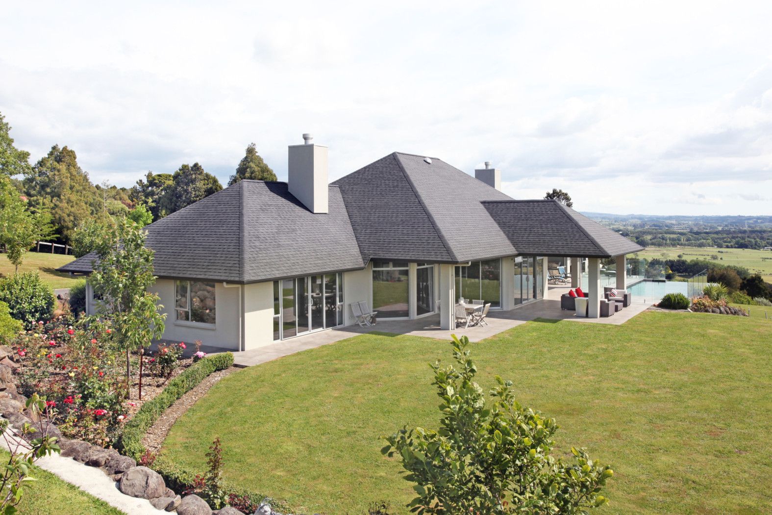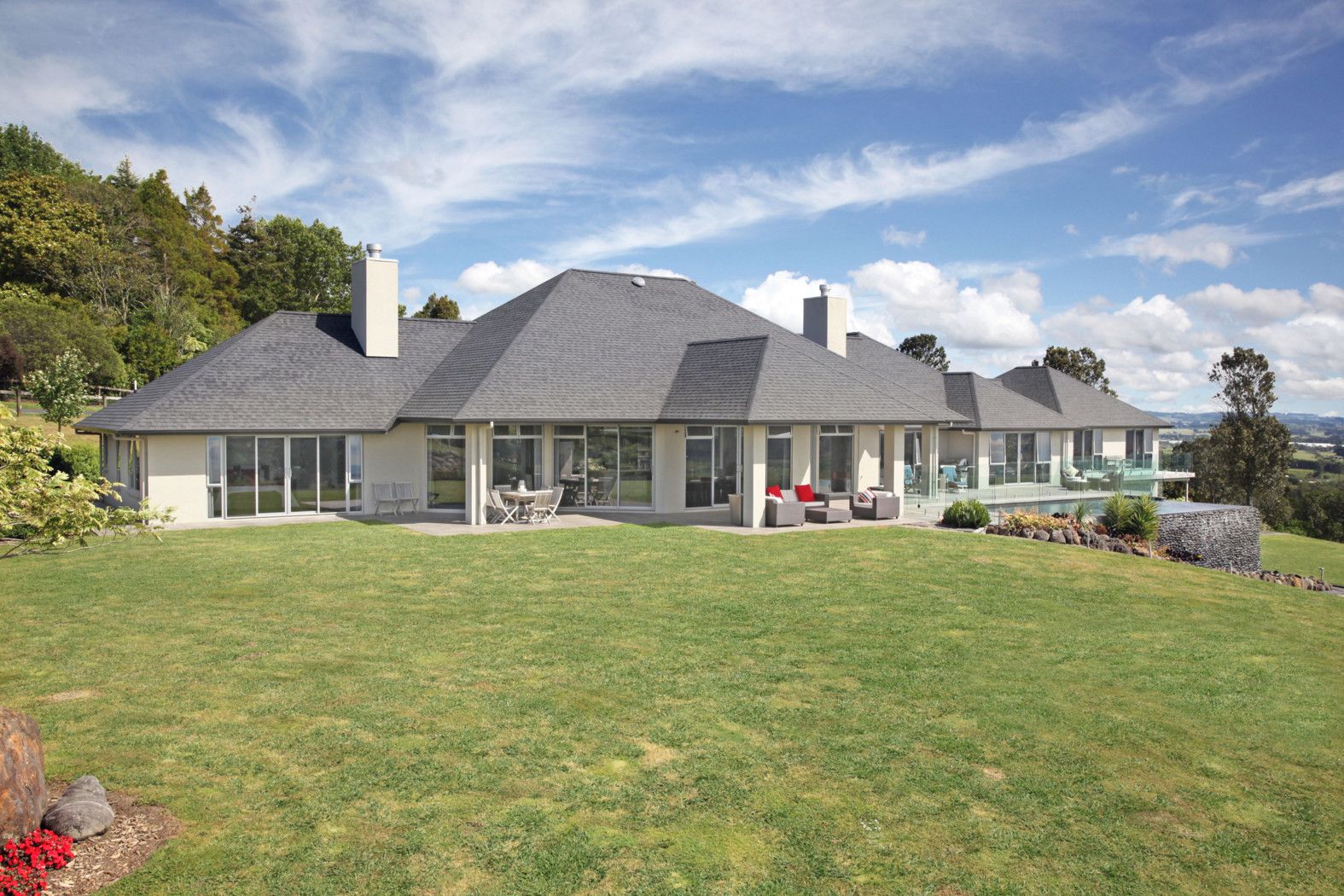 'High View' was designed to offer seamless indoor/outdoor flow to formal gardens and entertaining nooks with all-weather loggia, a superb infinity pool and changing facilities plus a children's play area with Wendy house.