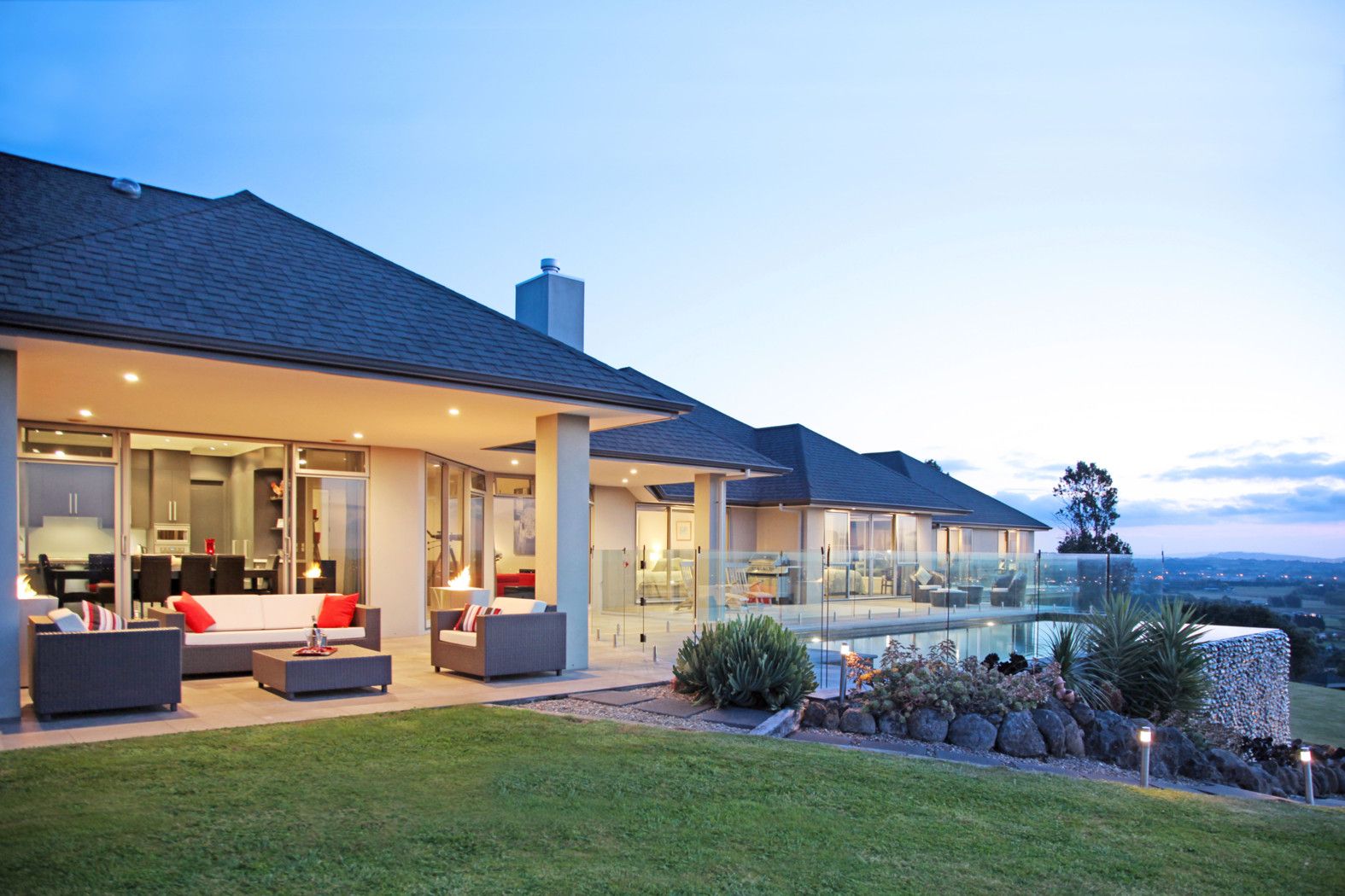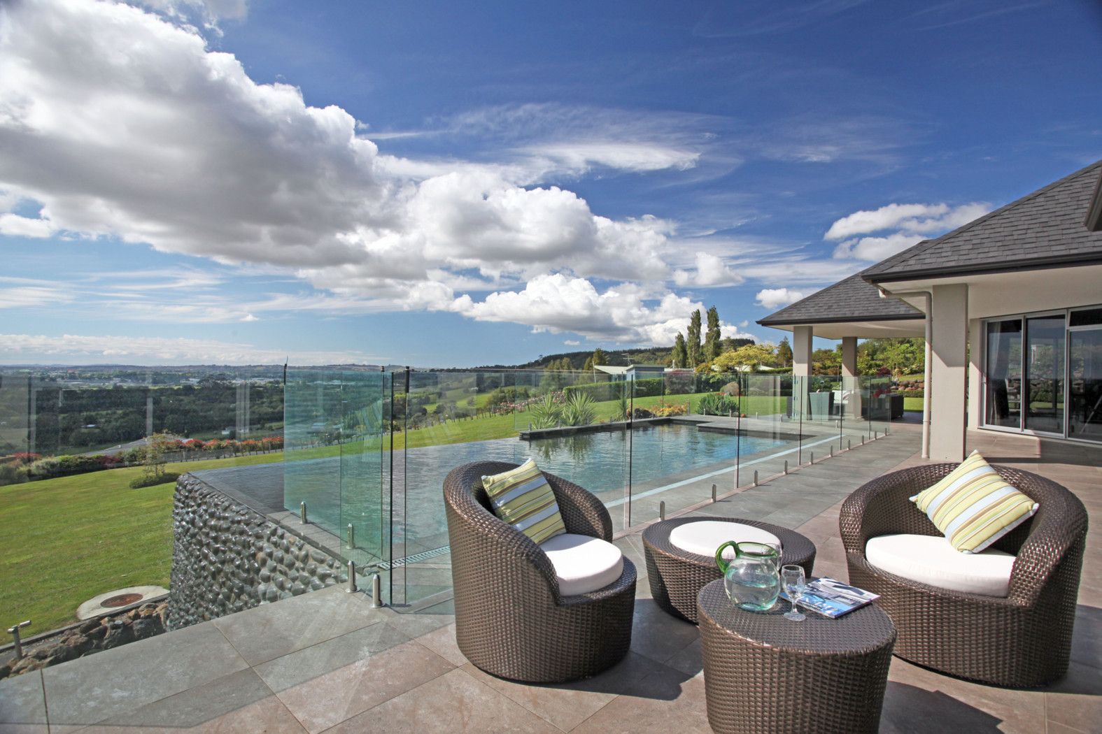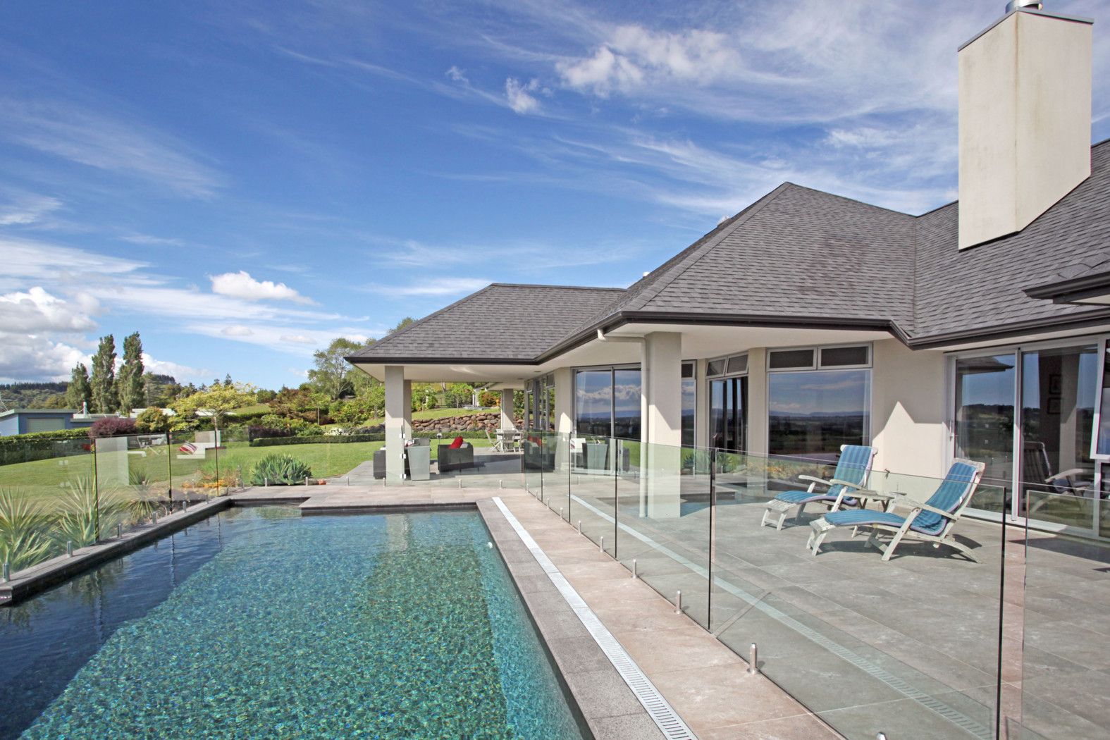 'High View' was designed to offer seamless indoor/outdoor flow to formal gardens and entertaining nooks with all-weather loggia, a superb infinity pool and changing facilities plus a children's play area with Wendy house.