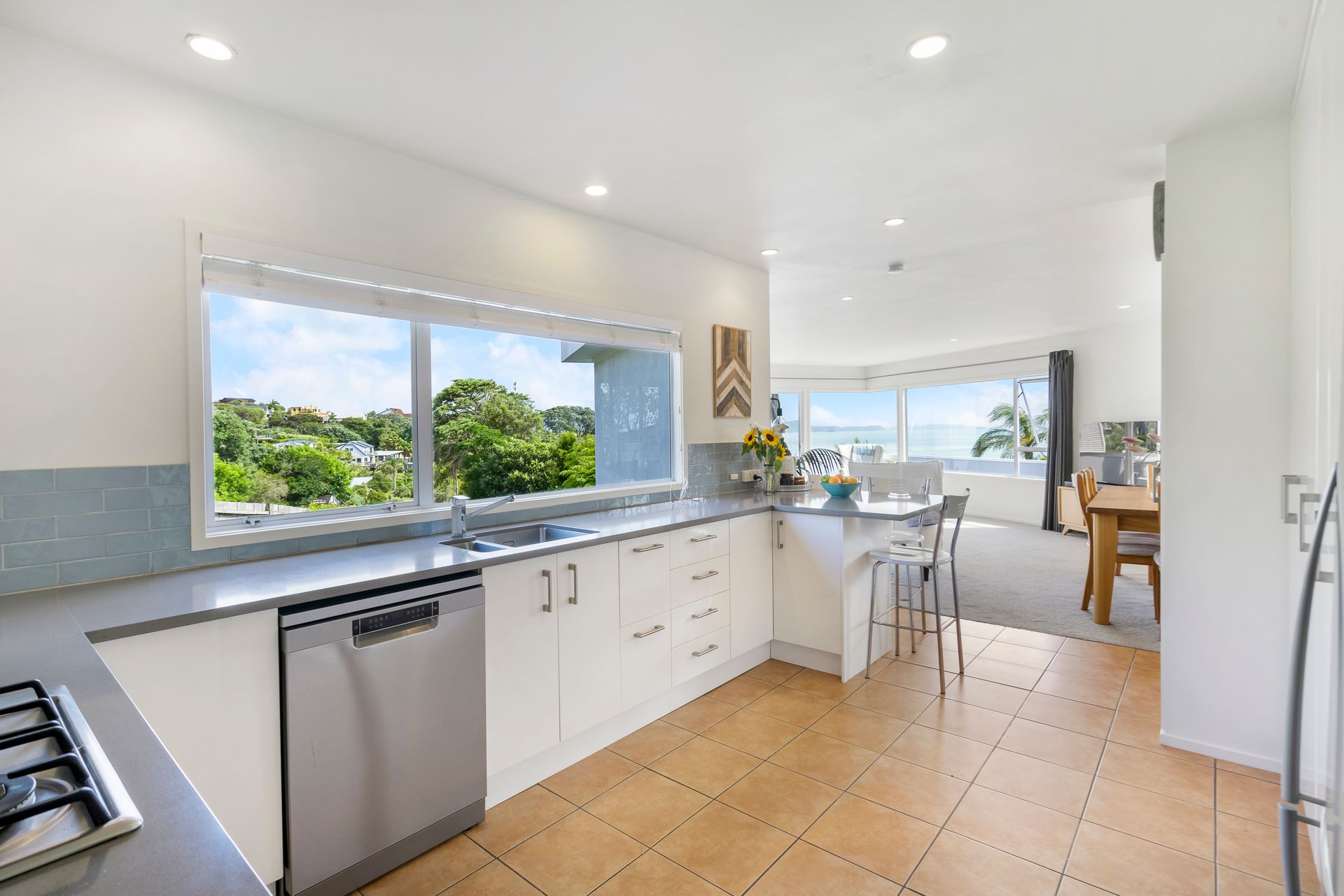 - Semi-open plan kitchen/dining/living with huge picture windows and ranch slider access to the entertaining deck