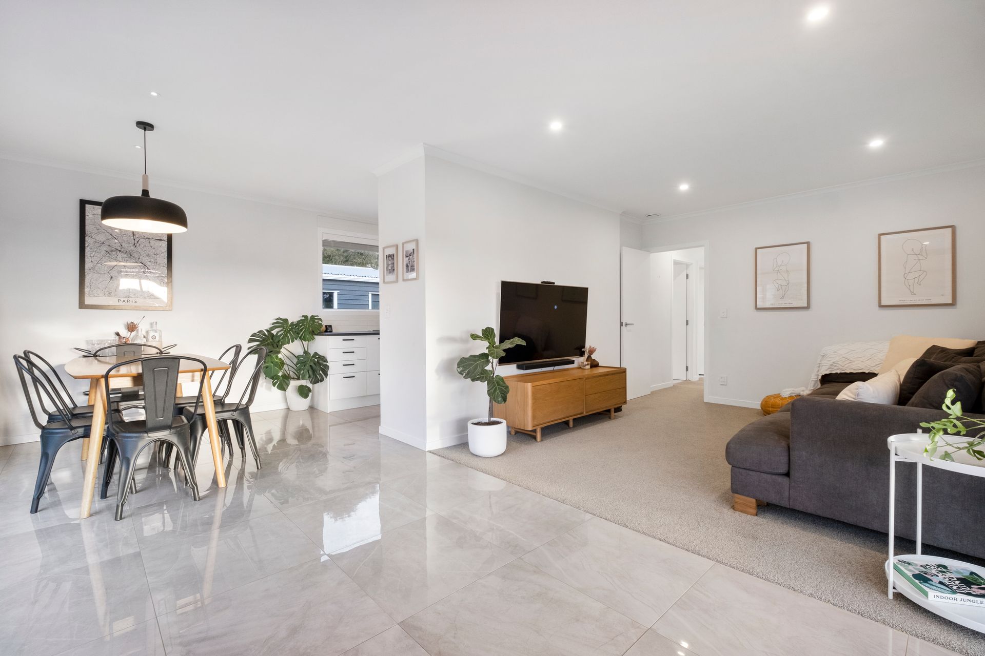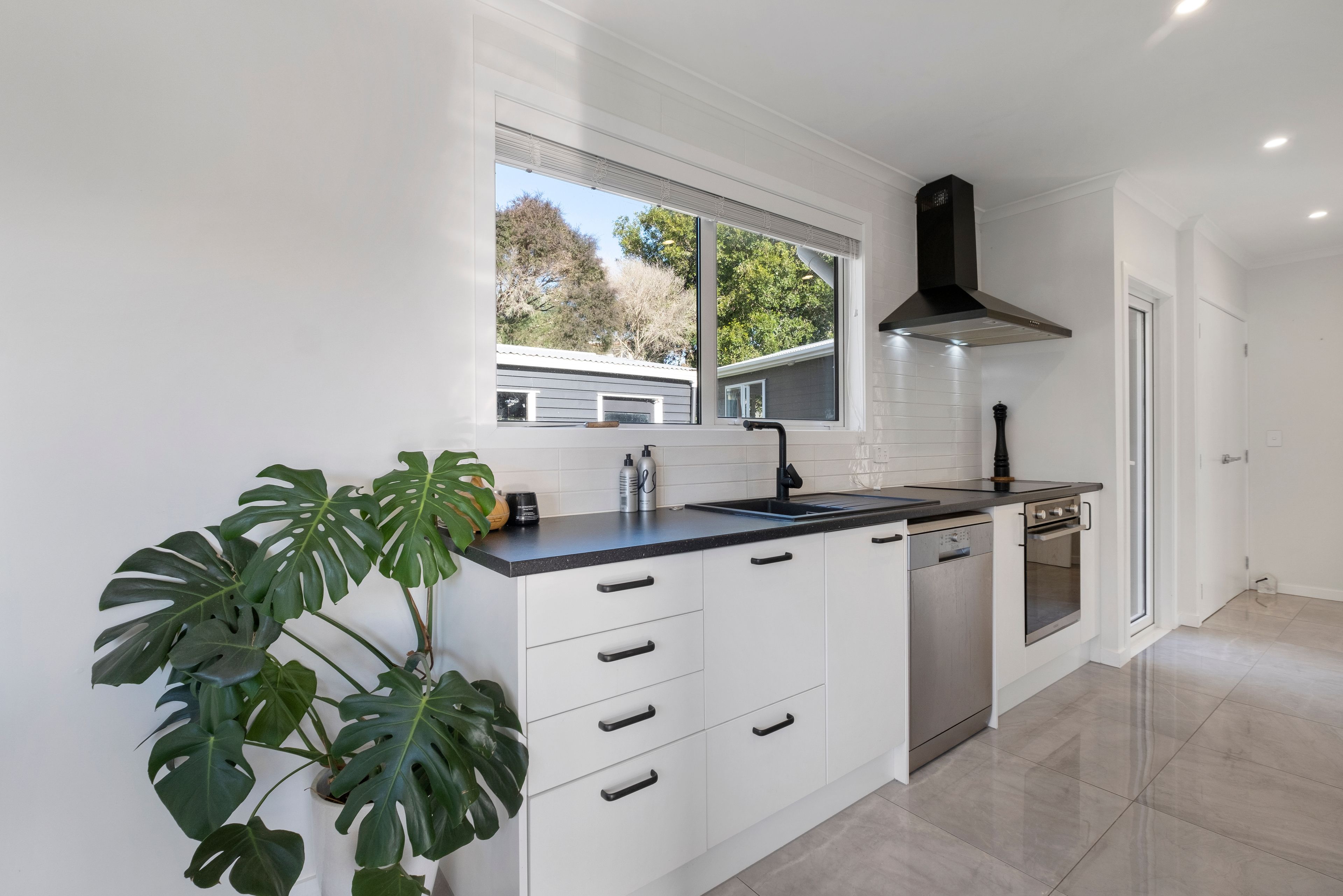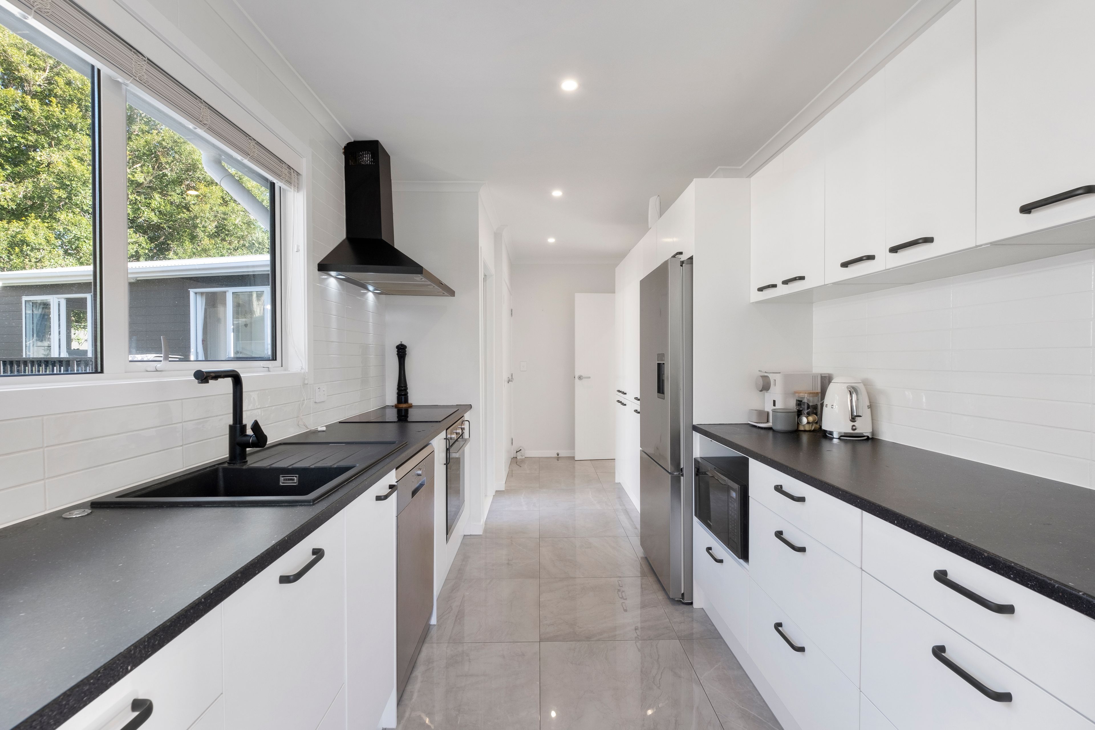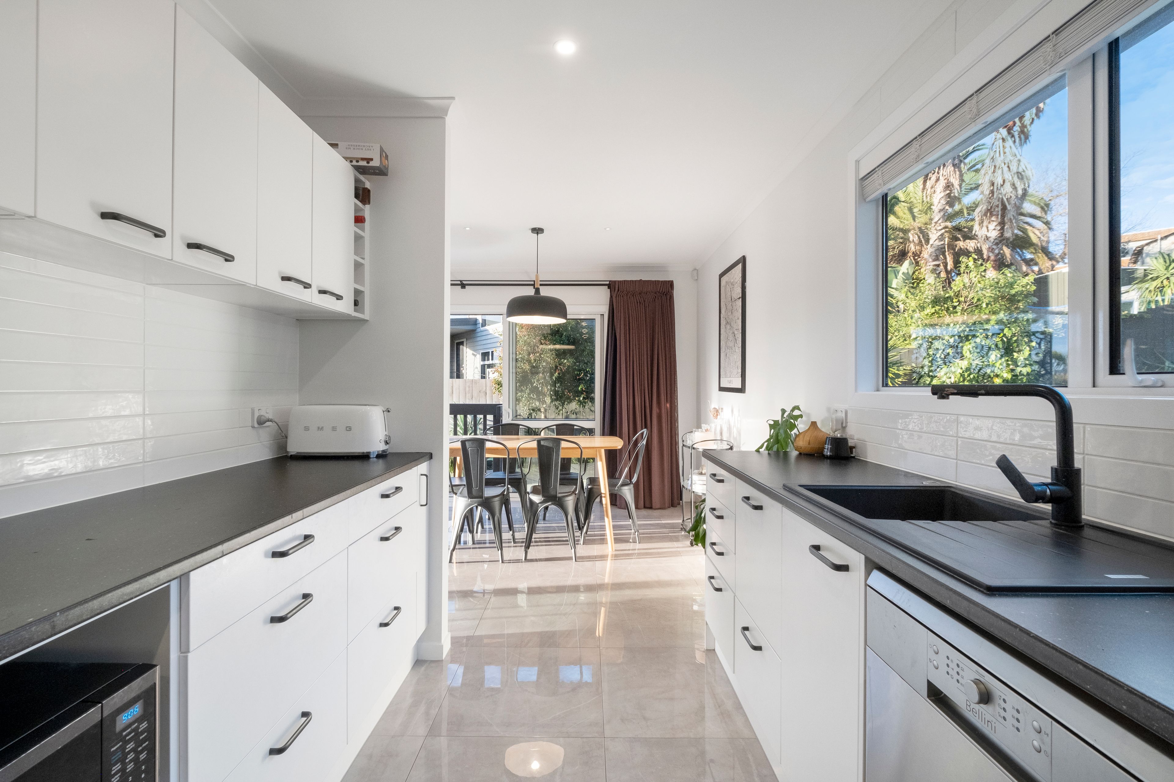 - Gorgeous galley style kitchen and adjacent dining area featuring high gloss tiled flooring and a cool black and white palette