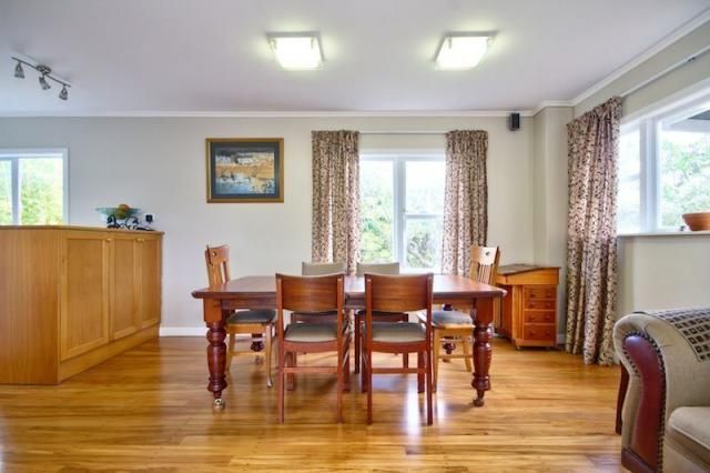 This house has a large double garage and parking for a small boat. Upstairs there is a wrap around deck with fold away curtains so it can be used all year around, entertaining areas, a small office area and a single bedroom. Downstairs is the main bathroom which has been recently renovated, a single bedroom along with the master bedroom and ensuite.