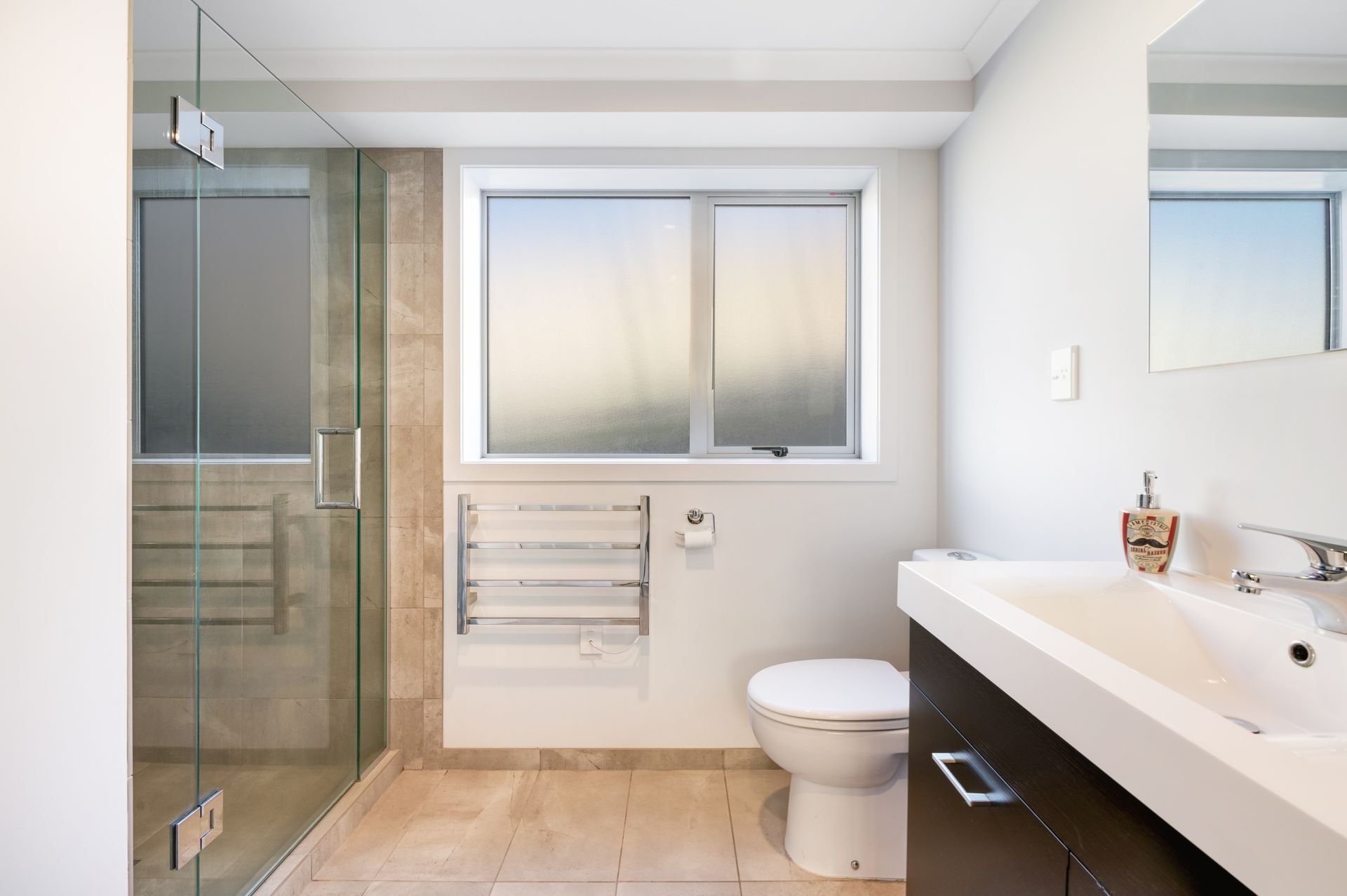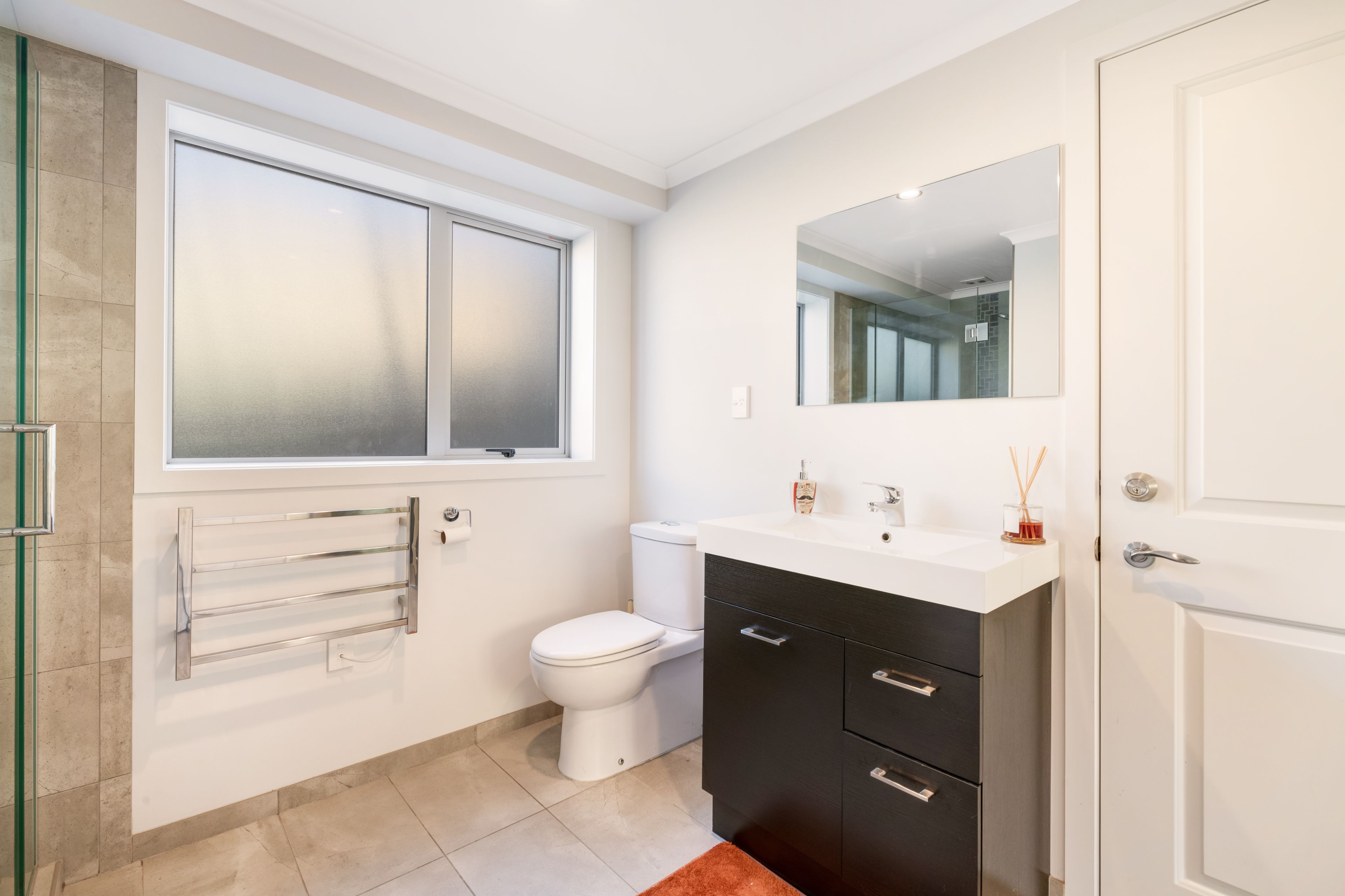 • Modern bathroom with fully tiled shower and heated towel rail