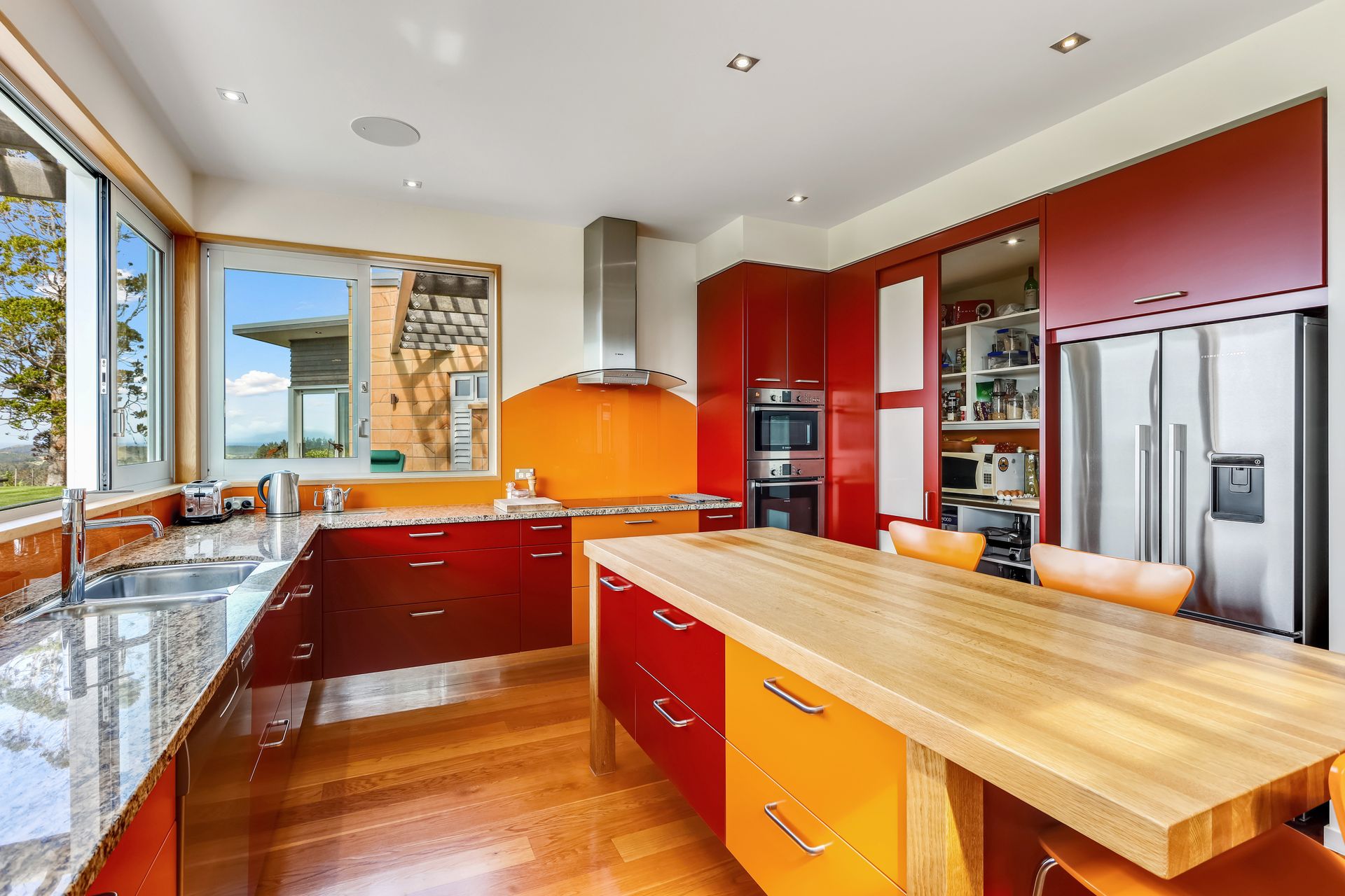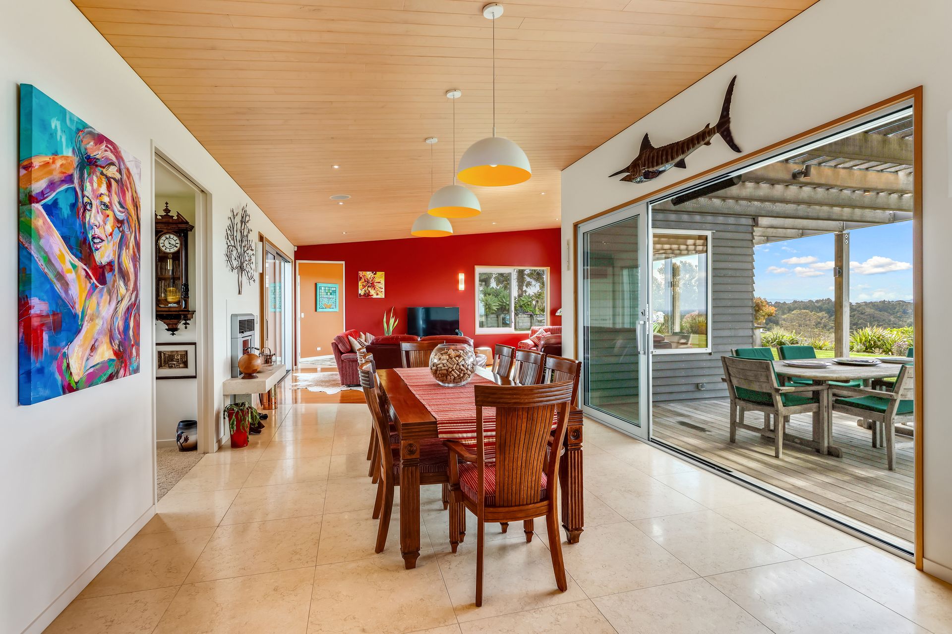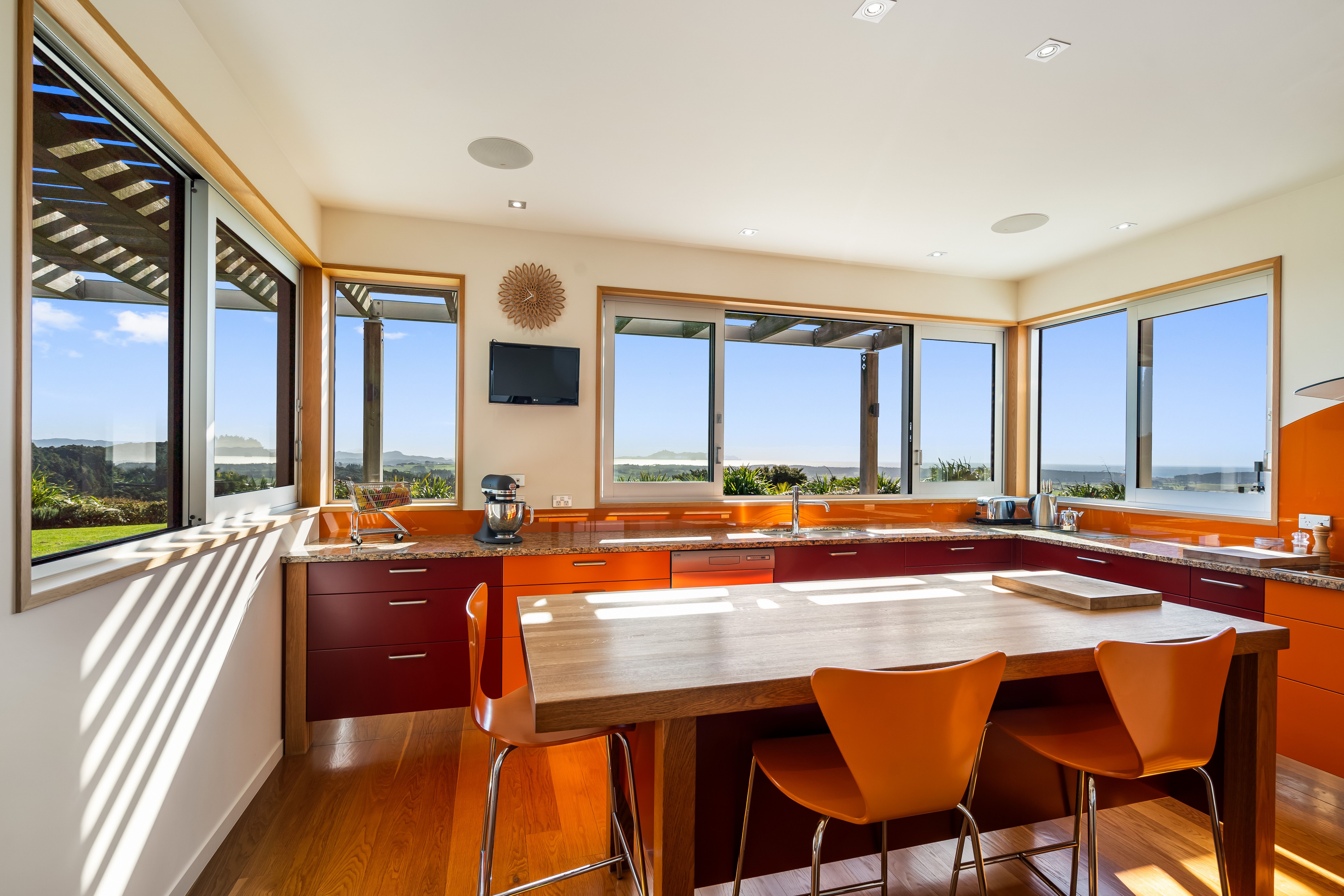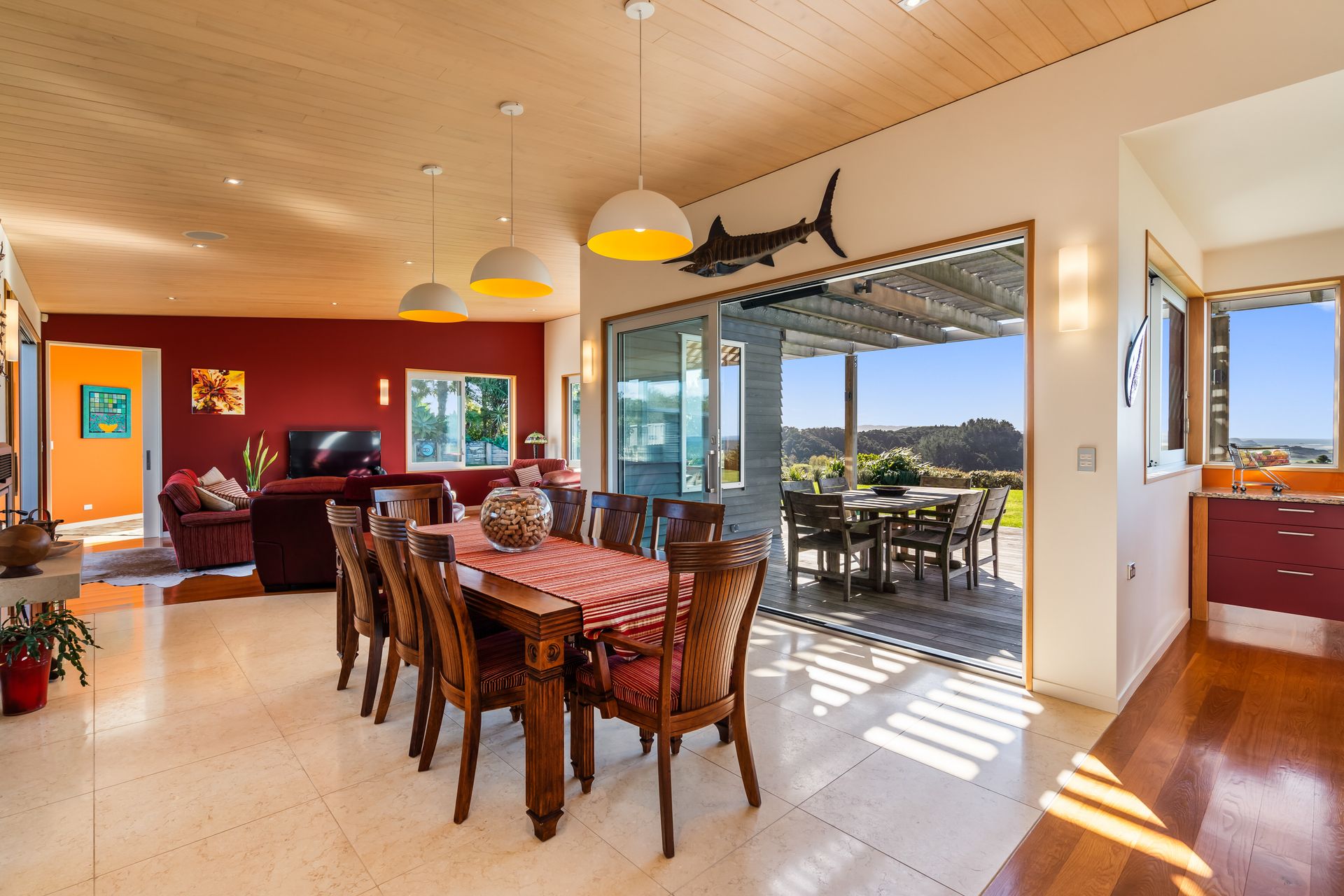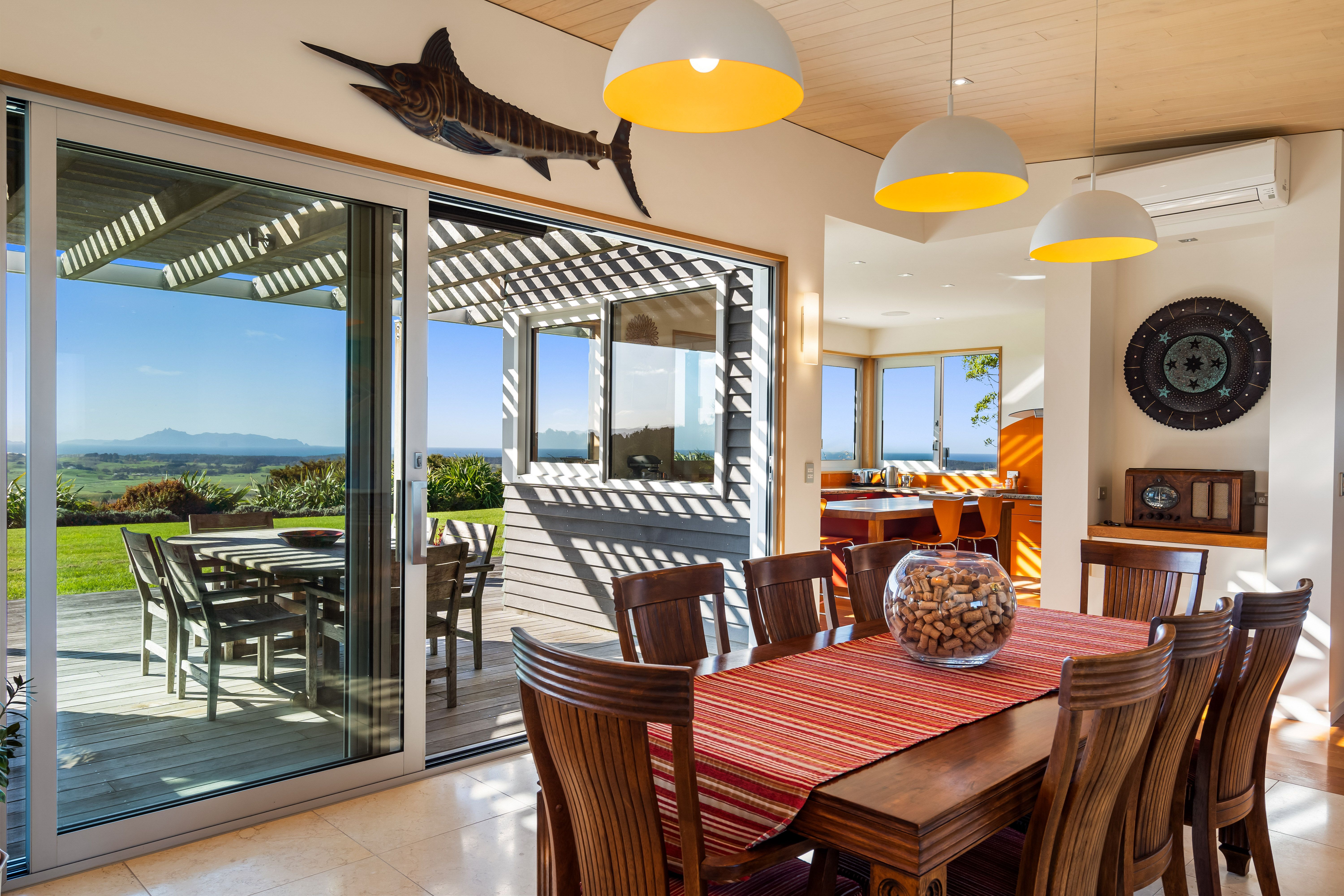 This thoughtfully designed home with large living, dining and external entertaining areas feels seamlessly connected to the natural world, and the ever-changing ocean outlook from the bespoke, warm-hued kitchen invites guests to delight in the detail of the butler's pantry, solid oak island and 'floating' cabinetry.