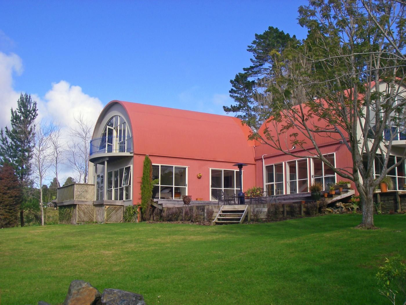 Two cleverly designed half round barns fused together to create this fabulous spacious and light filled home that offers an intriguing twist at every turn. Open living which opens onto sunny decking where one can soak up the most amazing rural vista. Cosy mezzanine lounge, again sunny light filled and spacious.