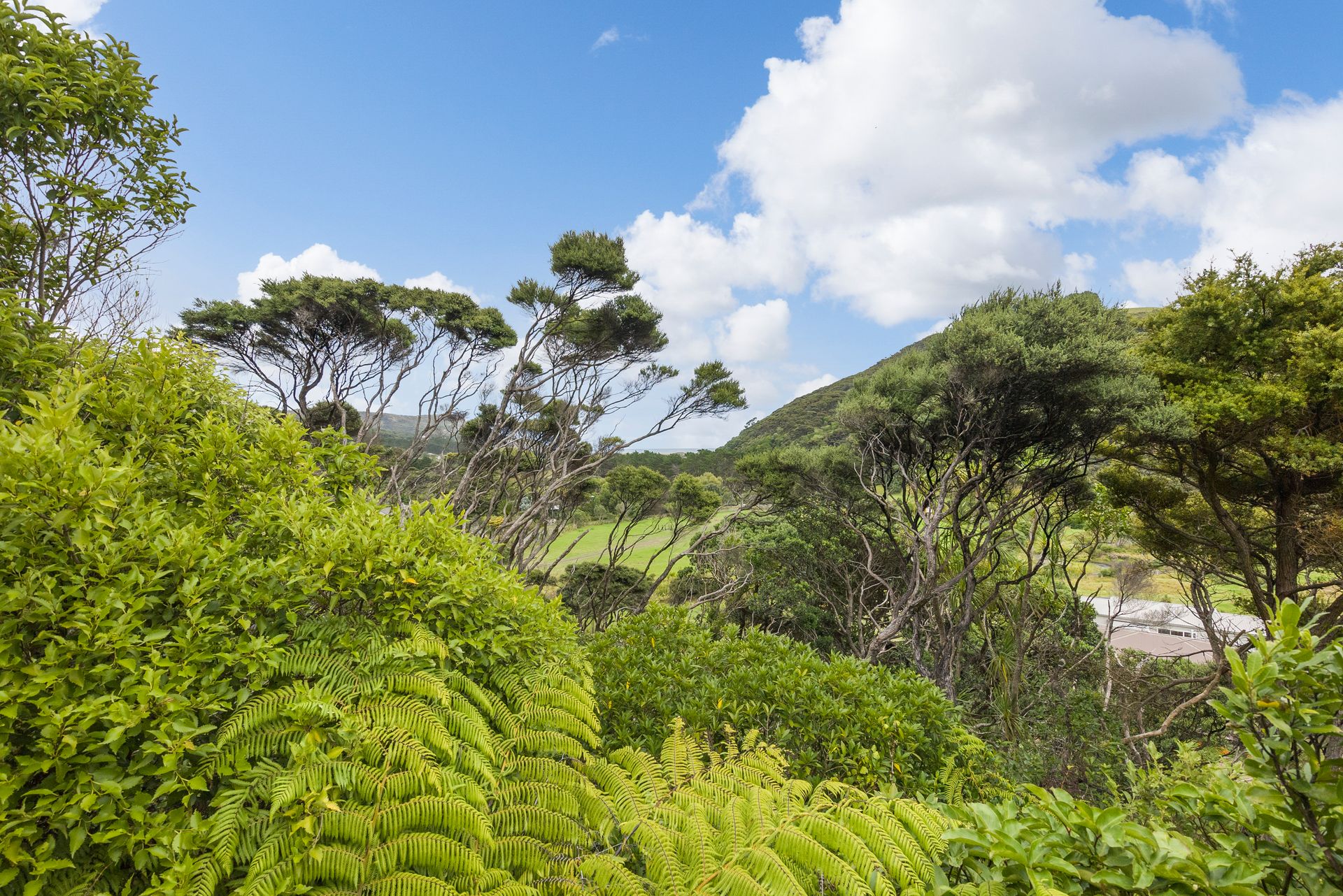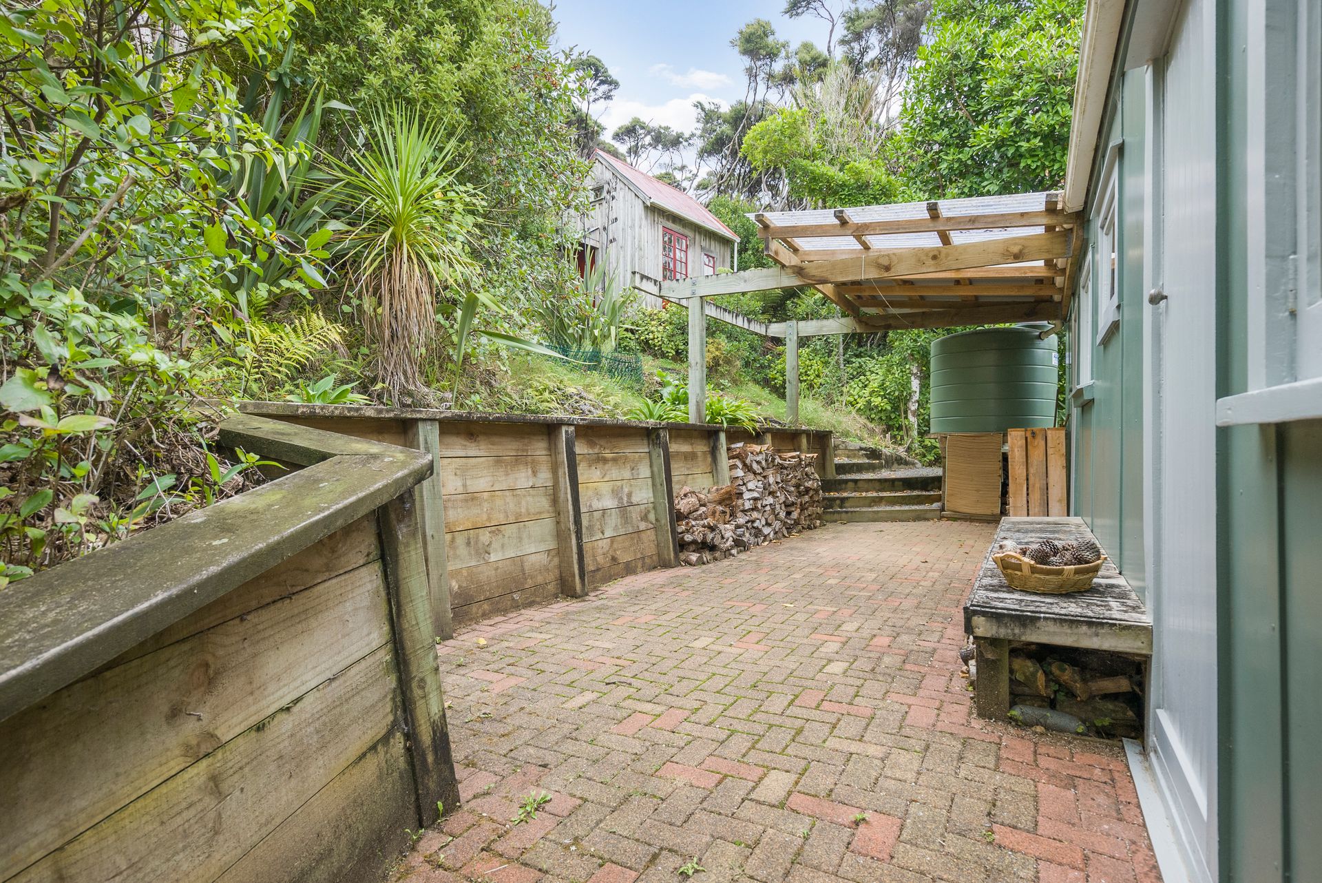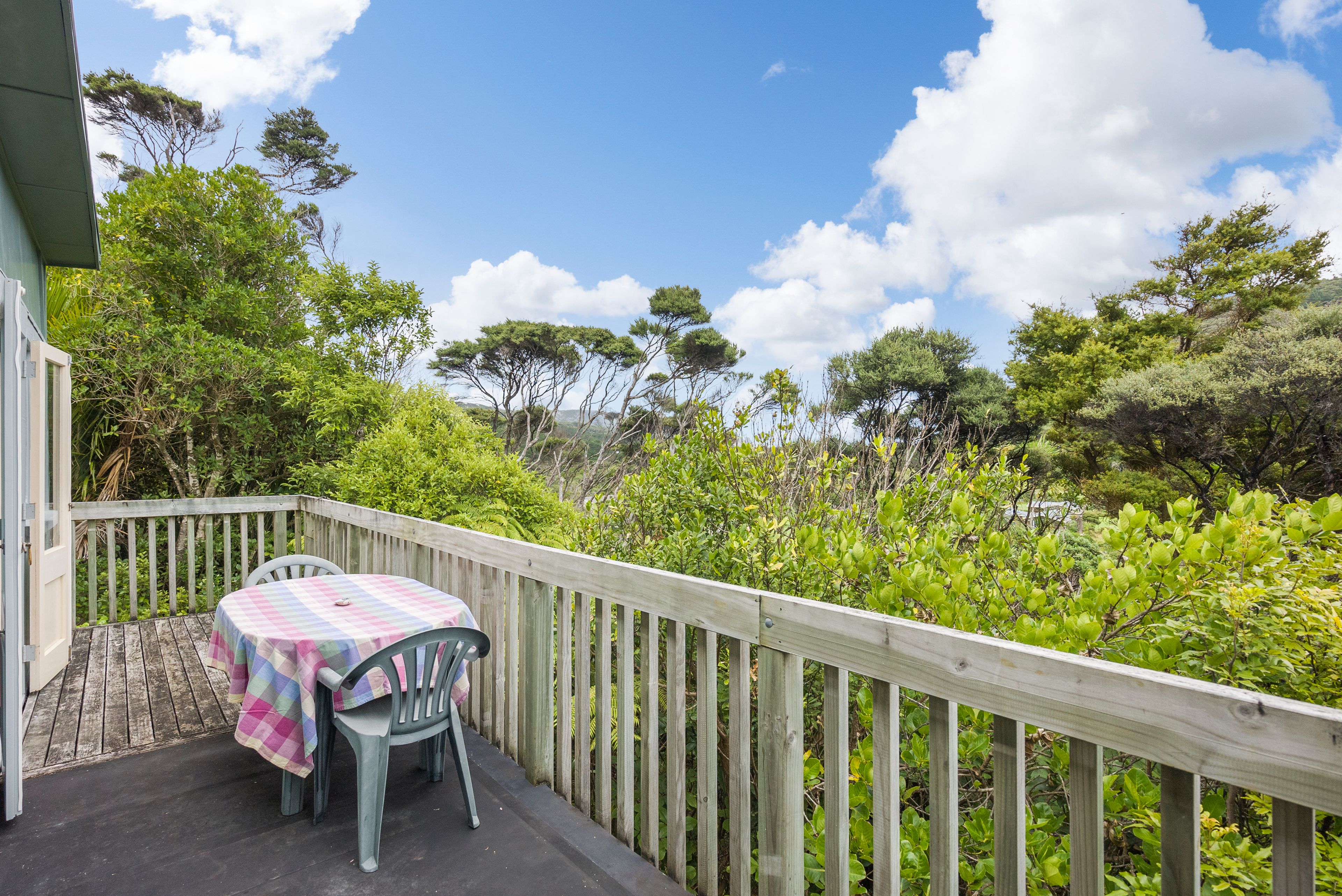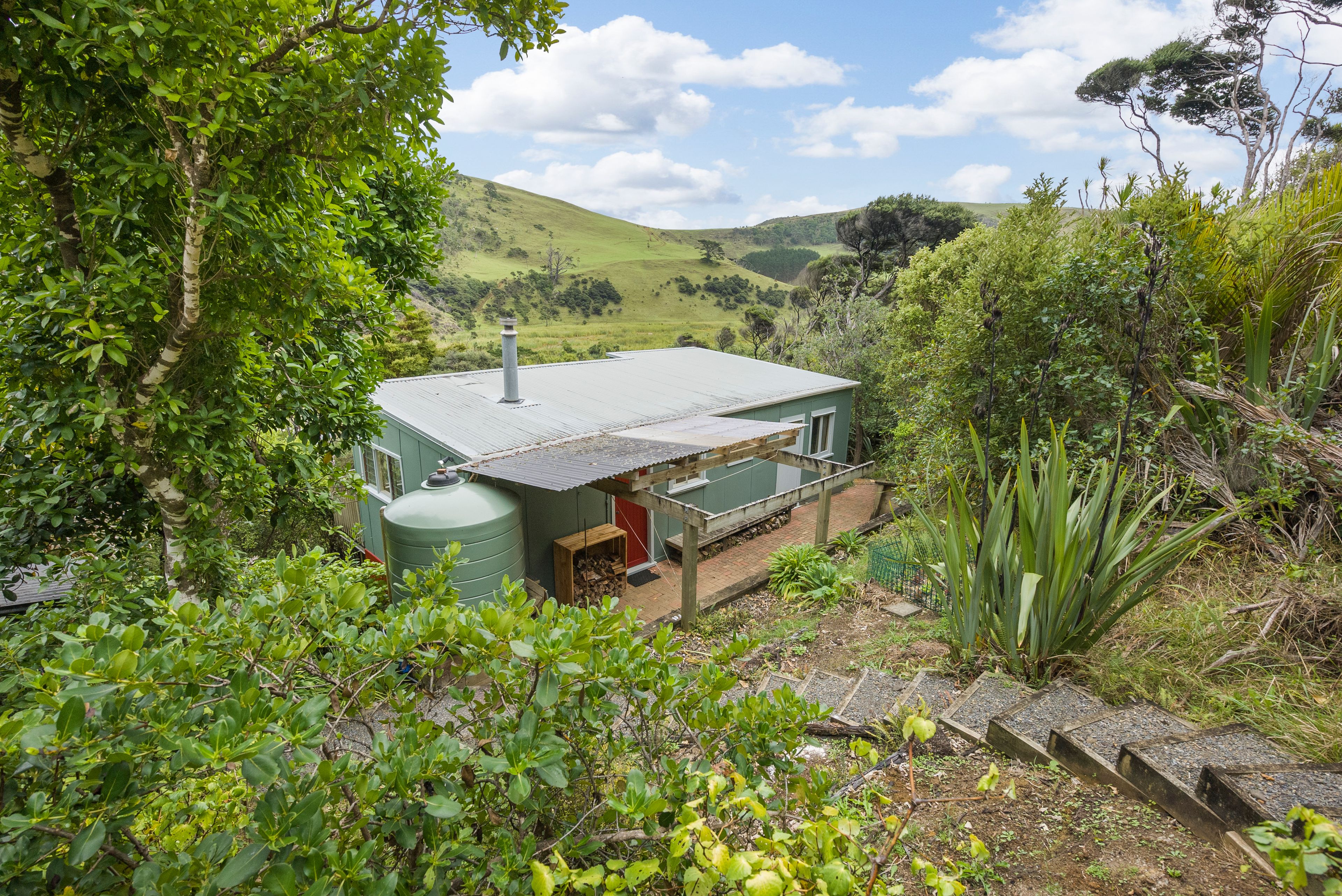 The home itself currently offers two bedrooms upstairs alongside the open plan living space, where you can catch the view via multiple windows and French doors, a basement bedroom and a shower room add extra space, while a Studio/Sleepout at the back of the property creates an extra guest room, work-space or an artist's retreat. The home is serviced by a detached, yet professionally fitted long drop.