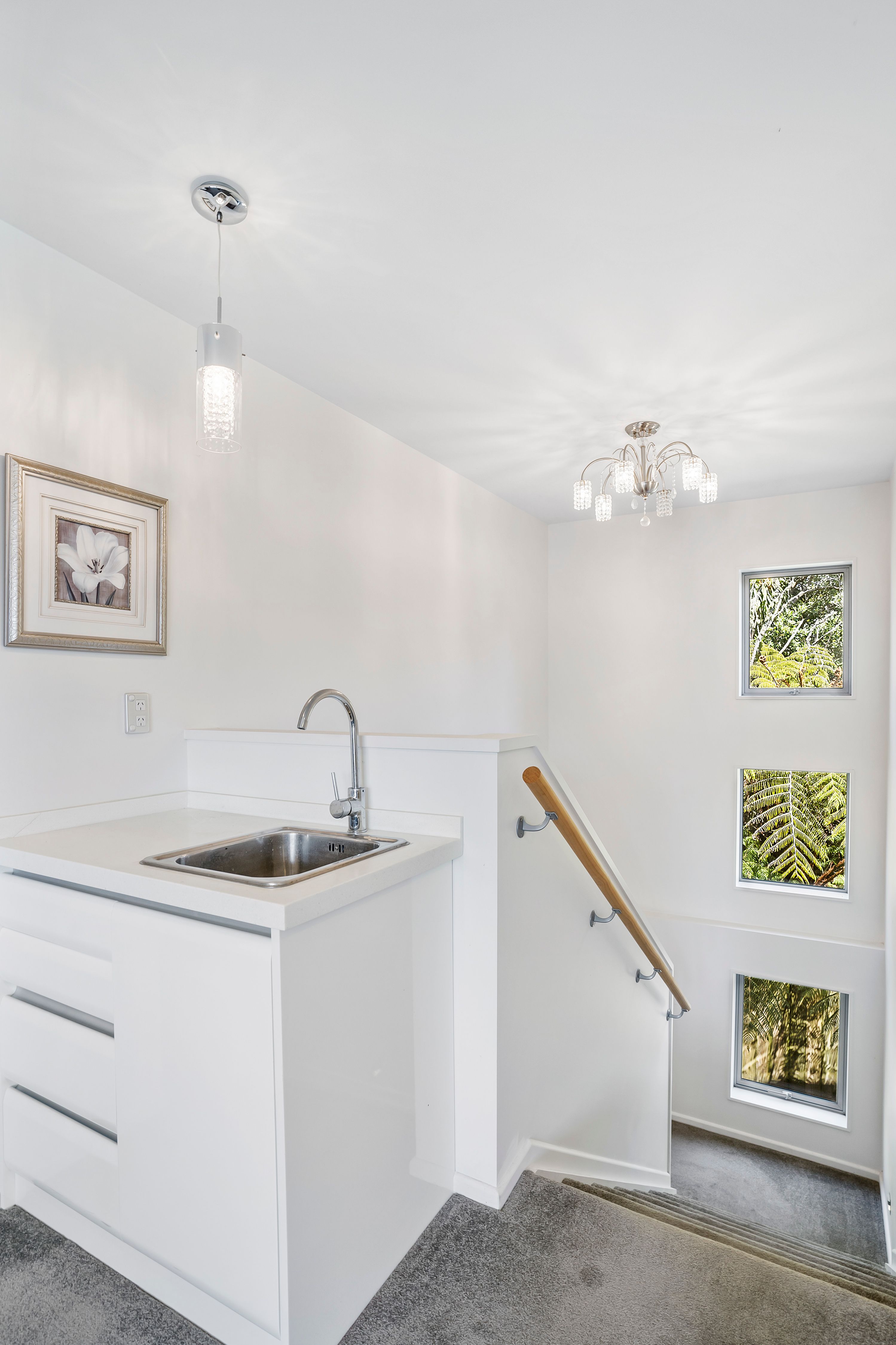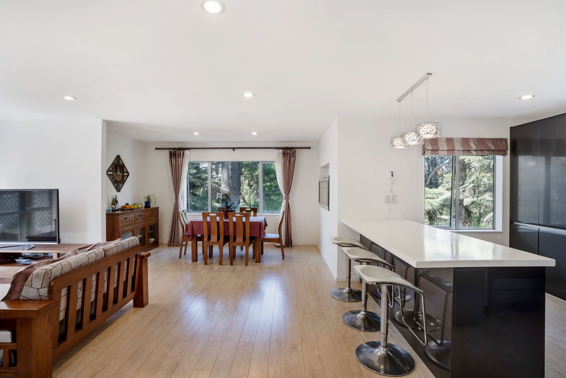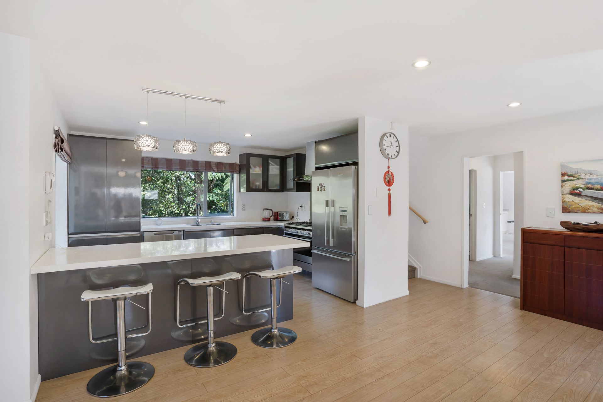 The middle level offers all the family living, designer chefs kitchen, dining and family space which flows seamlessly to the outdoor area.
