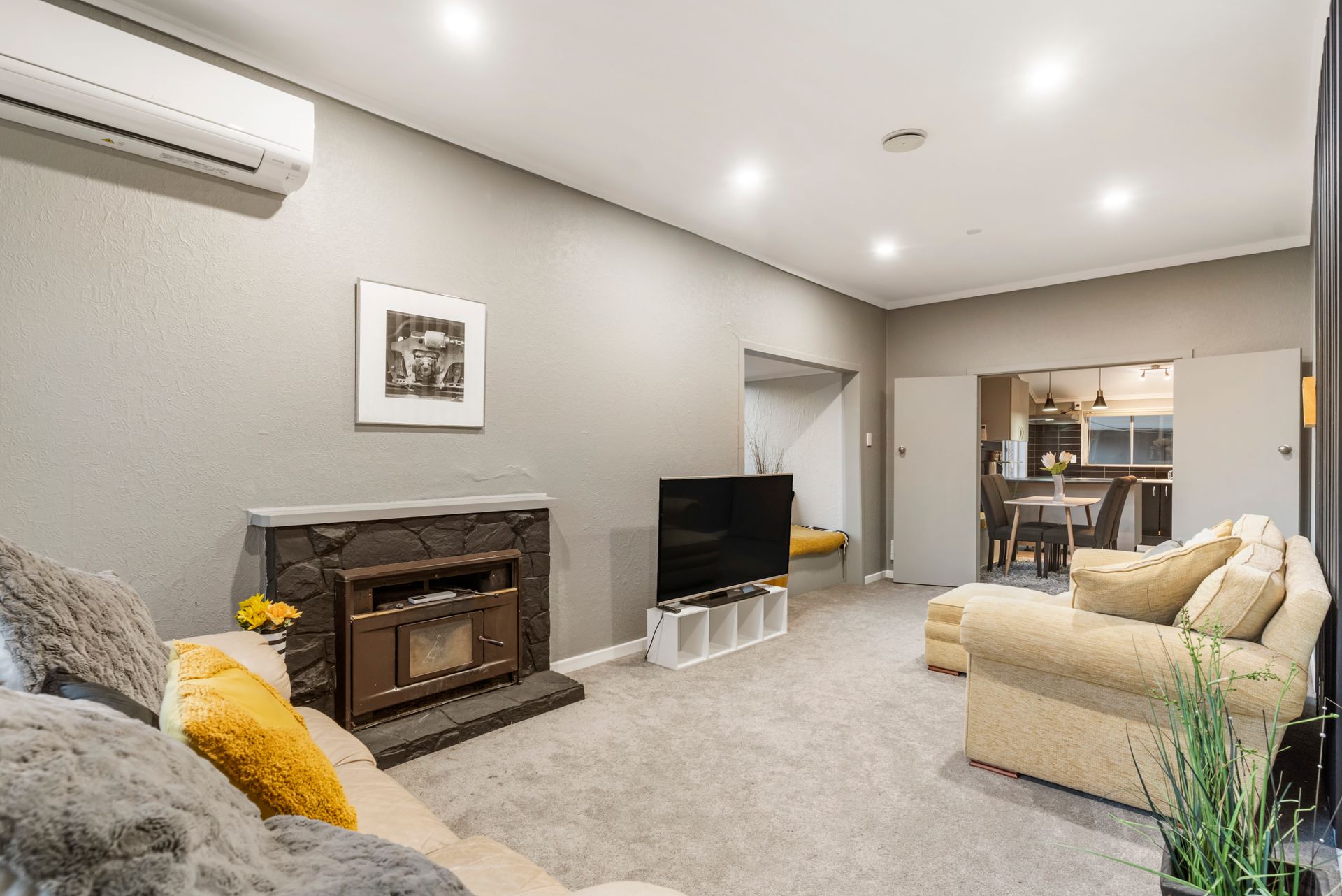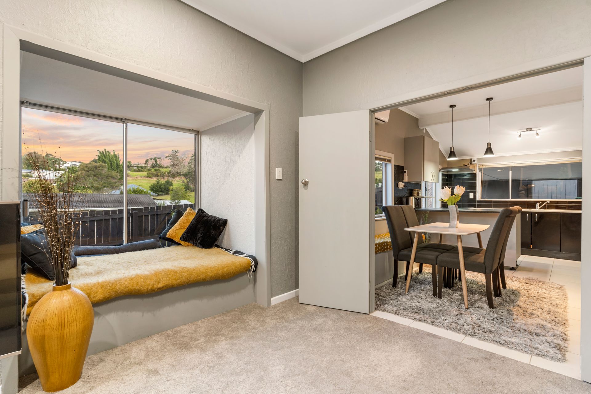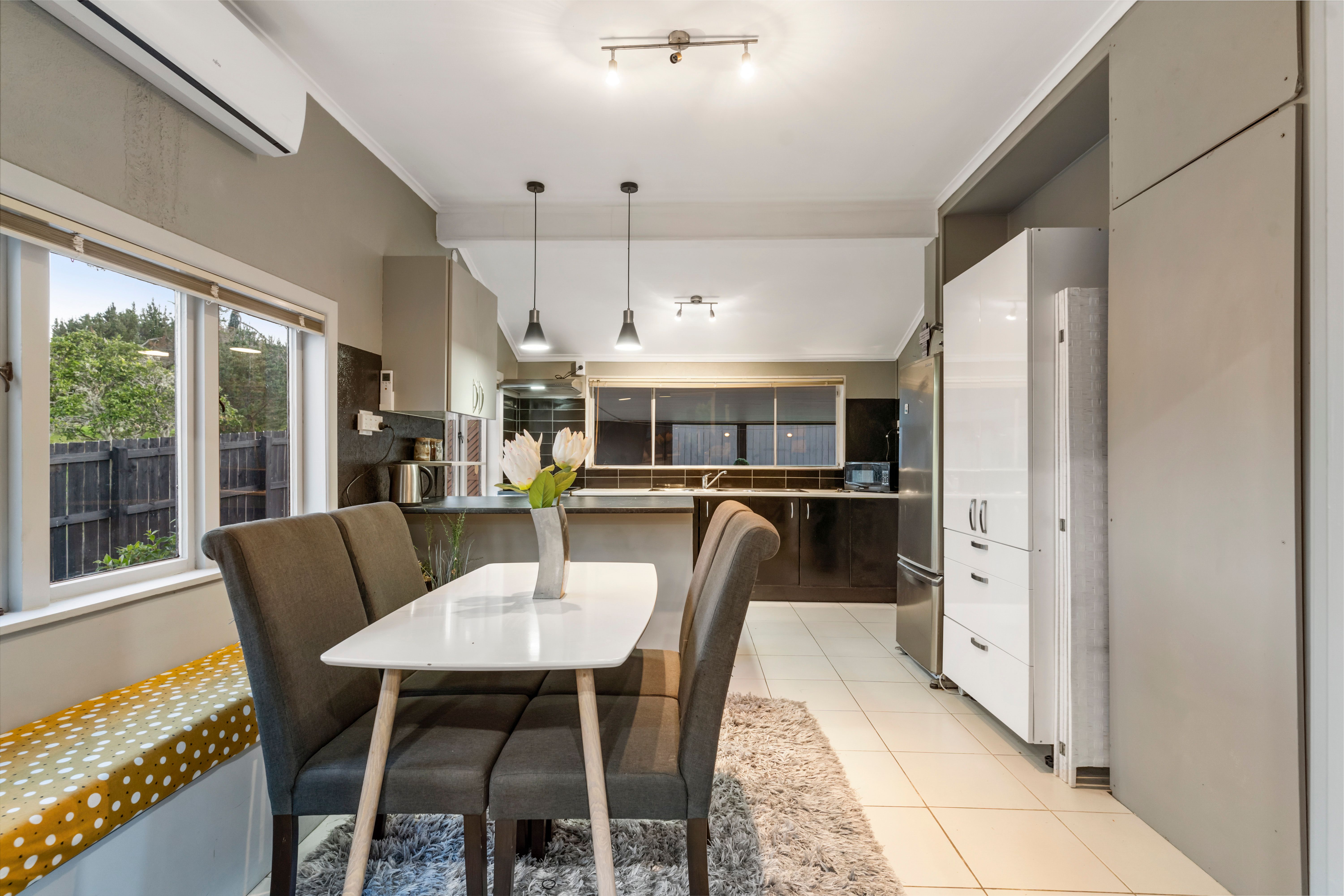 The open plan kitchen/dining is bathed in light creating a space that is bright and comforting. Complimented by modern features and plenty of cupboard space, the kitchen connects seamlessly with the family dining area and flows through to the living room. Catch your breath as you gaze out the large window featuring a built-in window seat with a view of the rolling hills. This space is cozy and inviting offering a heat-pump and a fireplace.